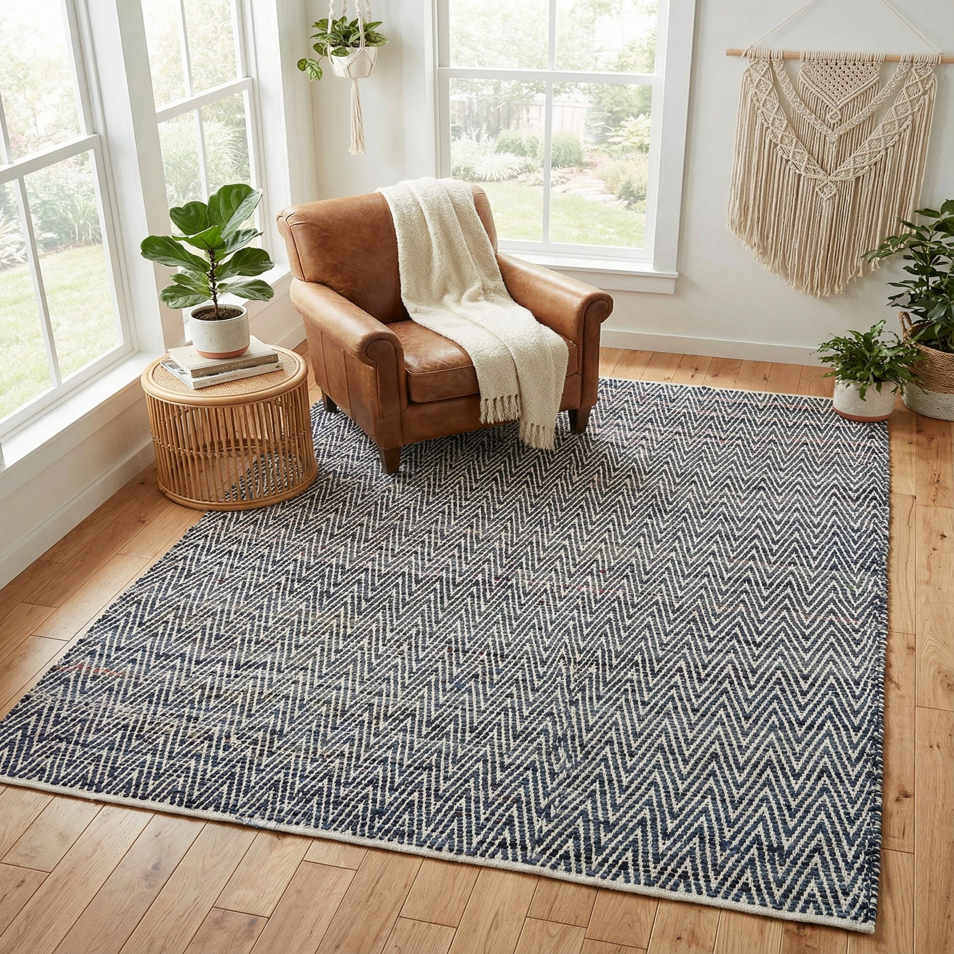 Hand-woven from 100% cotton, this flatweave rug features a tight chevron motif in bold black and white. The narrow zigzag pattern creates a rhythmic, graphic surface that reads clean from a distance and reveals a tactile woven texture up close. The low-profile construction feels soft underfoot while maintaining a crisp, tailored look.