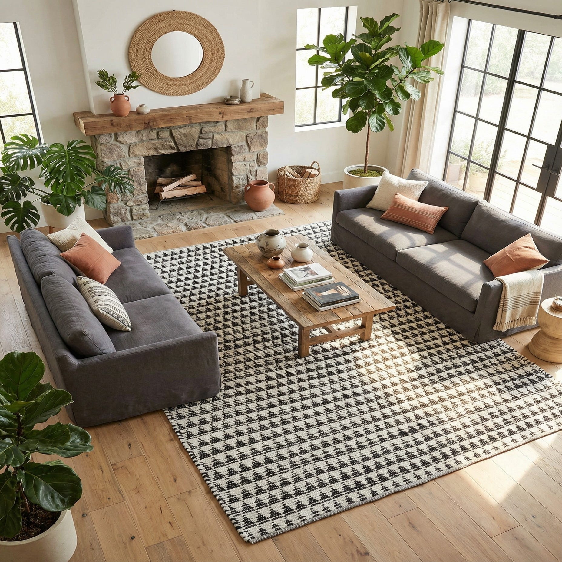 The neutral black-and-white palette makes this piece versatile: place it beneath a coffee table to anchor a contemporary living room, layer it in a bedroom for contrast against light wood floors, or set it in a high-traffic entry or dining area where a low-pile weave is practical. It pairs well with minimalist, Scandinavian, and modern farmhouse schemes, and also provides a grounded backdrop for colorful pillows, brass accents, or woven textures.