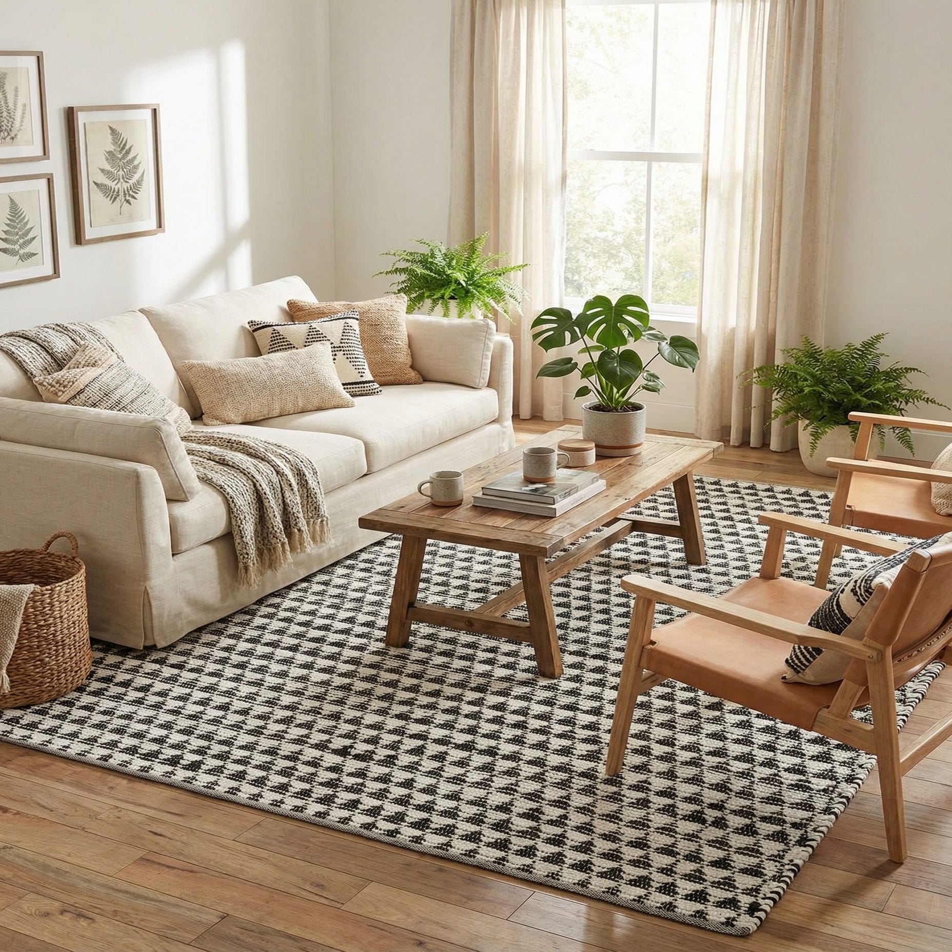 The neutral black-and-white palette makes this piece versatile: place it beneath a coffee table to anchor a contemporary living room, layer it in a bedroom for contrast against light wood floors, or set it in a high-traffic entry or dining area where a low-pile weave is practical. It pairs well with minimalist, Scandinavian, and modern farmhouse schemes, and also provides a grounded backdrop for colorful pillows, brass accents, or woven textures.