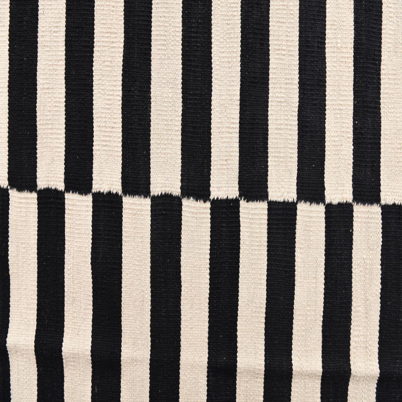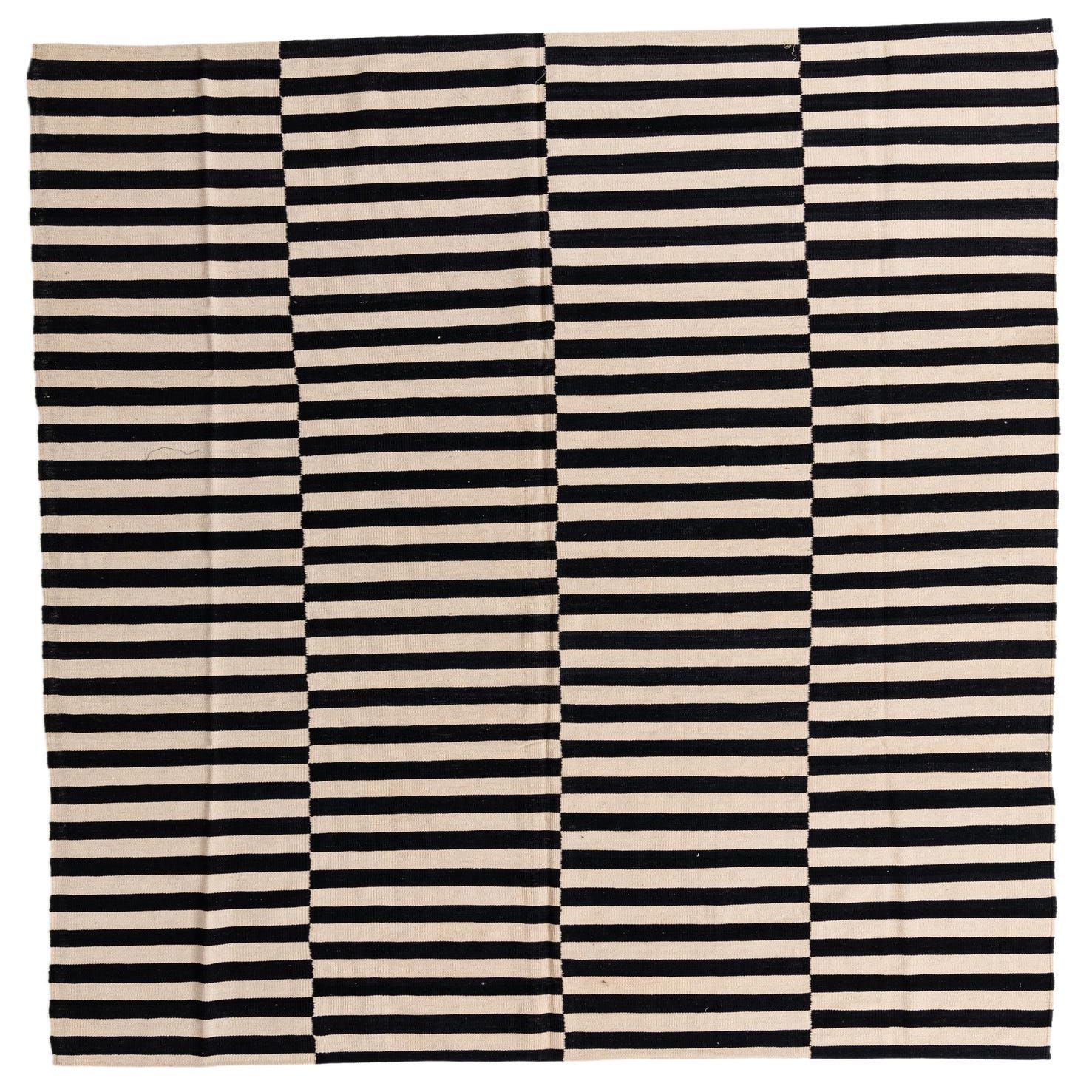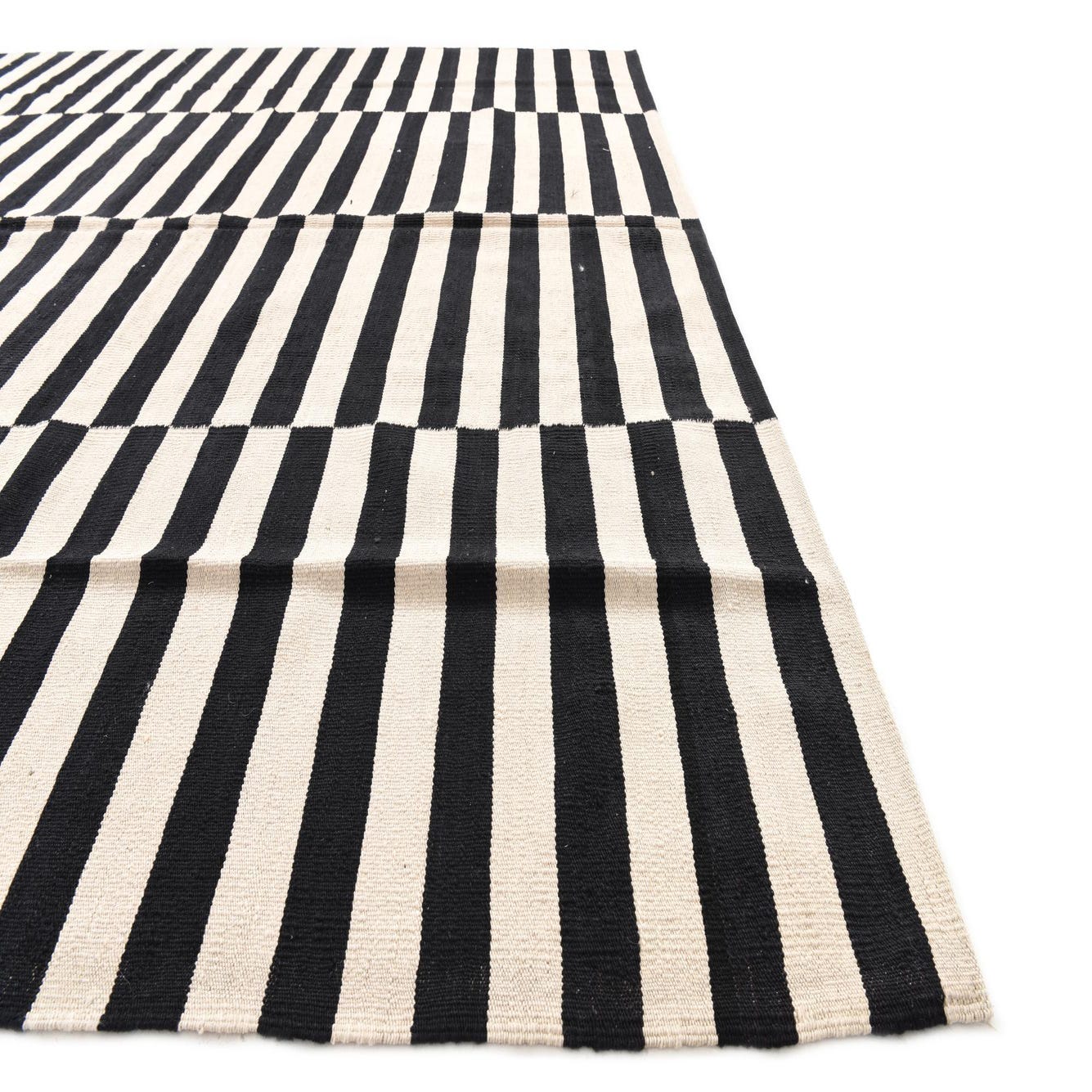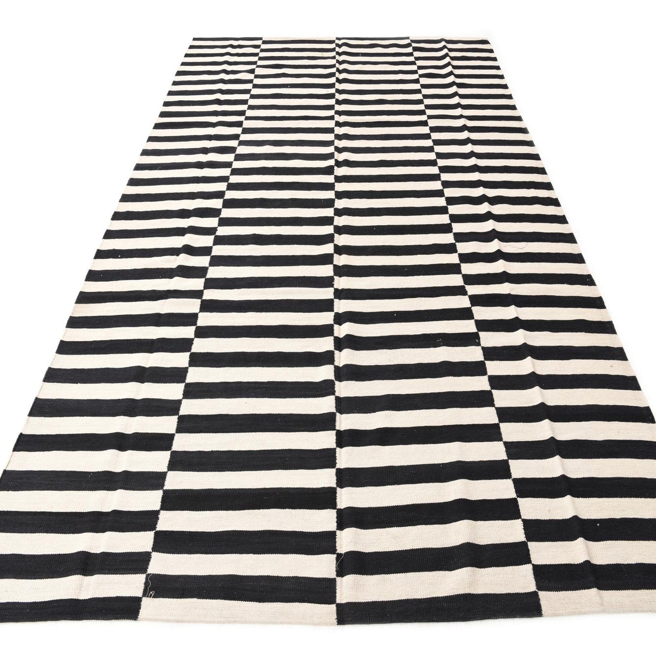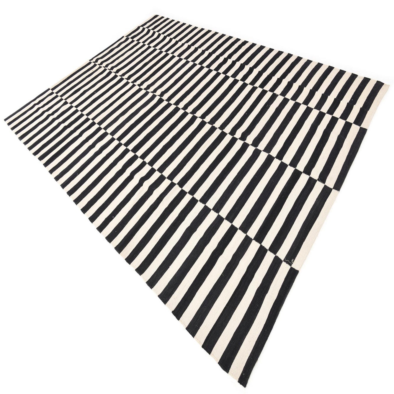 An 8x11 rectangular Kilim Modern rug with alternating black and cream horizontal stripes in a tribal, modern pattern.