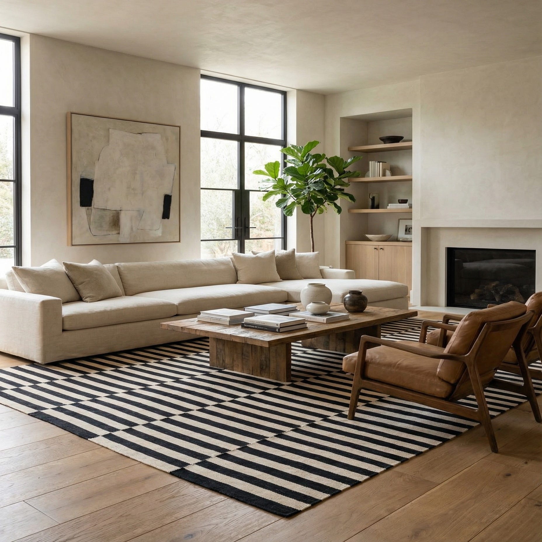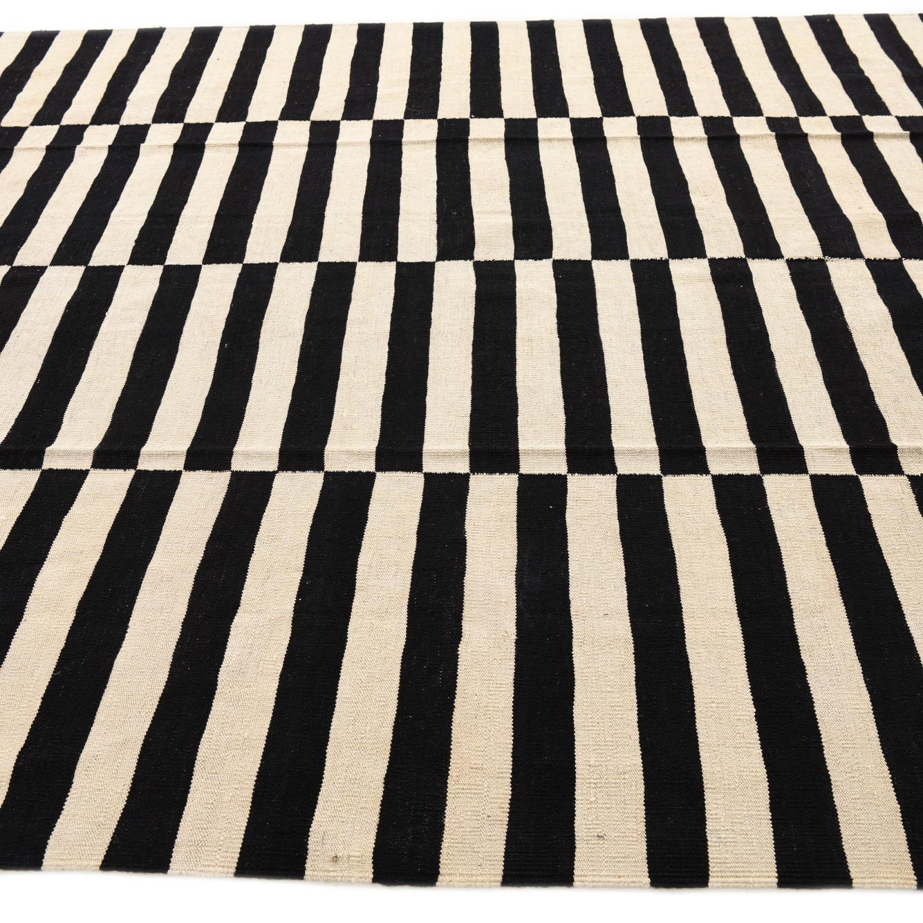 A rectangular 8x11 black and white striped flatweave rug with a modern tribal pattern, suitable for a living room.