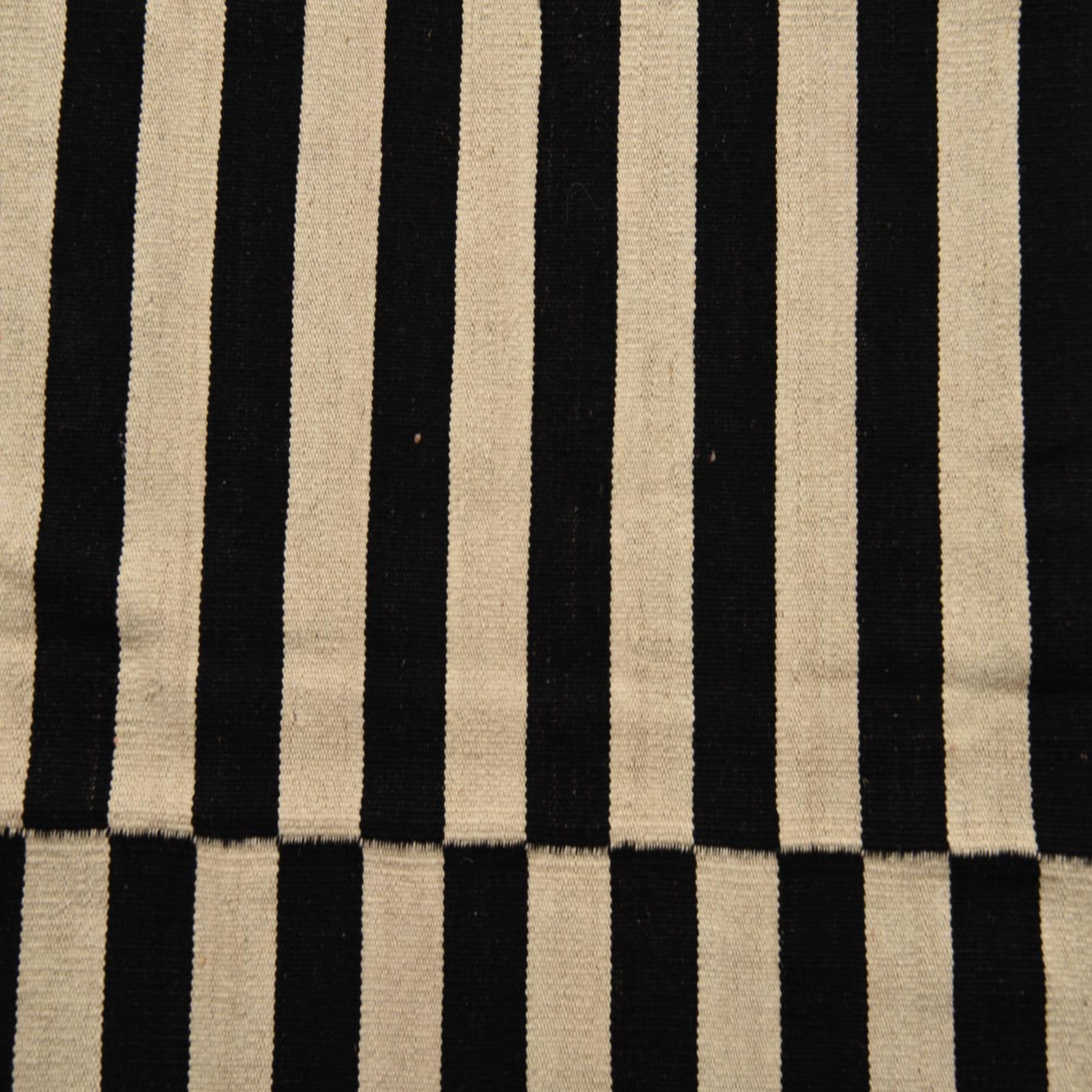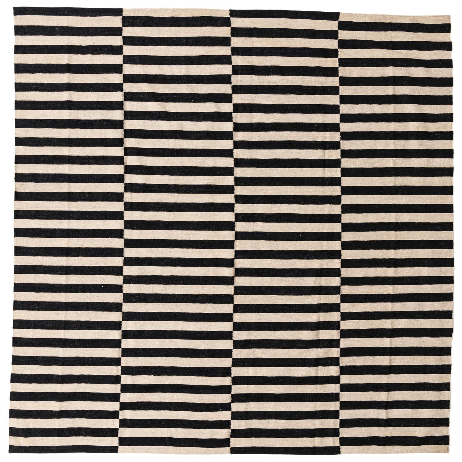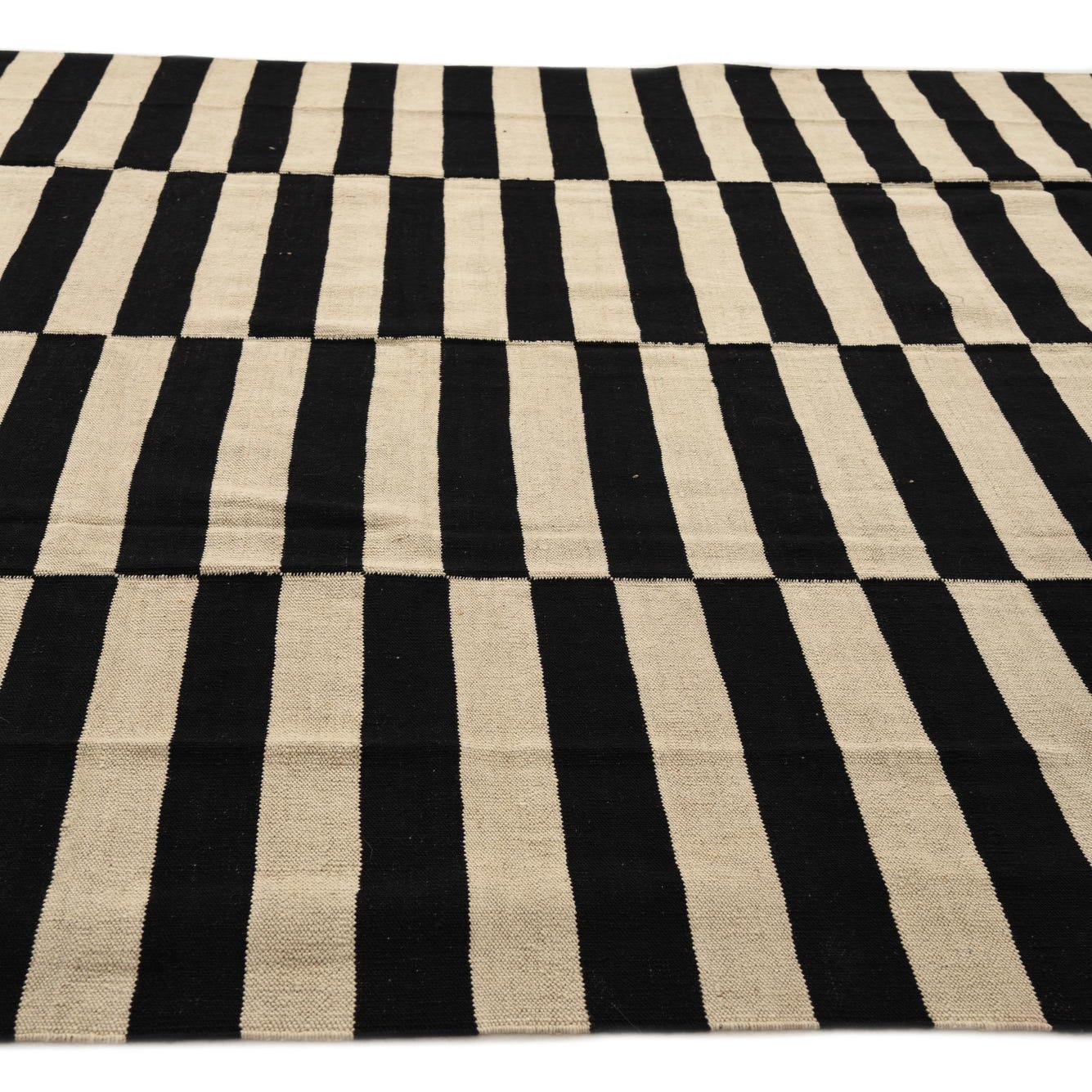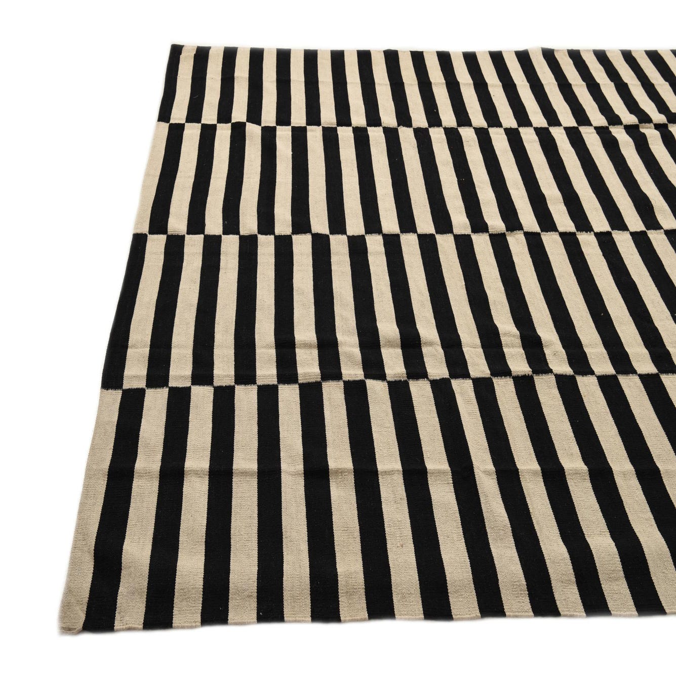 An 8x11 rectangular Kilim Modern rug featuring bold black and cream horizontal stripes in a tribal, modern pattern.