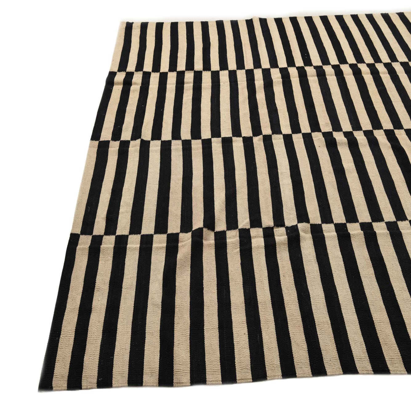 Hand-woven from 100% wool, this kilim-style flatweave presents a clean, linear pattern of alternating black and white horizontal stripes arranged in vertical panels. The narrow, evenly spaced bands create a steady rhythm across the surface, while the subtle irregularities of the hand weave give the piece a warm, tactile quality. The low-profile pile and firm, slightly textured wool underfoot make it easy to layer or place under furniture without feeling bulky.