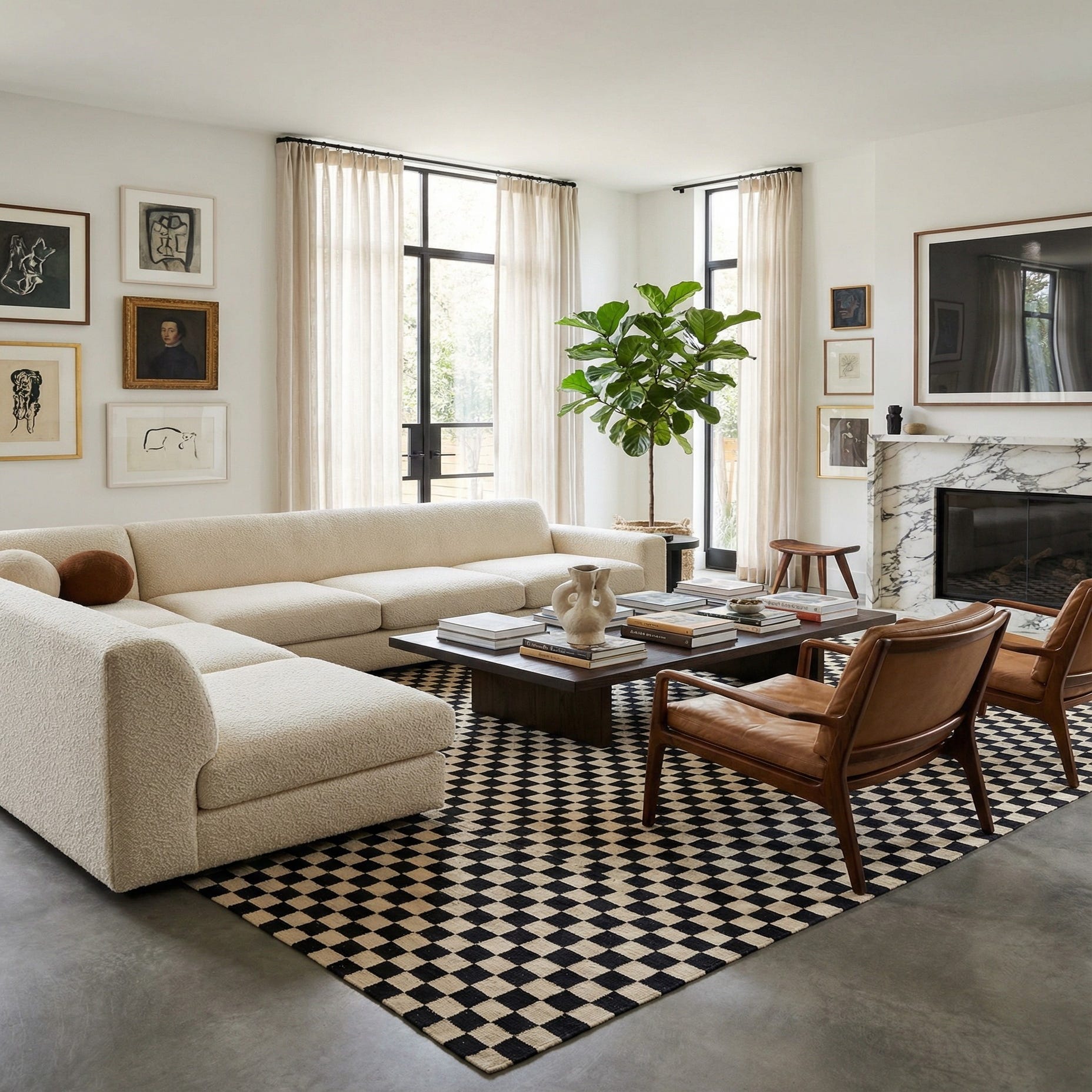 A large 8x12 rectangular flatweave rug with a black and cream checkerboard pattern, perfect for a modern living space.