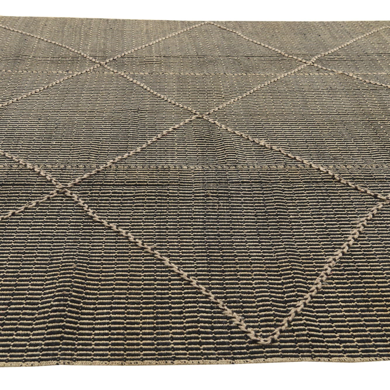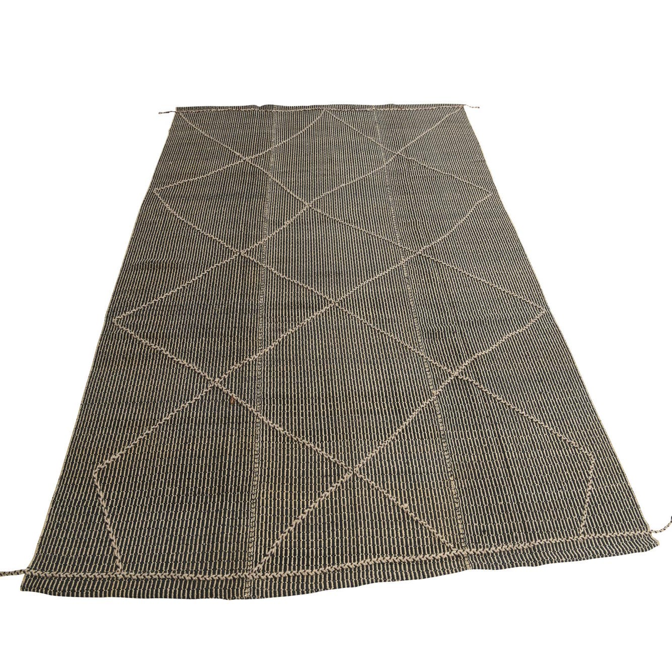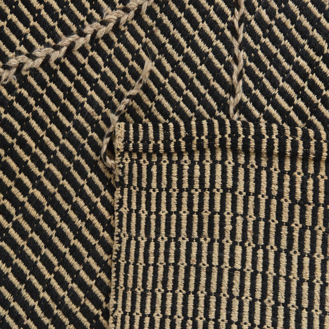 A 9x11 rectangular shag rug featuring a black background with a cream tribal diamond pattern, handmade from wool.