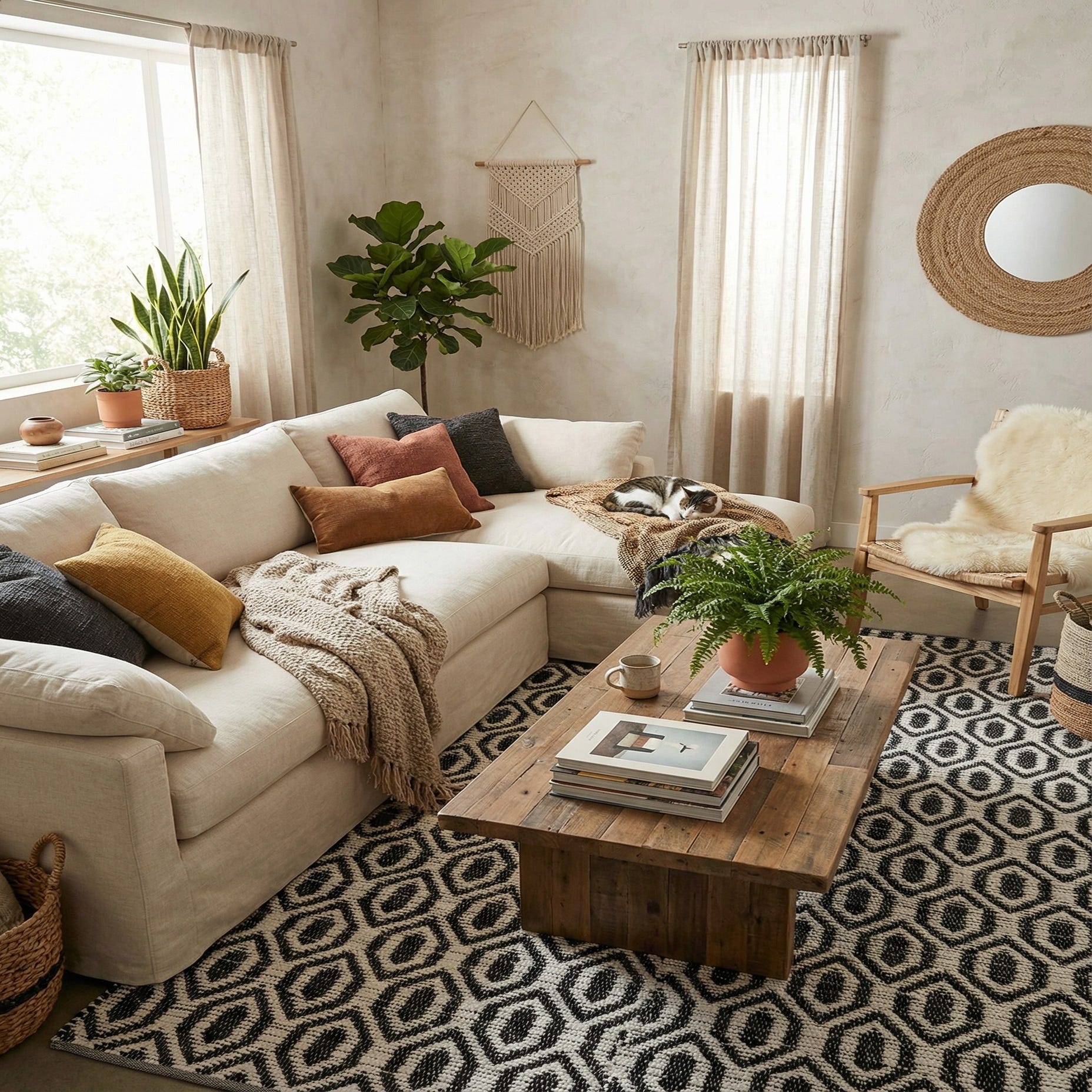 Place this rug in a living room to anchor a seating group, under a dining table for clean contrast, or in an entry where the pattern will make a clear first impression. It complements minimalist and Scandinavian schemes, pairs well with warm wood tones and leather, and adds graphic interest to transitional or industrial interiors.