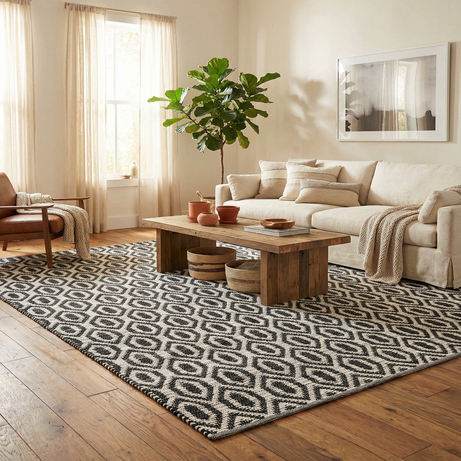 Place this rug in a living room to anchor a seating group, under a dining table for clean contrast, or in an entry where the pattern will make a clear first impression. It complements minimalist and Scandinavian schemes, pairs well with warm wood tones and leather, and adds graphic interest to transitional or industrial interiors.