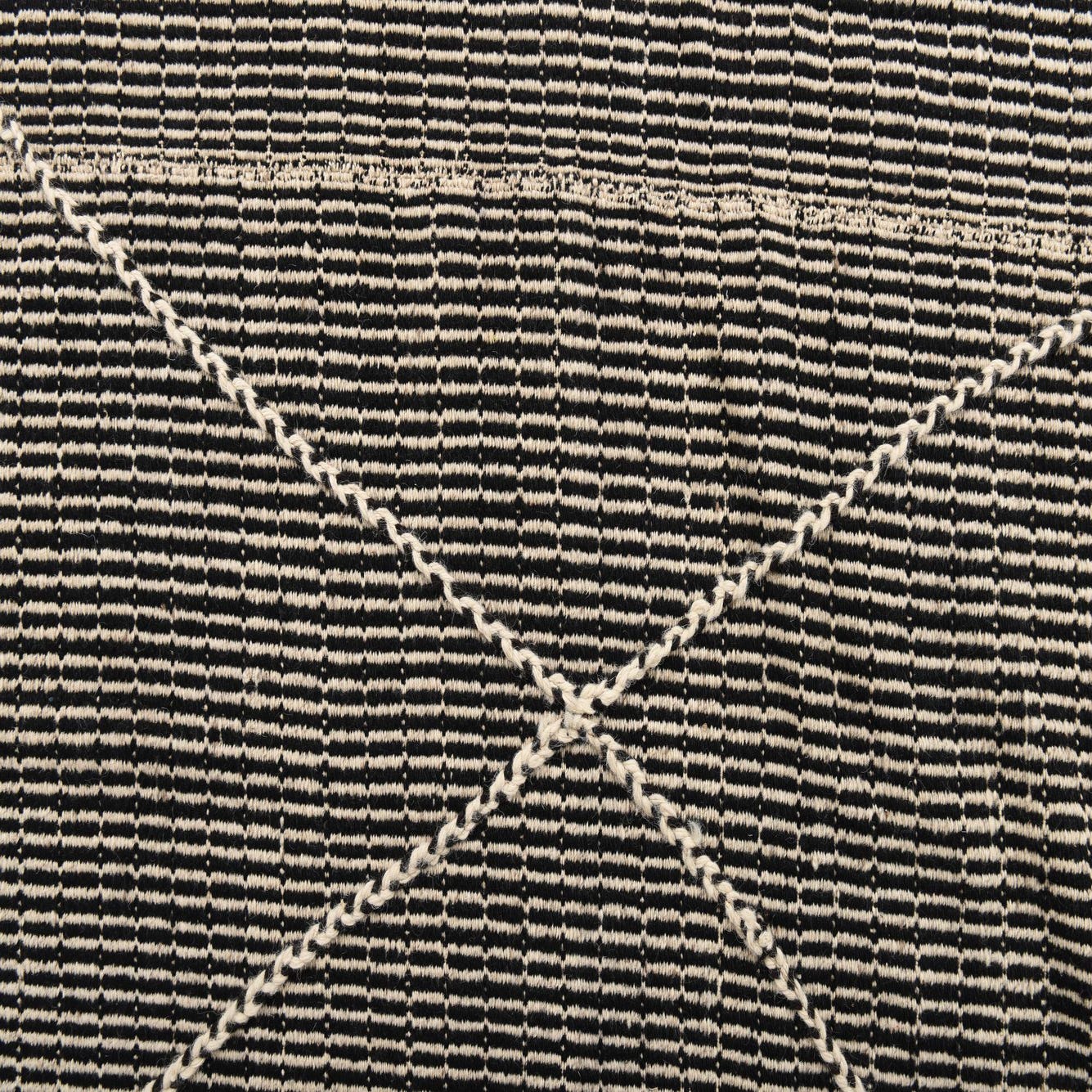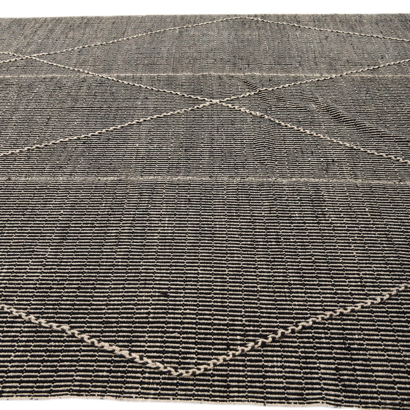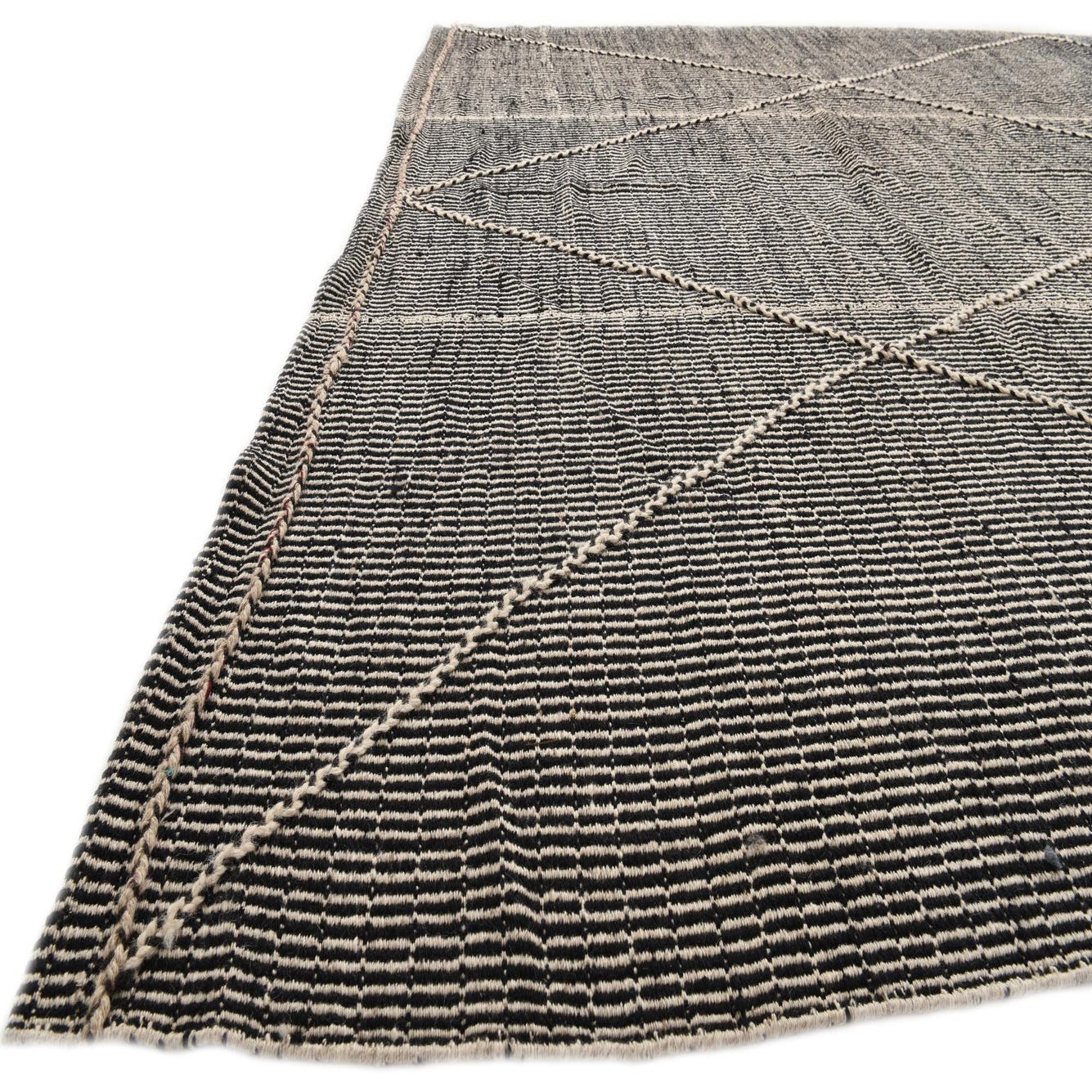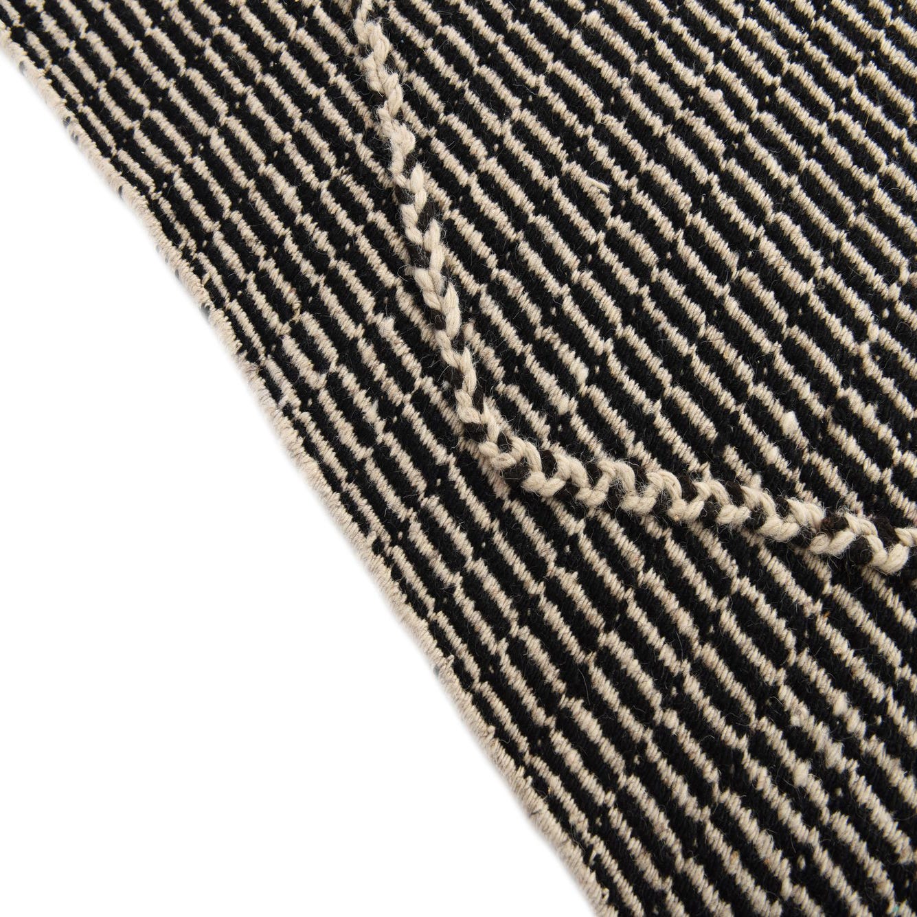 The Darya collection presents a sophisticated 9x12 hand-knotted rug crafted from 100% wool, offering both durability and comfort underfoot. This piece features a distinctive pattern, characterized by a black and white color scheme that creates a bold, geometric design. The contrasting hues are used to form a series of intersecting lines and diamond shapes, resulting in a stark, eye-catching aesthetic that can serve as a focal point in a room.