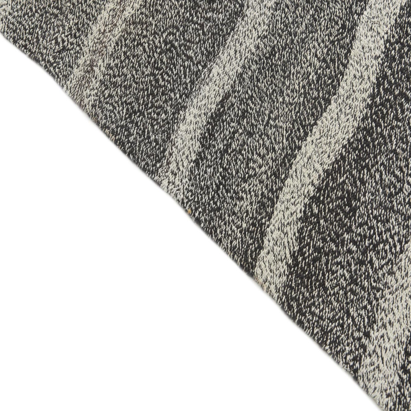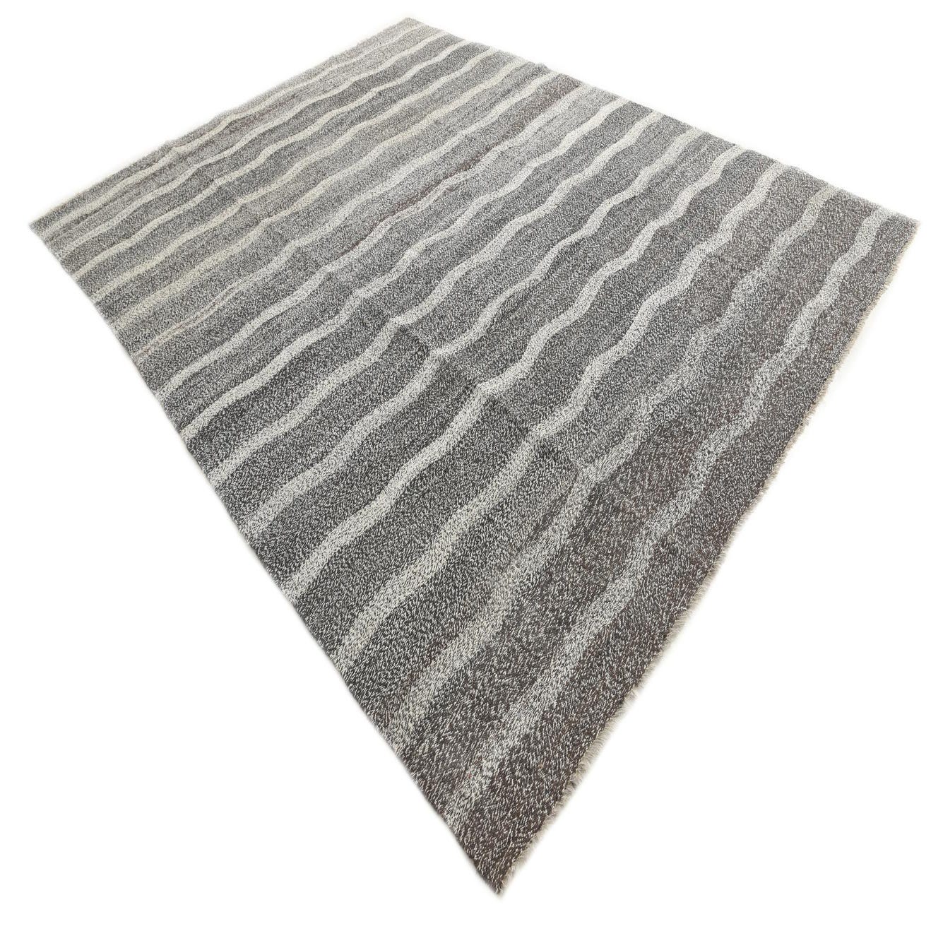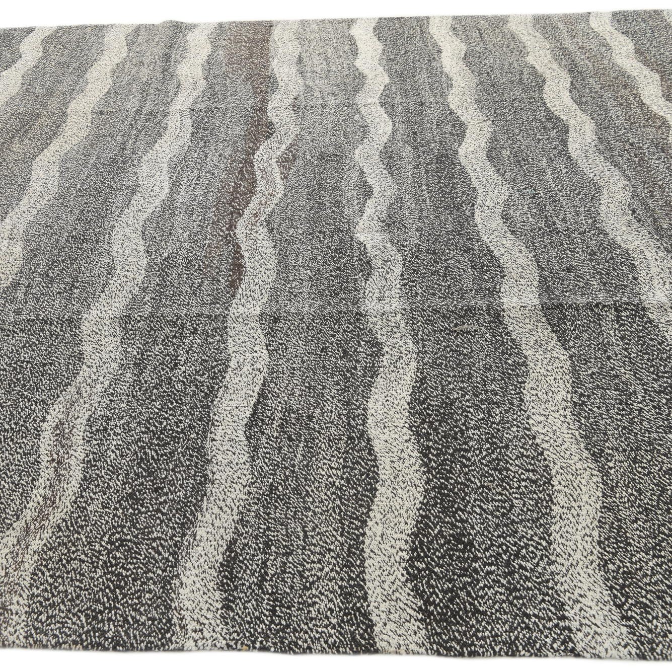 The Kilim Modern collection presents a 9x12 hand-woven rug crafted from 100% wool, offering a blend of comfort and durability. This piece showcases a distinctive pattern featuring undulating waves in a monochromatic palette, with black and white as the primary colors. The alternate bands of color create a sense of movement, adding a dynamic visual interest to the otherwise minimalist design.