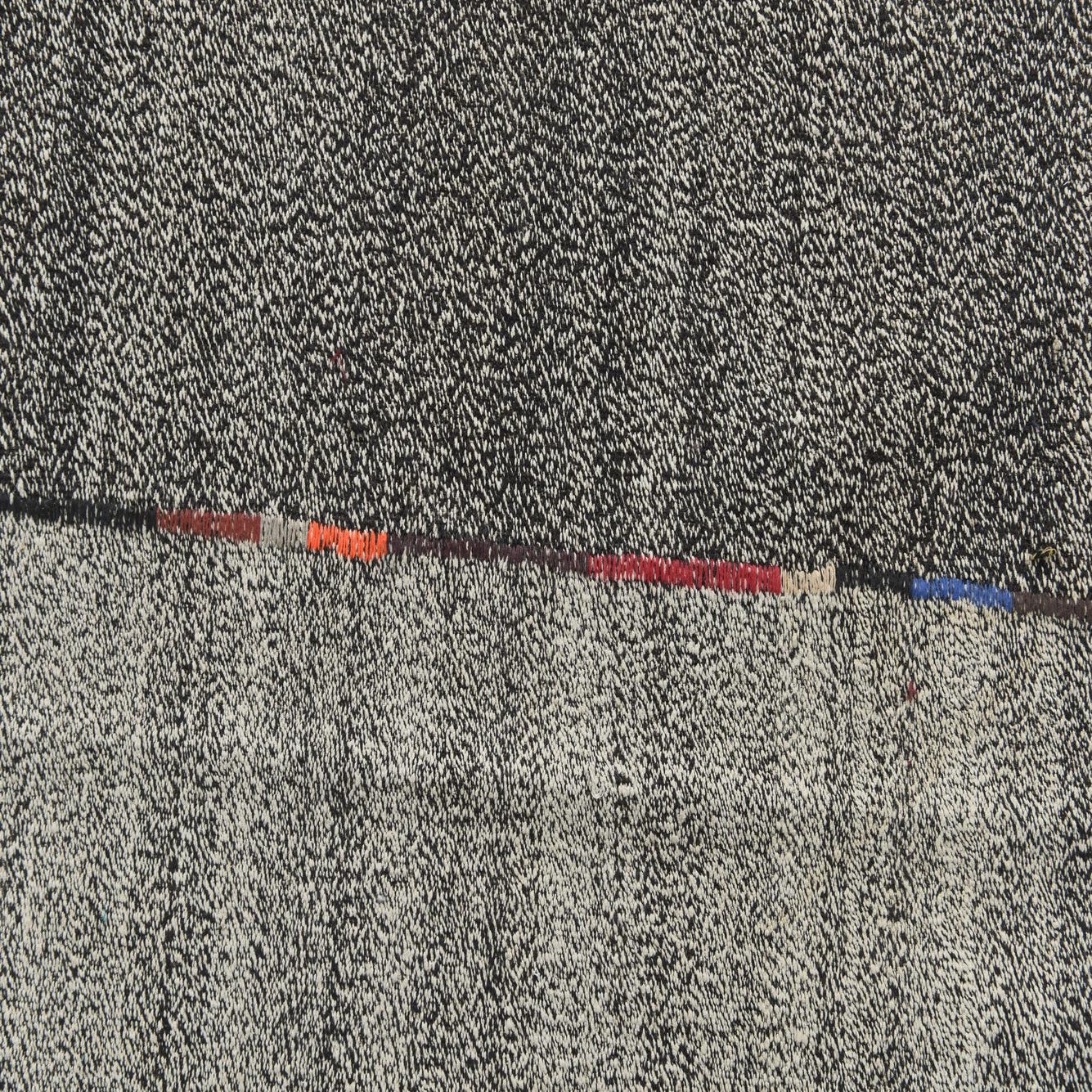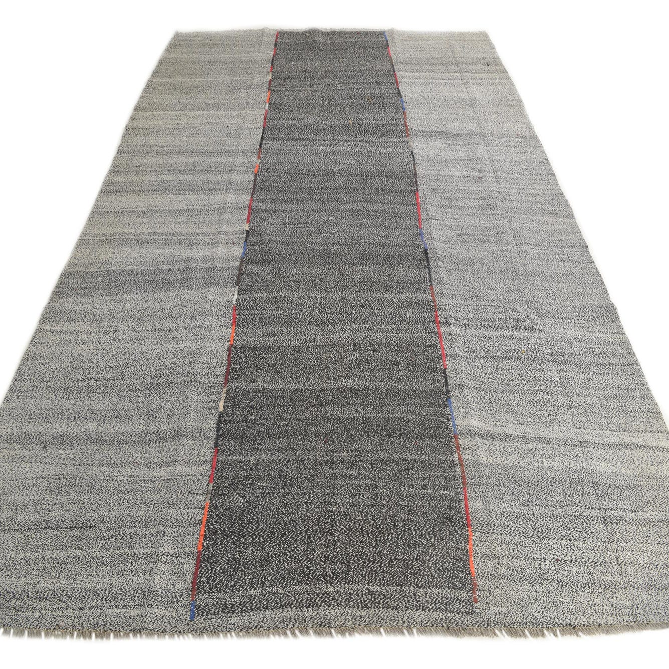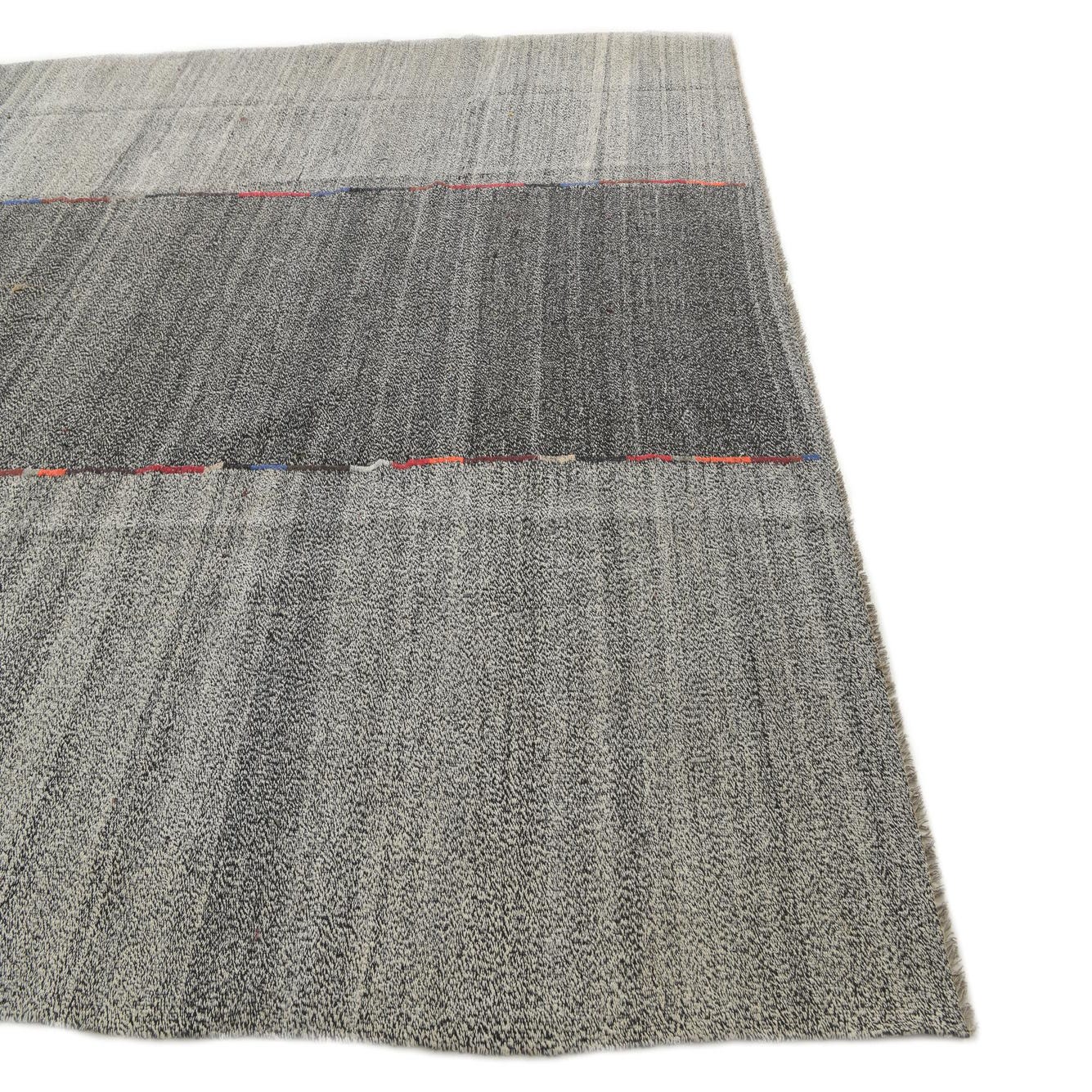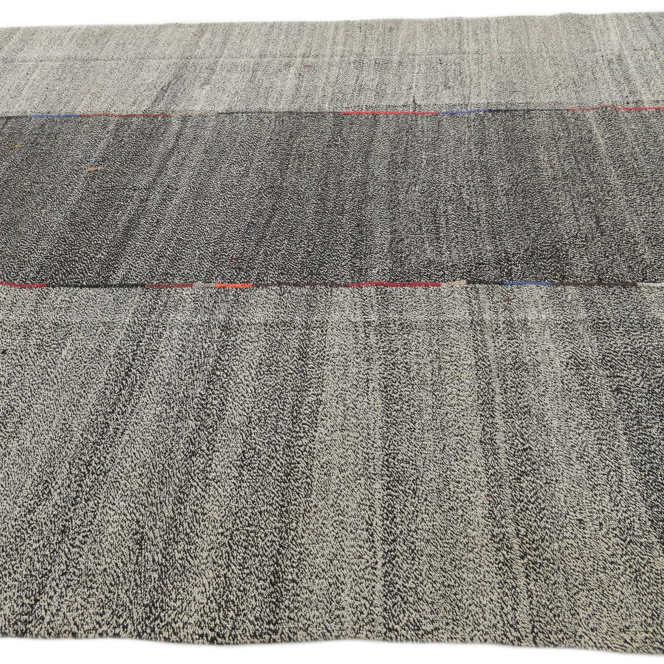 A 9x12 rectangular Kilim Modern rug featuring a central dark gray stripe flanked by lighter gray sections, with thin colorful accents.