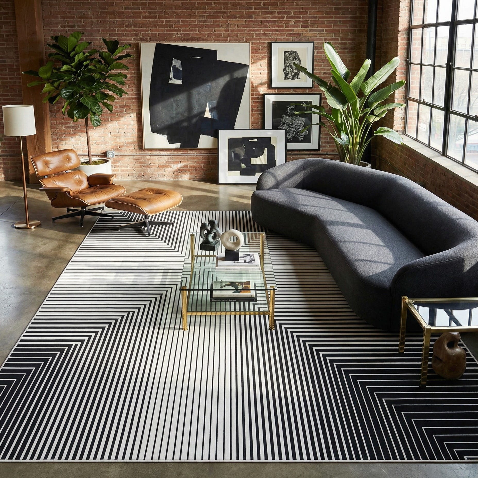 This rug pairs naturally with minimalist and contemporary interiors — place it under a streamlined sofa in a living room or beneath a dining table to add structure without overwhelming the space. It also complements Scandinavian or mid-century modern schemes when layered over warm wood floors, and works well in a home office or entry where a striking, orderly pattern can define the area.