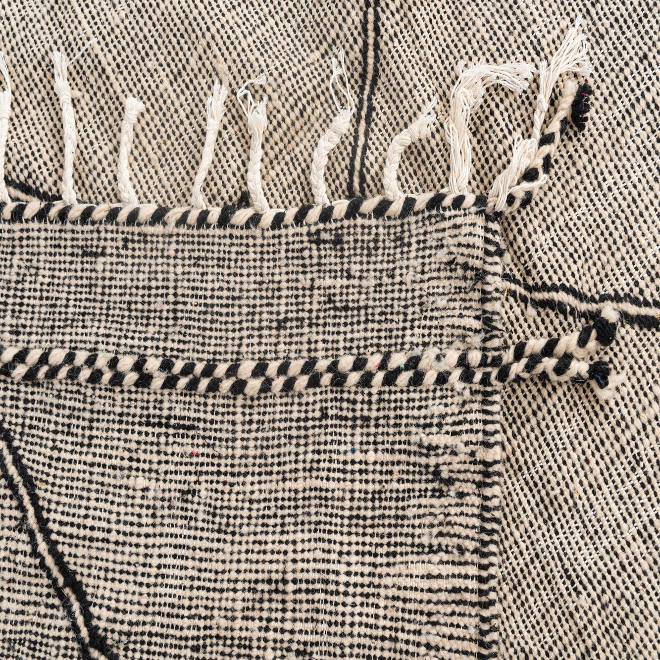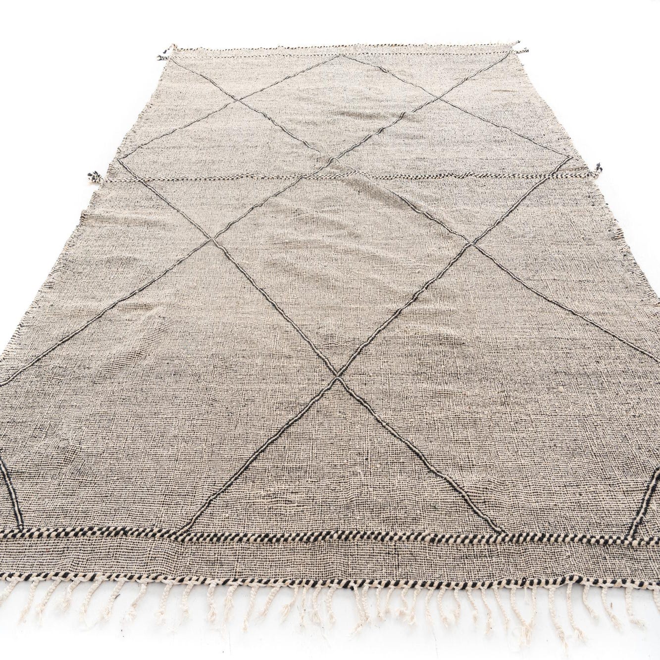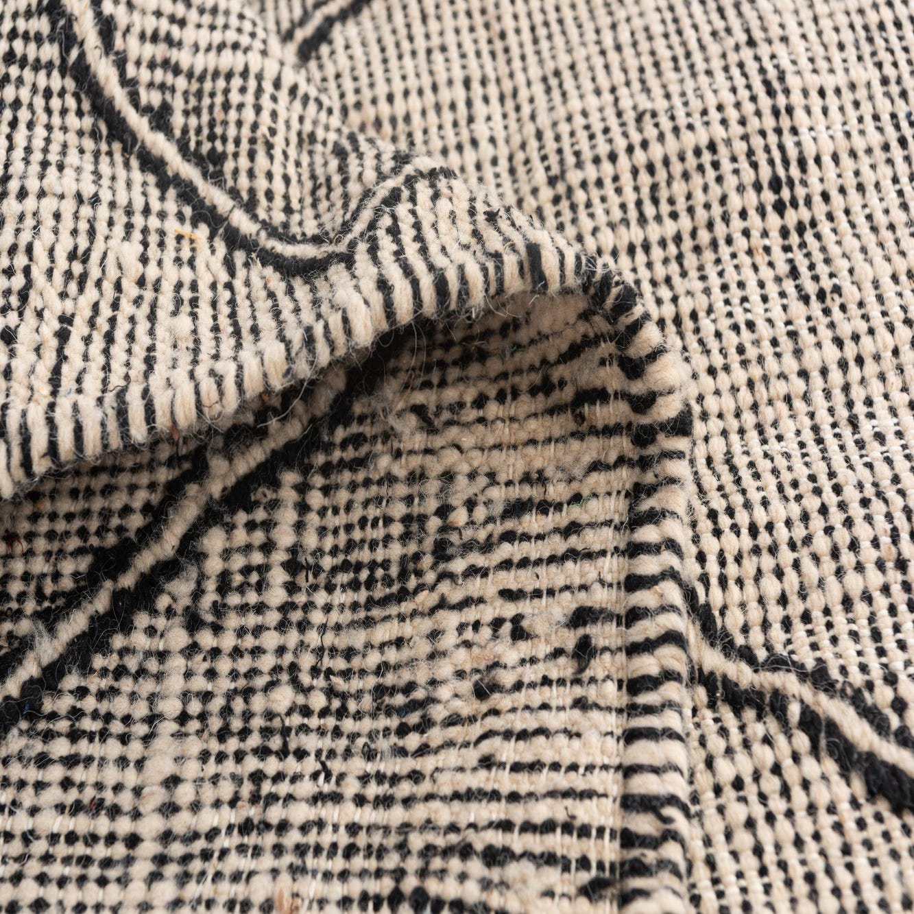 A graphic, hand-knotted 100% wool rug with a classic Moroccan diamond lattice rendered in black over a white/ivory ground. The large-scale geometric lines are made from a slightly thicker, corded knot that lifts gently above the field, while the background has a softly nubby, tactile wool surface that feels warm underfoot. Braided bands and short fringe at the ends add a handcrafted finish that keeps the overall look relaxed and natural.