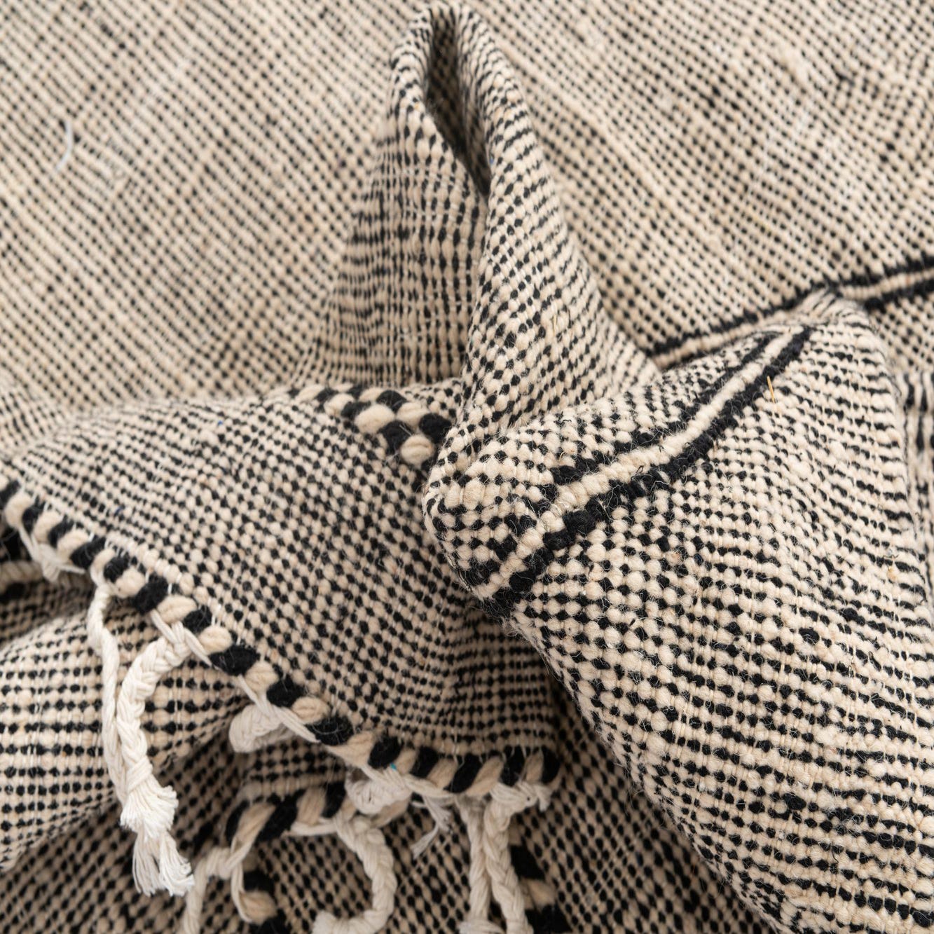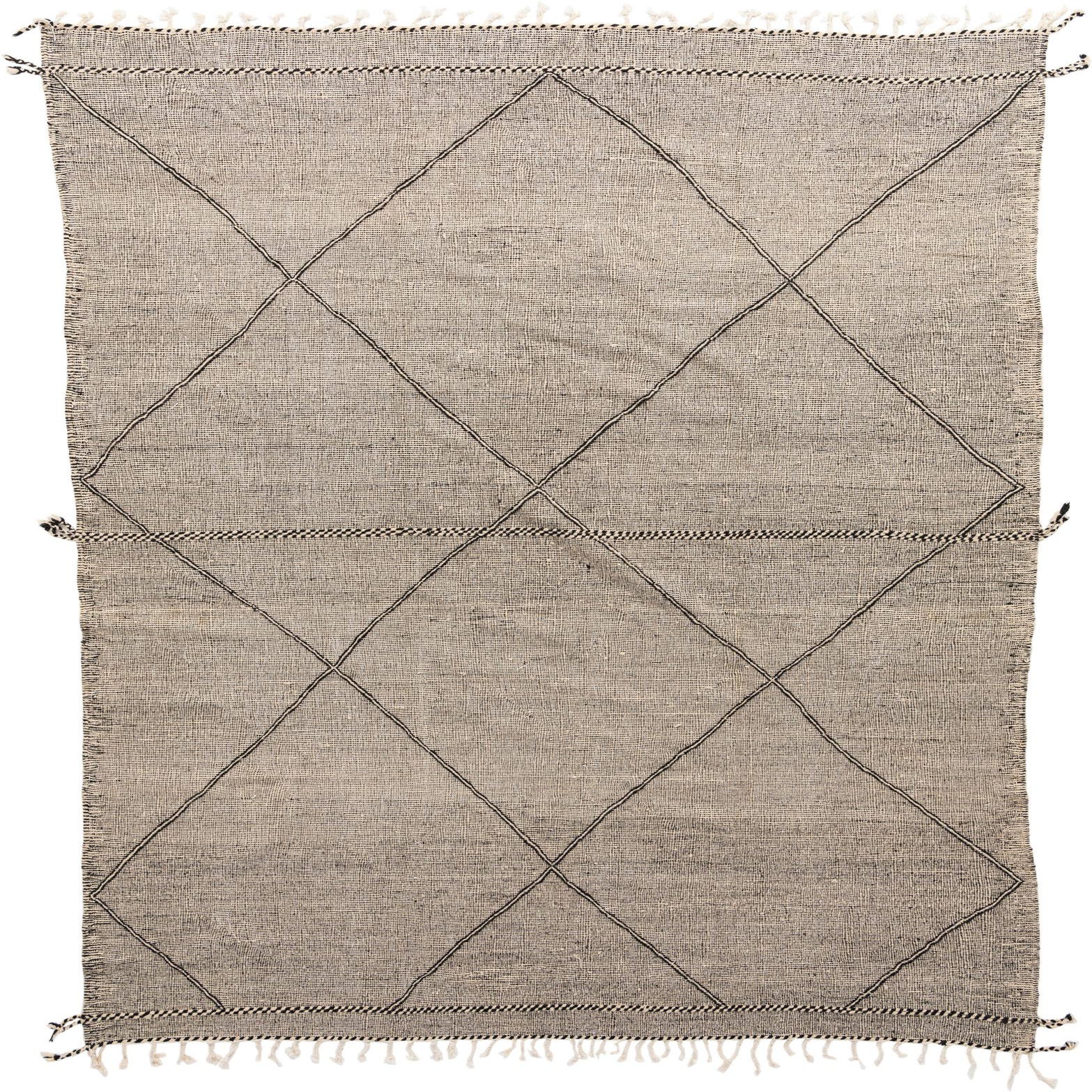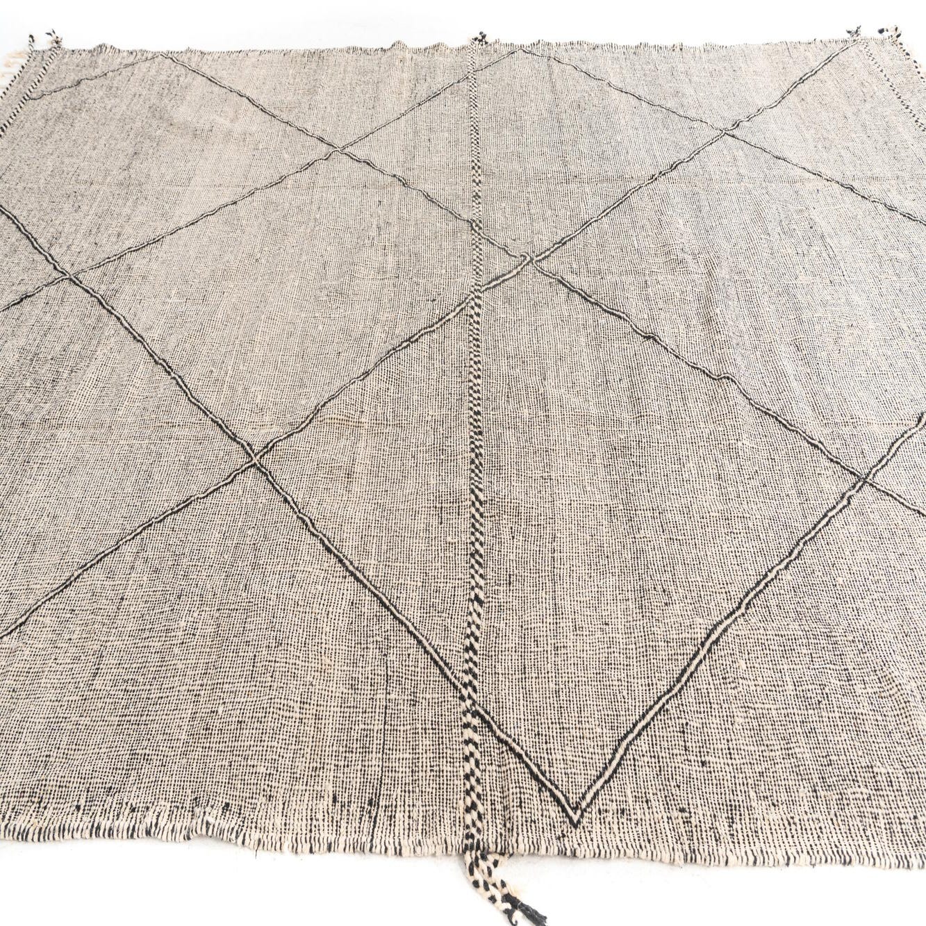 A 9x12 rectangular black and white tribal wool rug with a diamond pattern and fringe.