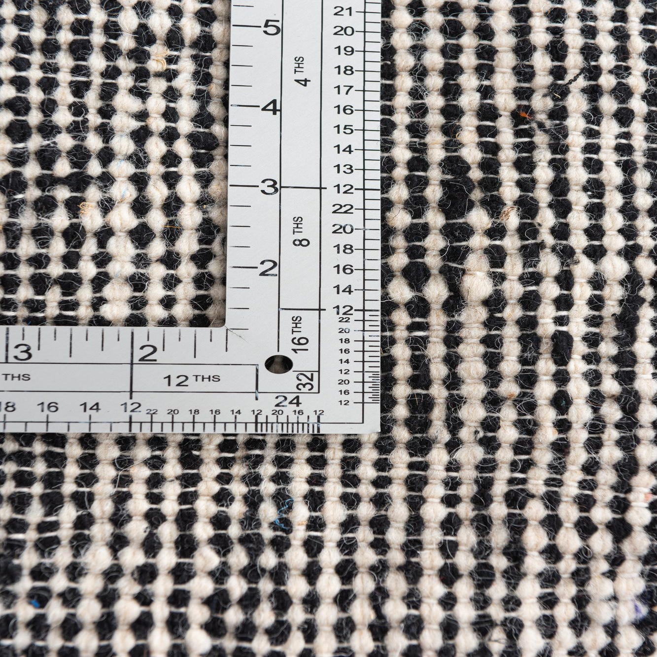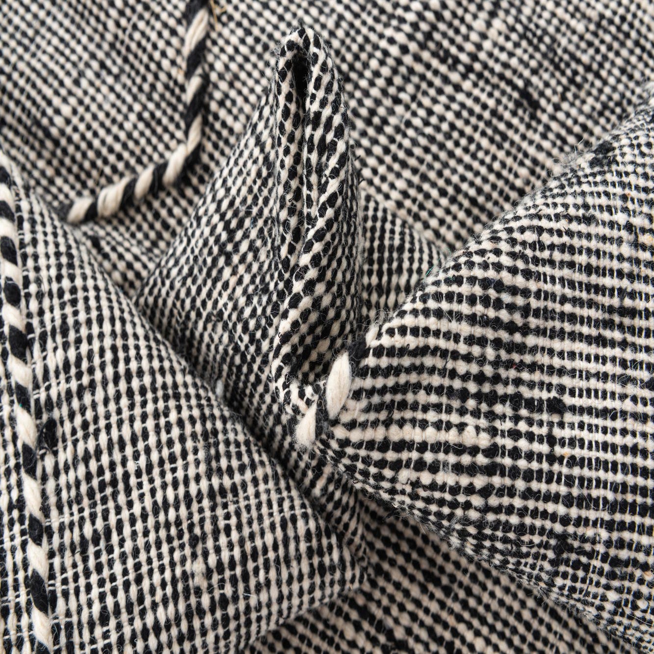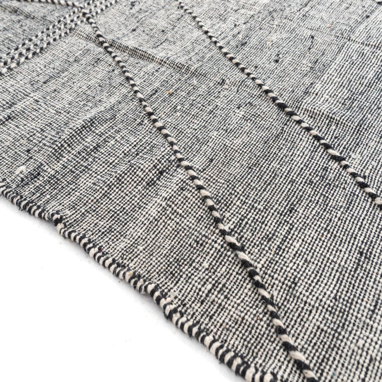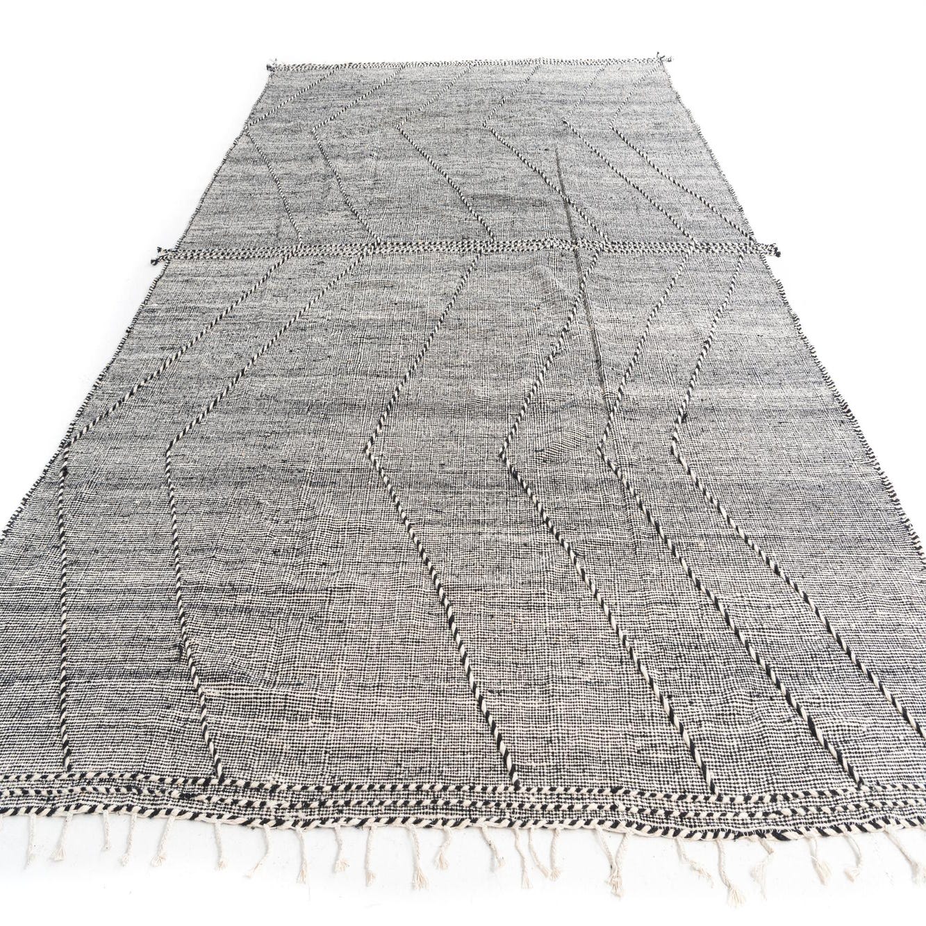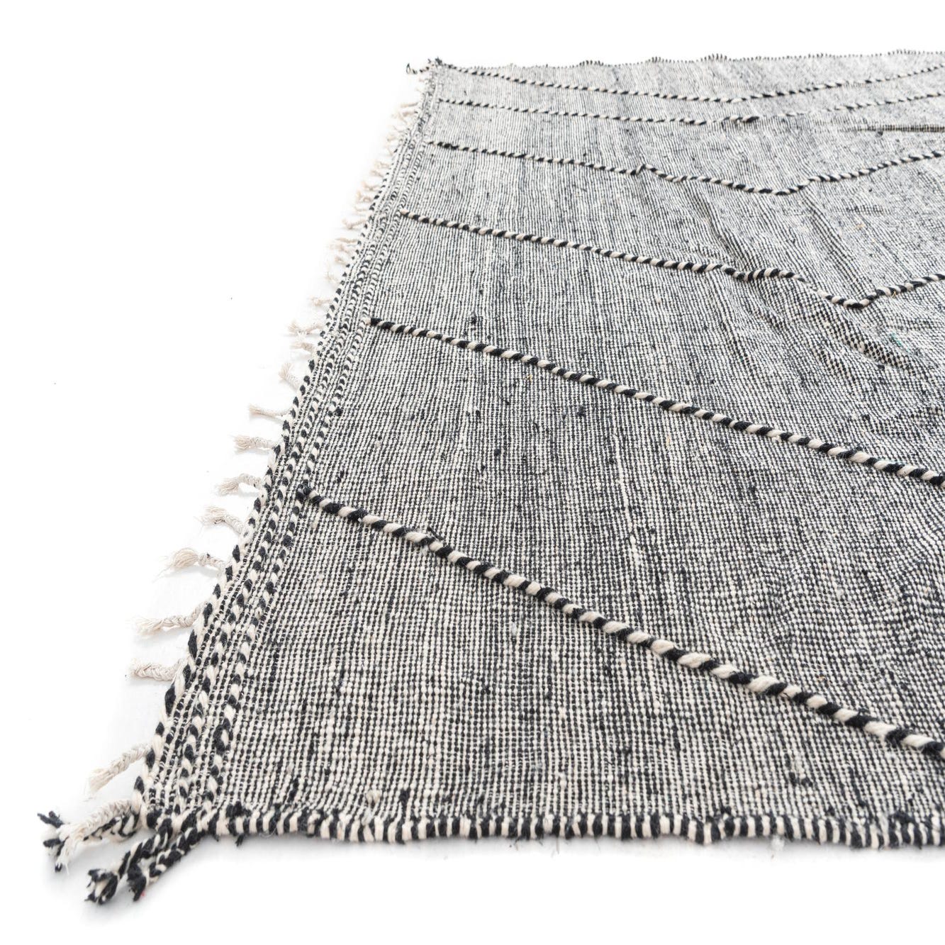 A 9x12 rectangular black and white tribal wool shag rug with a modern geometric pattern and tassels.