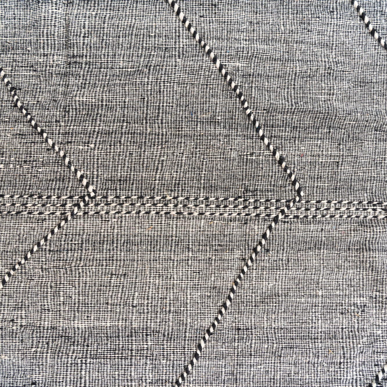 This Moroccan collection rug is a 9x12 hand-knotted piece, finely crafted from 100% wool, showcasing a tasteful balance of simplicity and sophistication. The rug presents a striking geometric pattern, featuring bold, angular lines stitched in a contrasting shade that create an alluring lattice design against the black and white background. The texture is a testament to its handcrafted origin, offering a tactile depth that enriches its visual appeal.