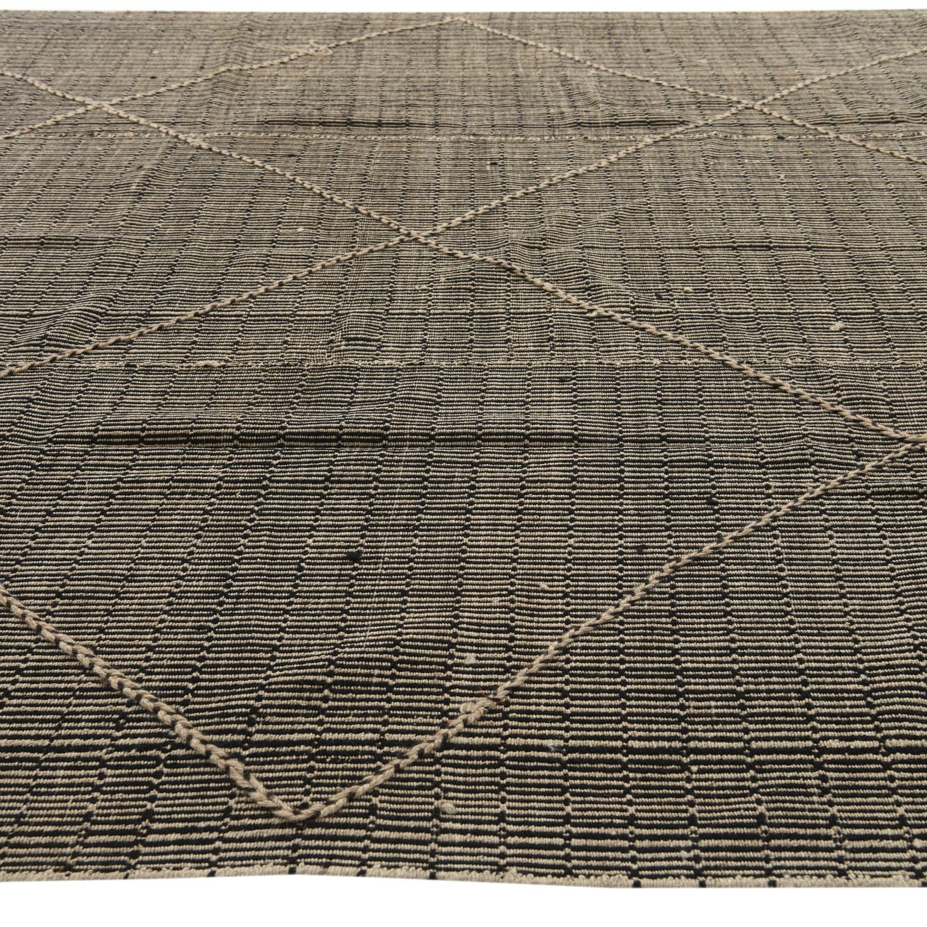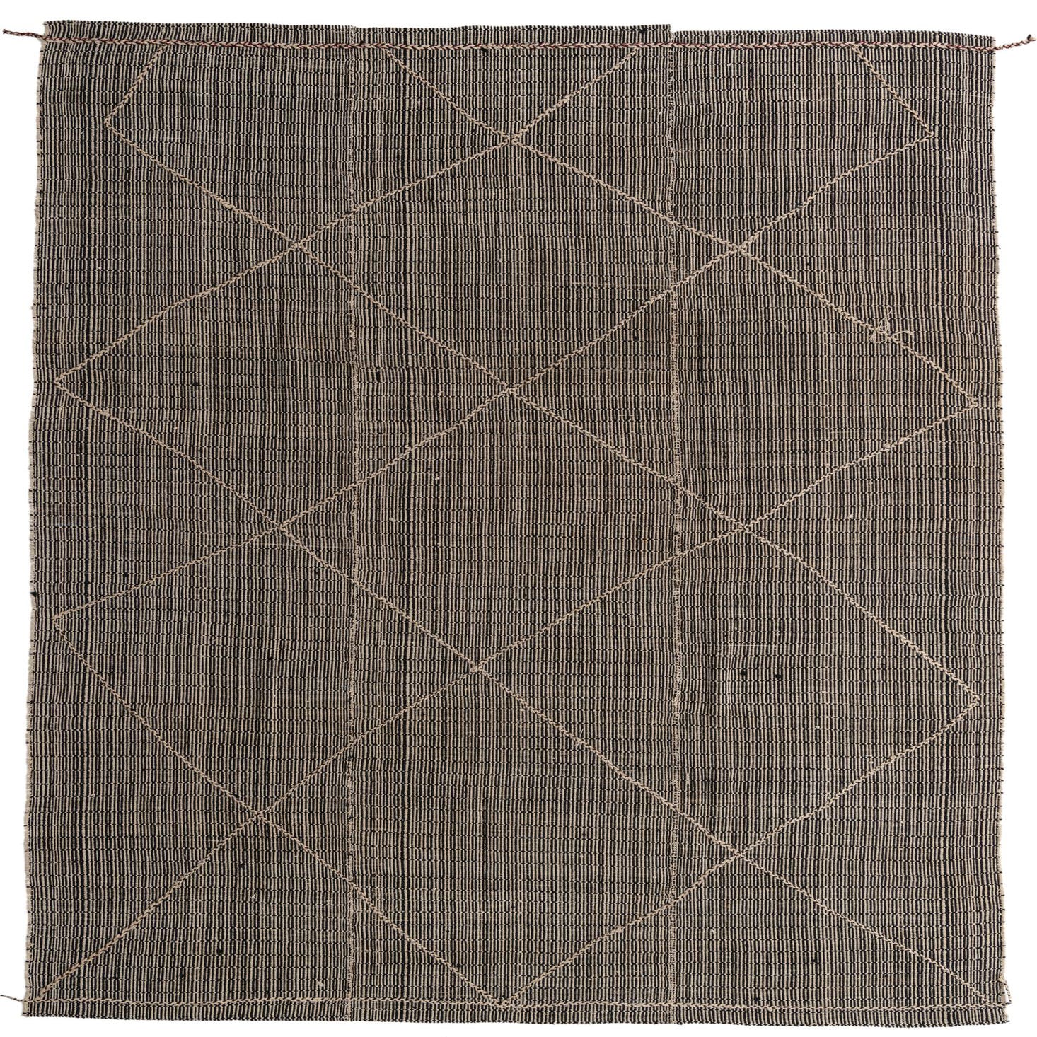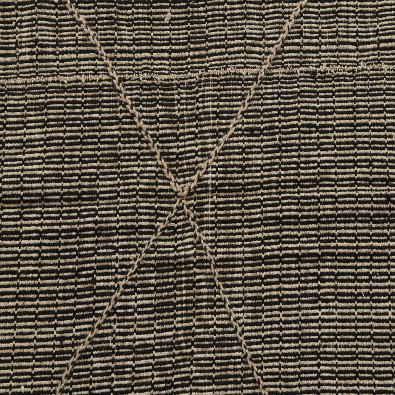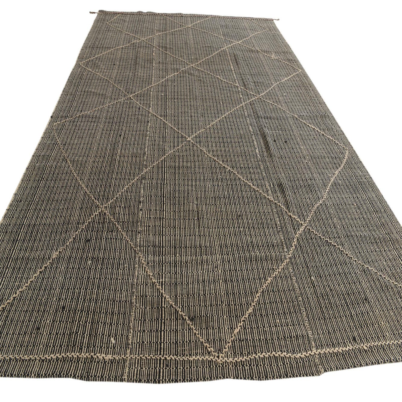 This Moroccan collection rug is hand-knotted of 100% wool and presents a striking visual with its high-contrast black and white color palette. The design features a series of interconnected diamonds that create a dynamic geometric pattern, infusing a sense of movement and contemporary flair into the space it occupies.
