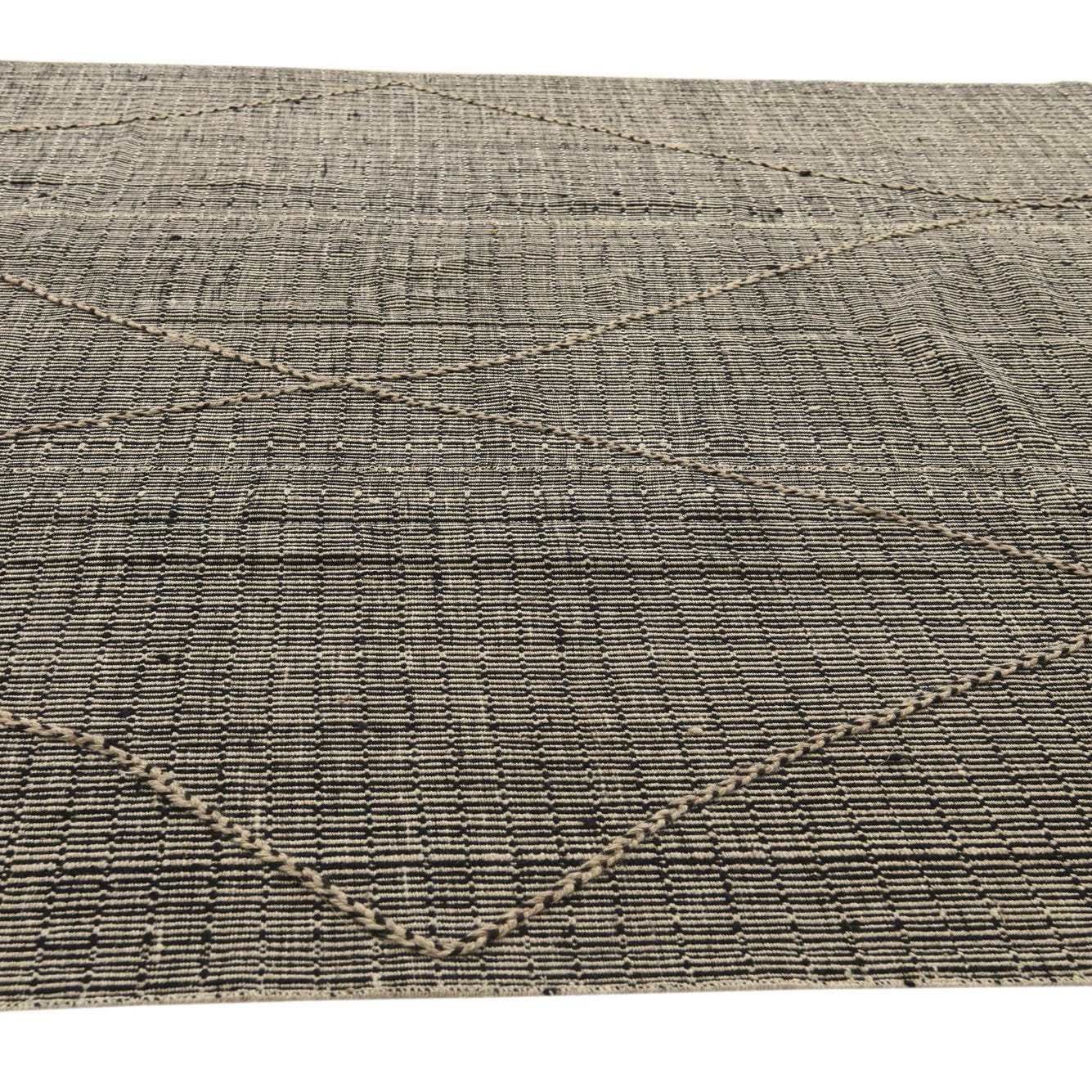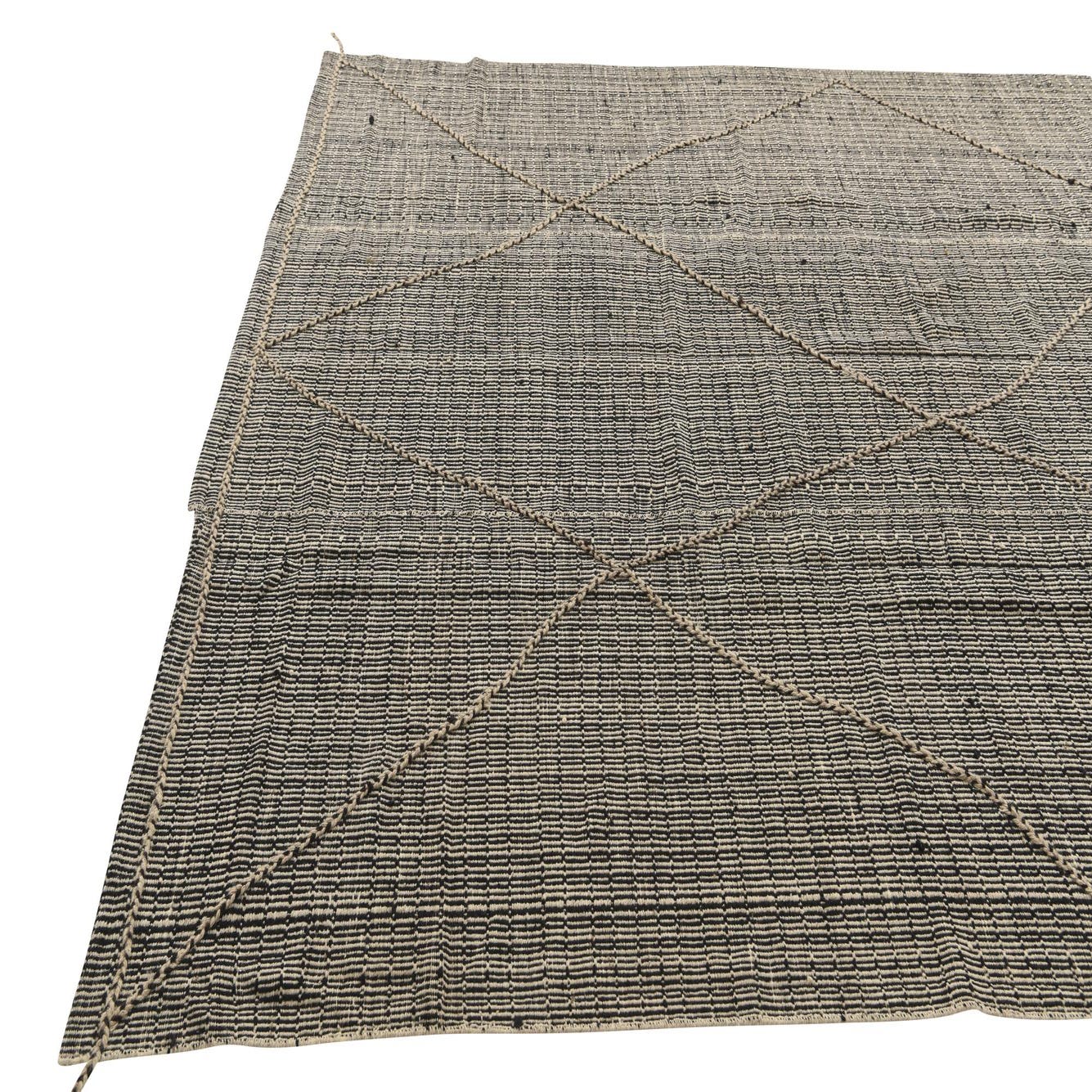 A 9x12 rectangular black and ivory wool shag rug with a subtle tribal diamond pattern, ideal for a living room.