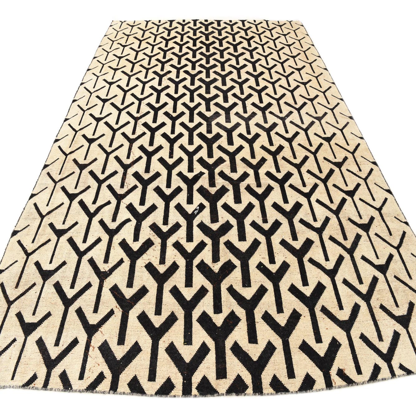 A 9x12 rectangular black and cream wool shag rug with a repeating modern tribal geometric pattern.