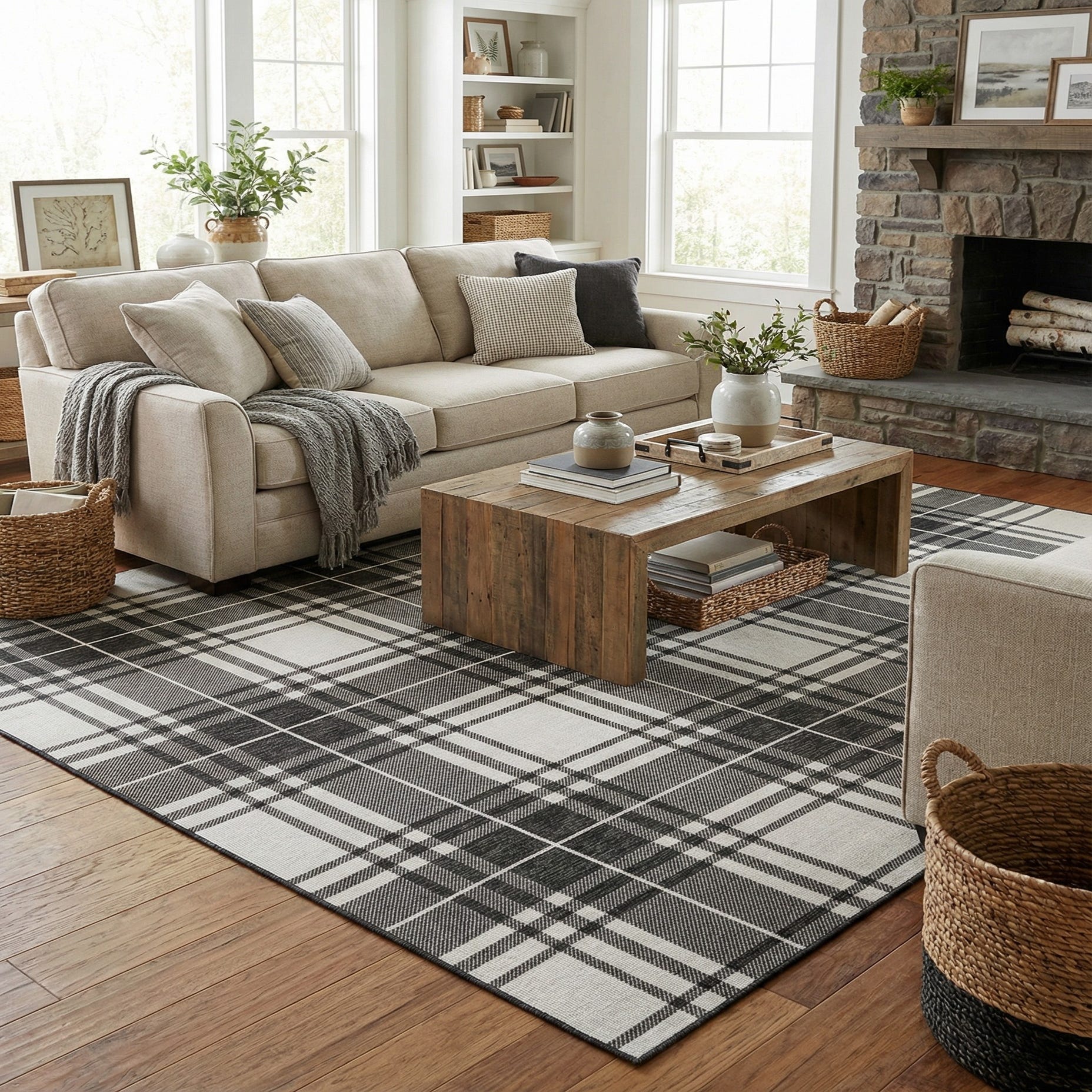 This versatile piece works well in covered outdoor spaces, sunrooms, or high-traffic indoor areas where a bold, neutral anchor is needed. Pair it with warm wood tones and black metal accents for a modern farmhouse or industrial look, add bright throw pillows for a contemporary contrast, or use it beneath a casual dining set on a covered patio to define the seating area. Its monochrome palette makes it easy to layer with natural fibers or colorful accents, adapting to both pared-back and more eclectic interiors.