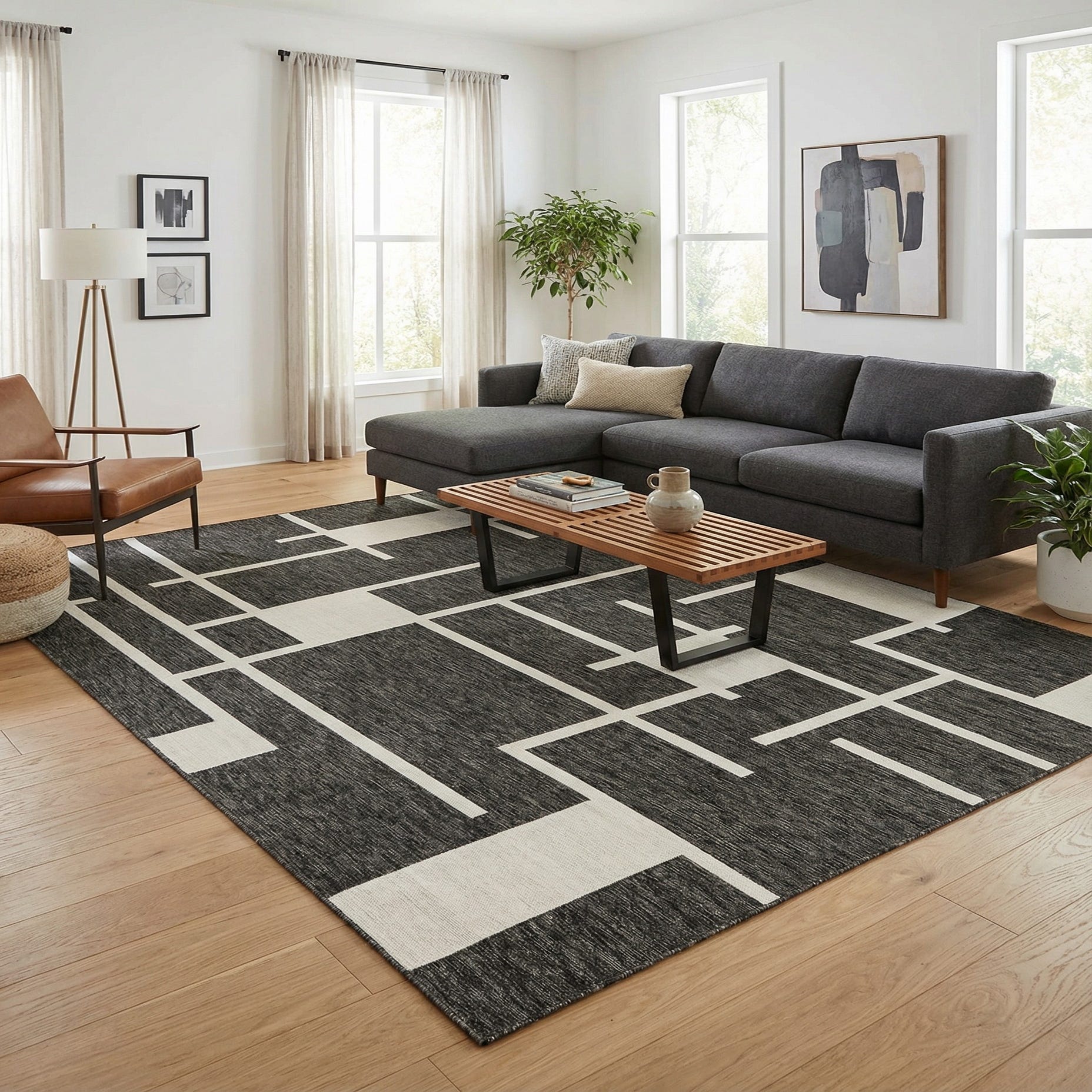 The black and white palette makes this rug versatile; it can complement minimalist decor schemes, accentuate modern outdoor furniture, or provide a graphic statement piece against more neutral or natural finishes. With its weather-resistant qualities, it can effortlessly transition through seasons, making it an excellent choice for a variety of exterior living spaces.