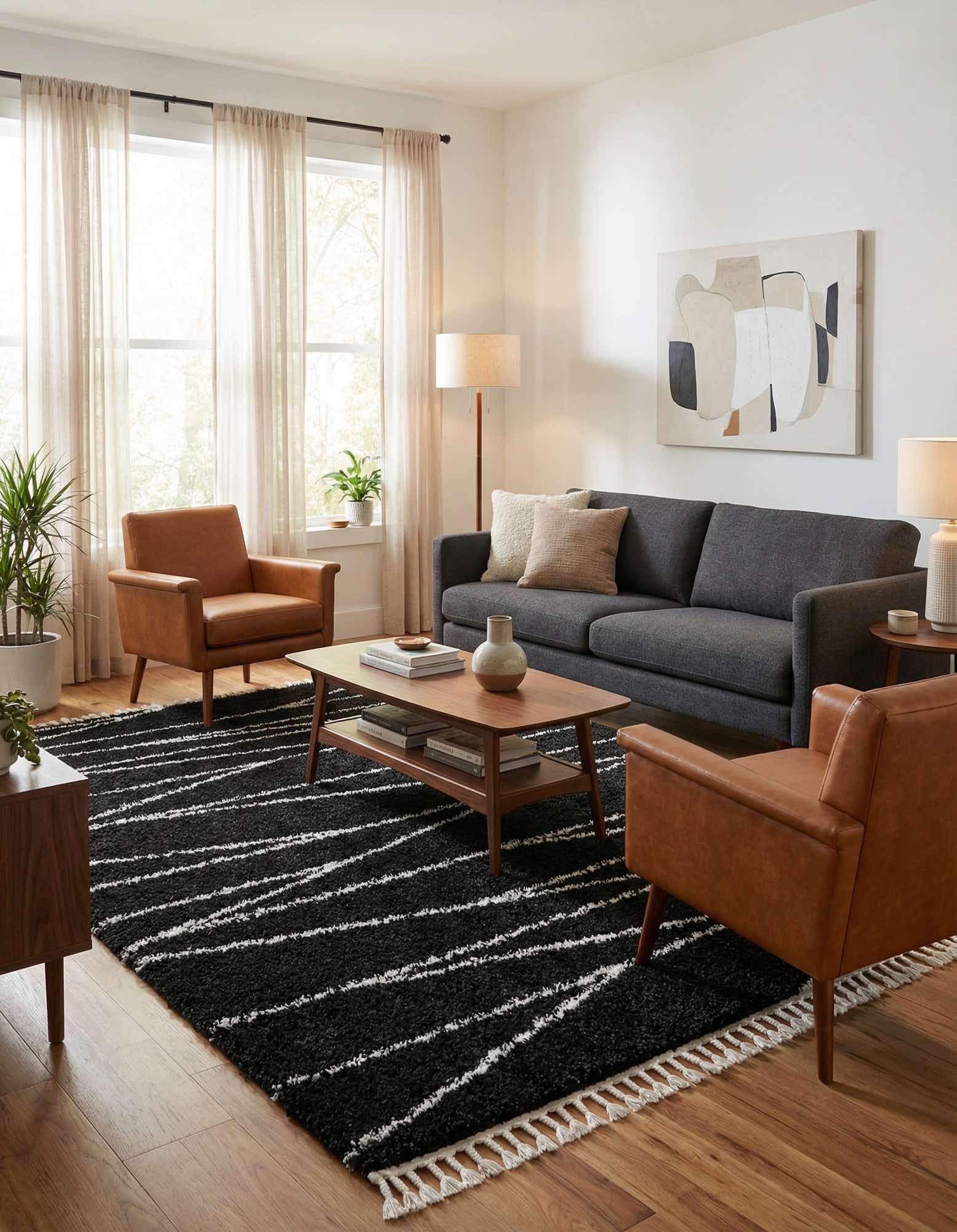 A 9x12 black rectangular shag rug with an abstract white stripe pattern and fringe, perfect for a modern living room.