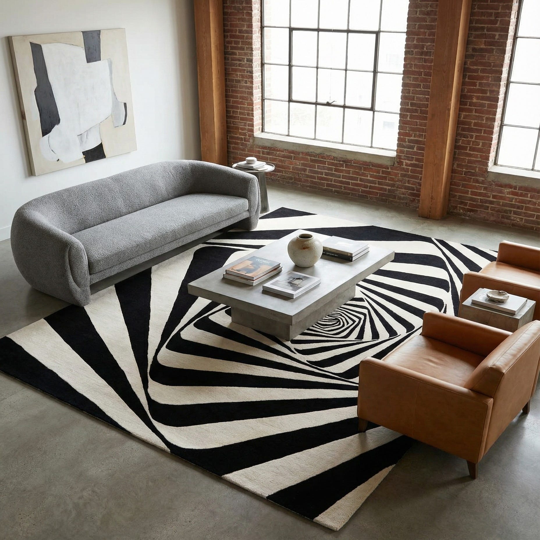 A 9x12 rectangular black and white modern wool rug featuring a mesmerizing optical illusion vortex pattern.