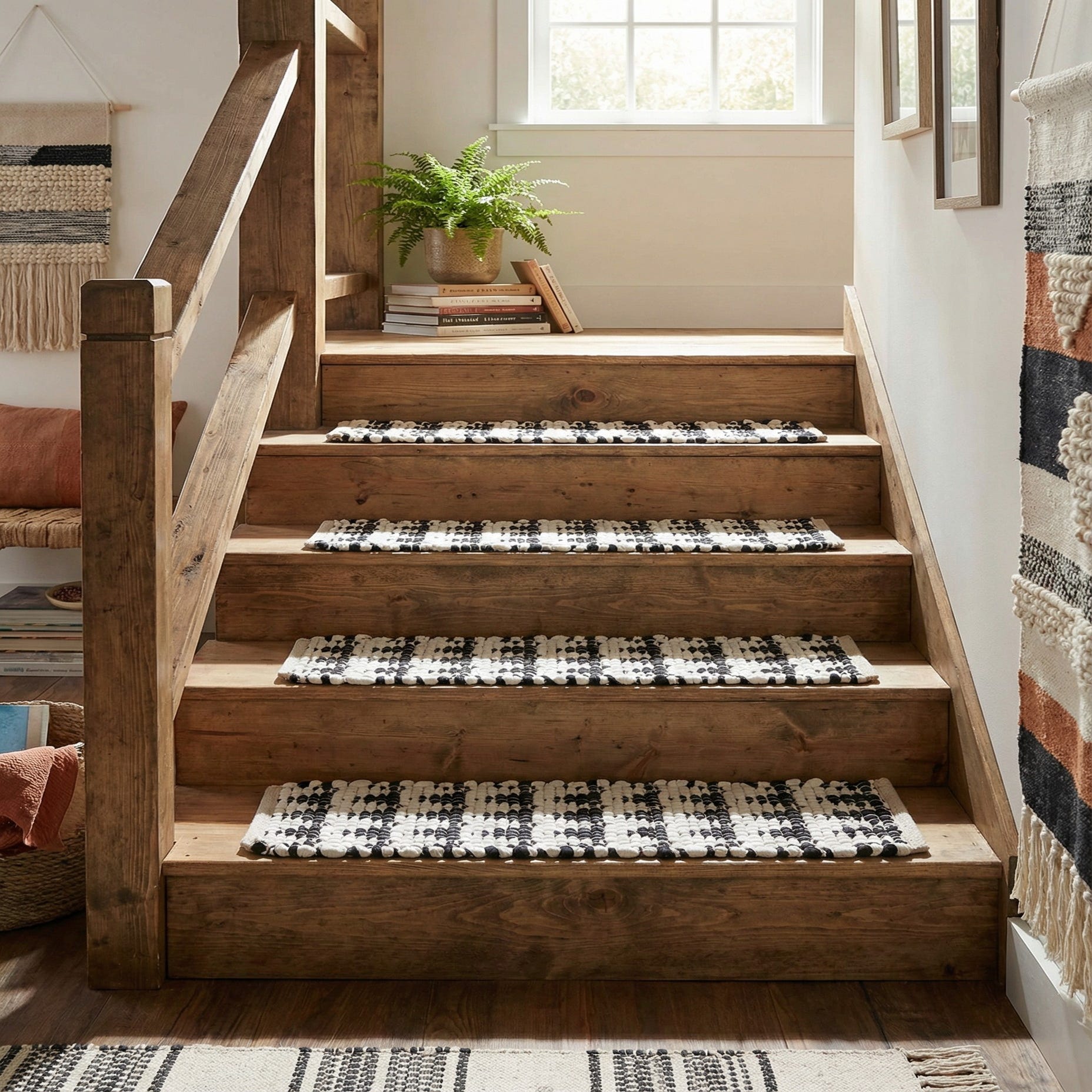 This stair tread works well on wooden staircases where the contrast complements warm wood tones and black metal balusters, and it fits naturally into modern monochrome, Scandinavian, or eclectic farmhouse interiors. Use it to add visual interest to narrow hallways, entryways, or as a layered accent in a casual living space; it also pairs nicely with linen upholstery, matte black fixtures, and woven baskets for a cohesive, textured scheme.