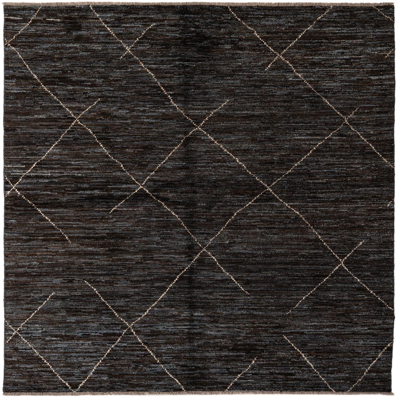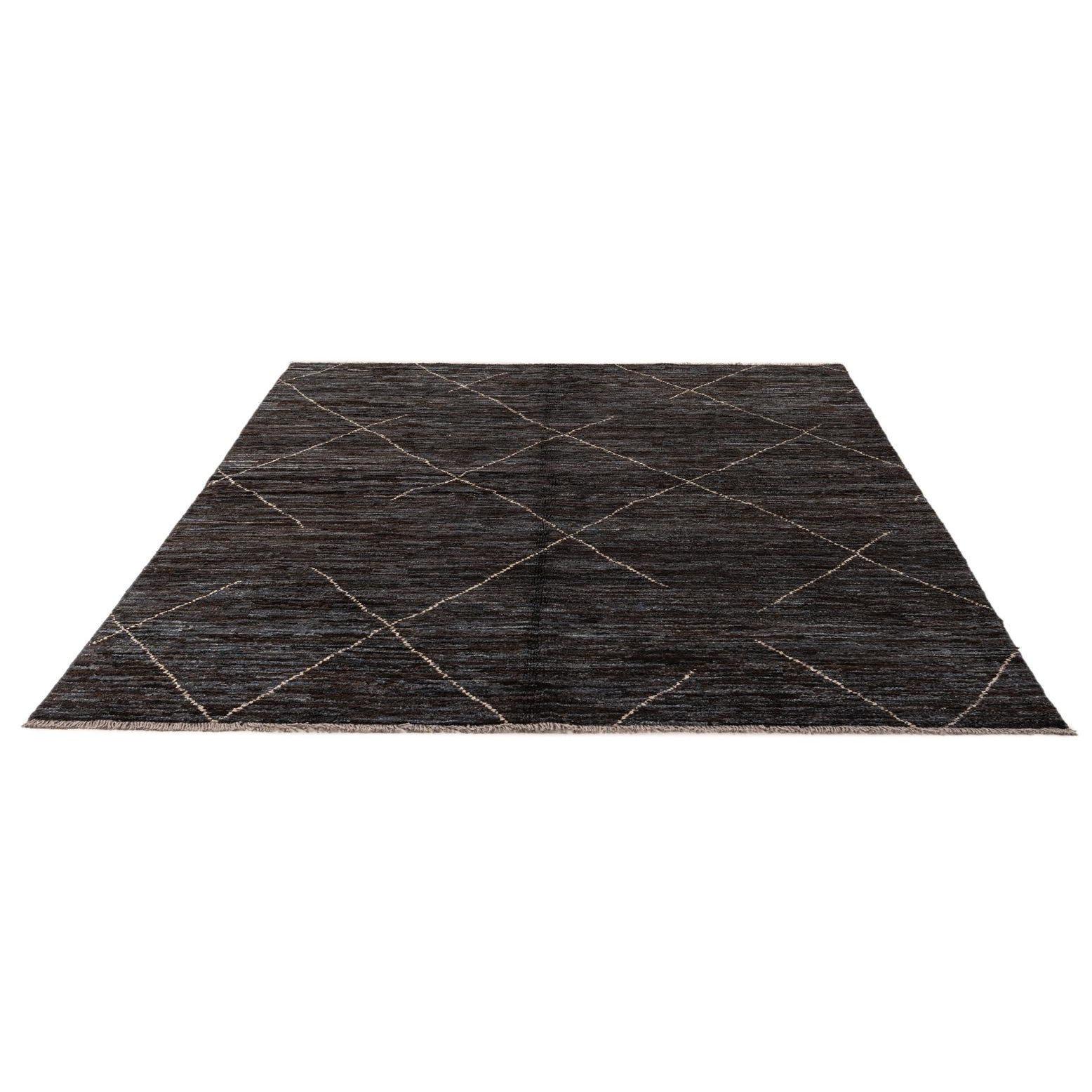 A 5x7 rectangular black and blue wool rug featuring a tribal diamond pattern, ideal for modern indoor spaces.