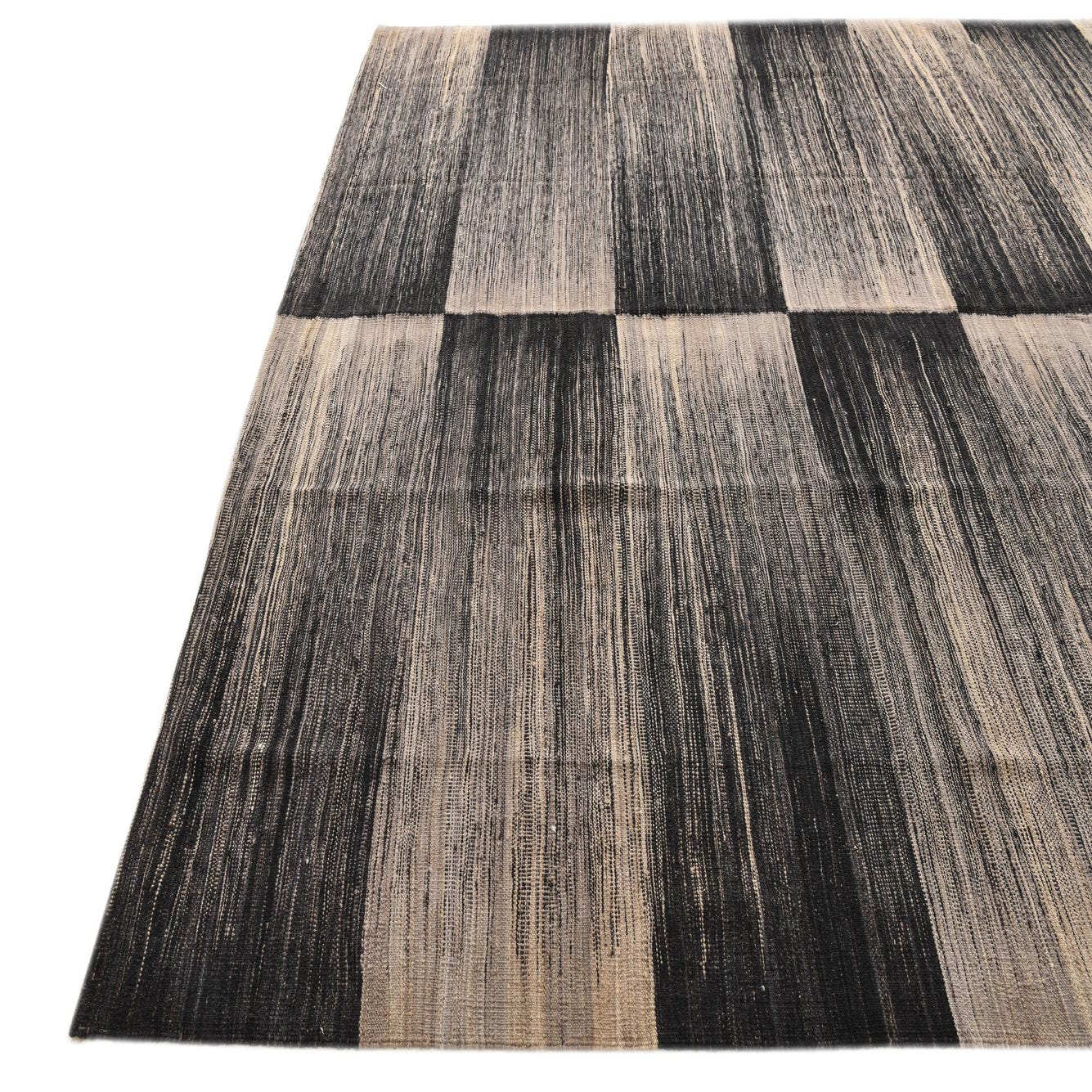 The rug's construction boasts a flatweave texture, which is characteristic of traditional kilim rugs, providing a low-profile surface that fits well in spaces with high foot traffic or under furniture. The combination of dark and light strands within each color block adds depth and character to the rug, making it a captivating centerpiece for any room.