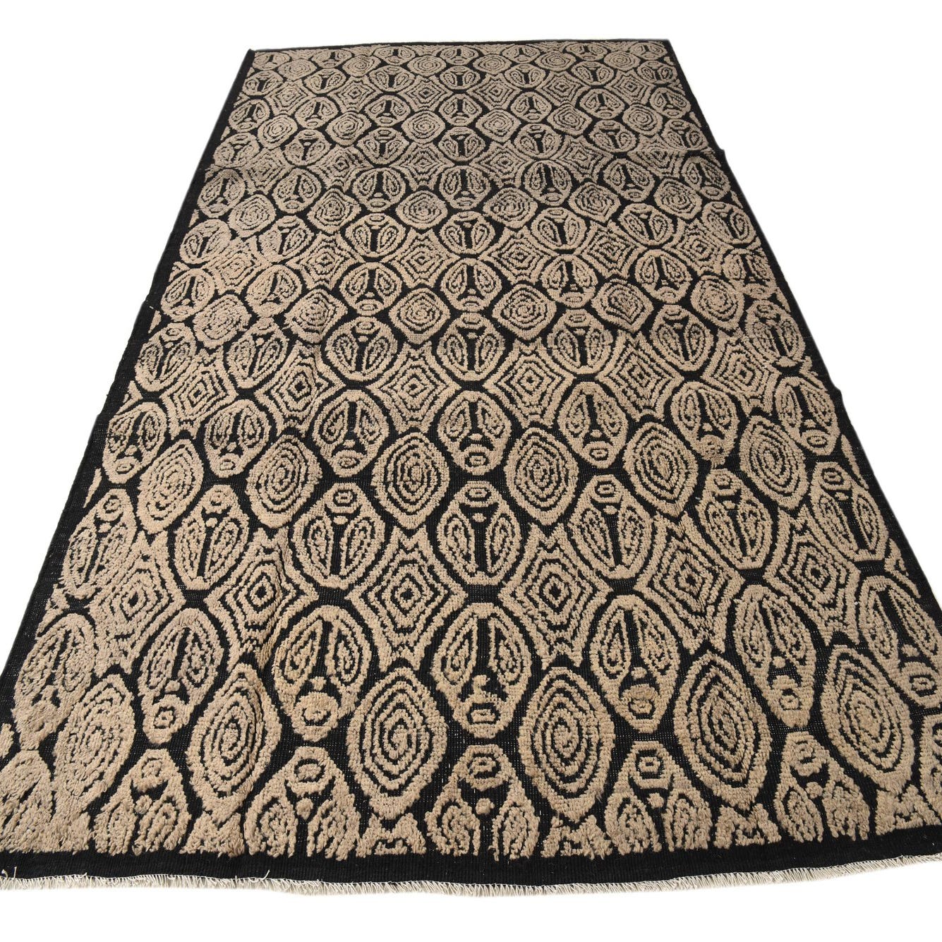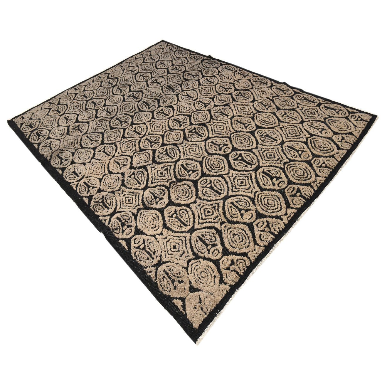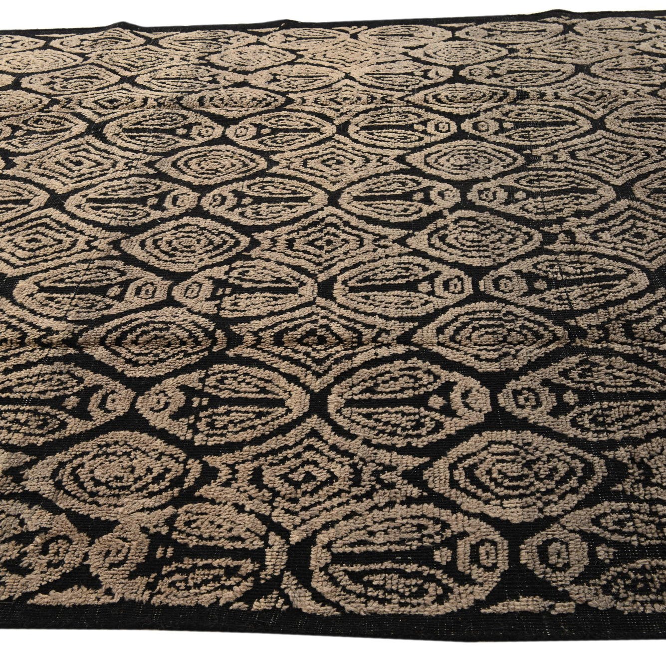 A rectangular 8x11 black and brown wool rug with an abstract, modern oriental pattern featuring textured, interlocking oval and diamond shapes.