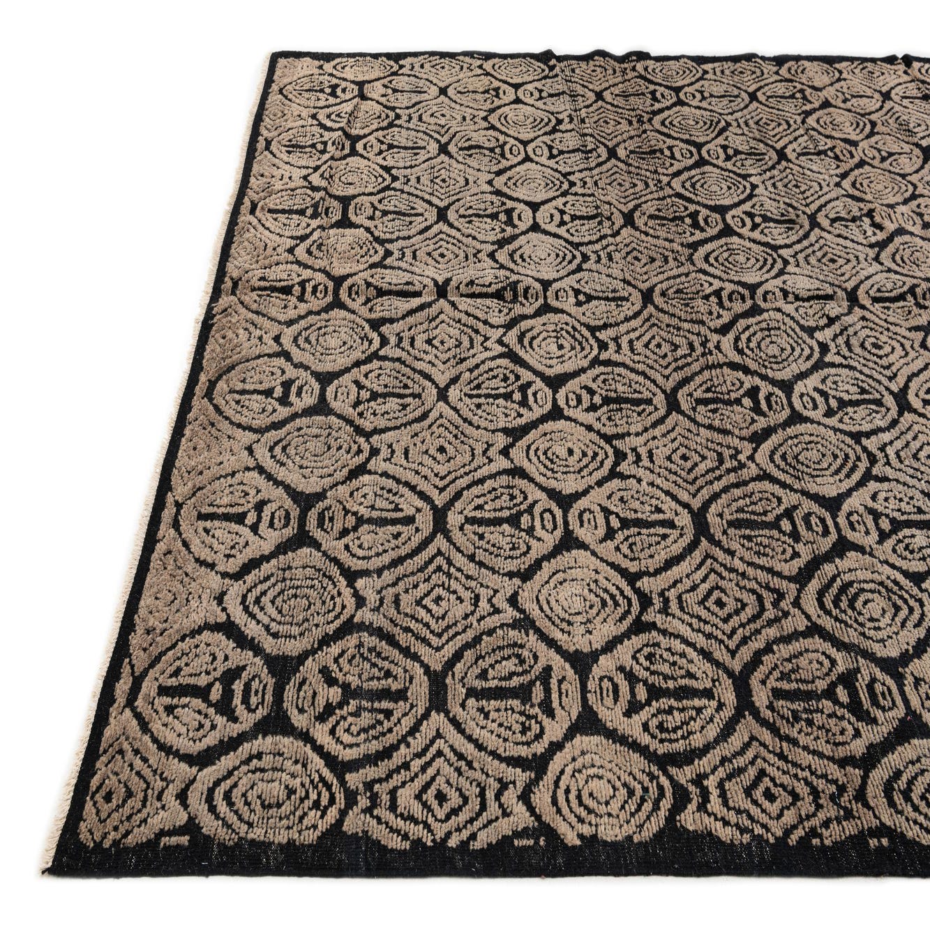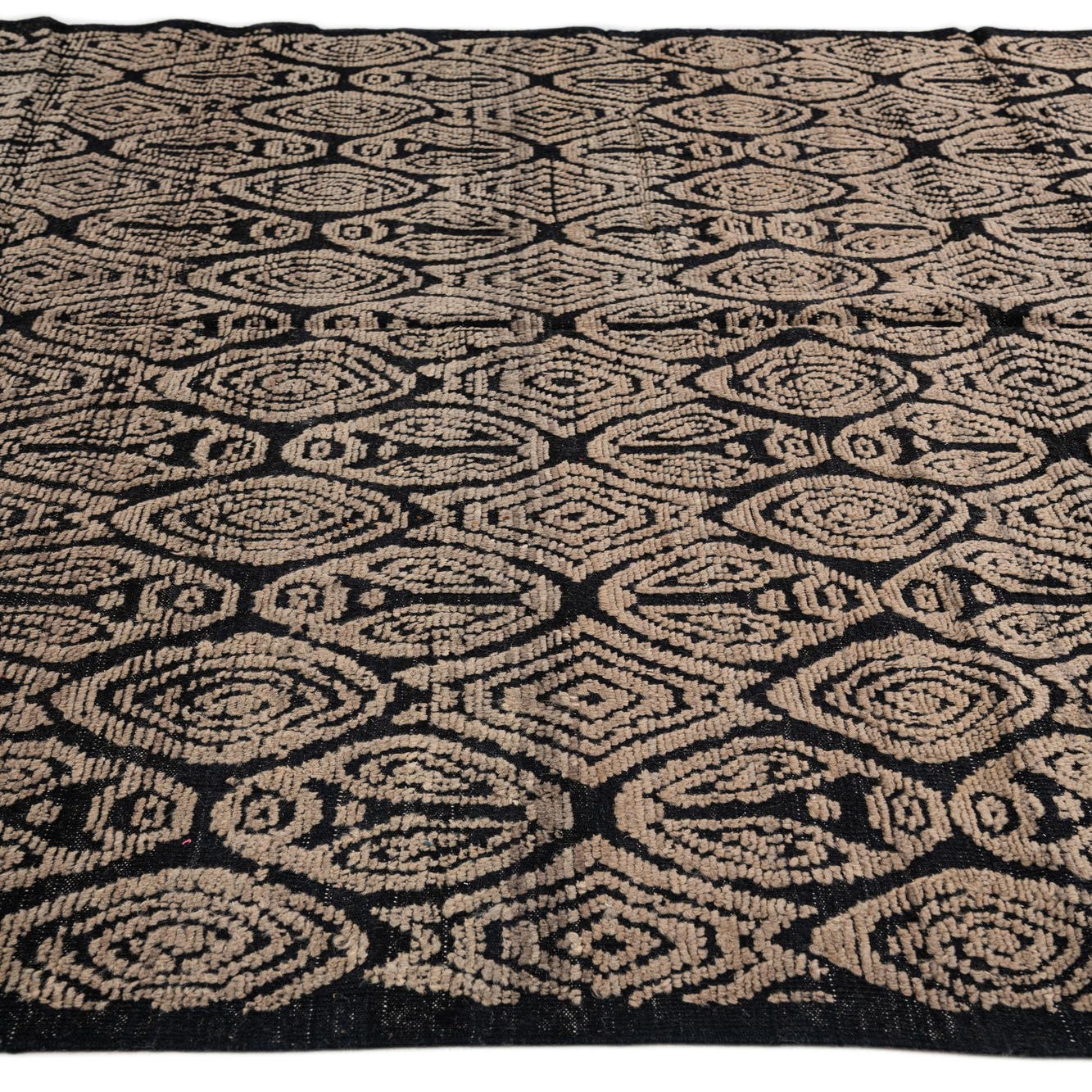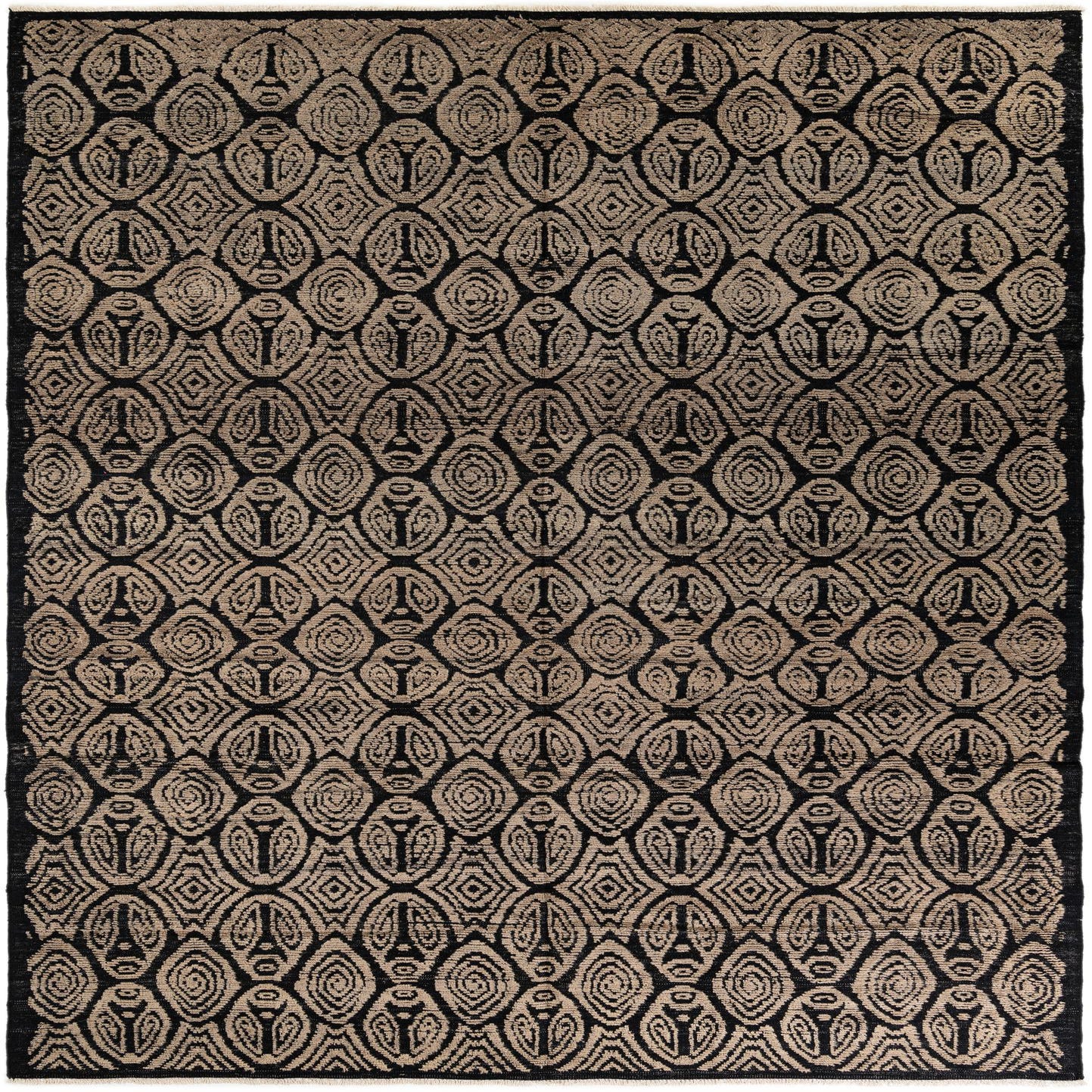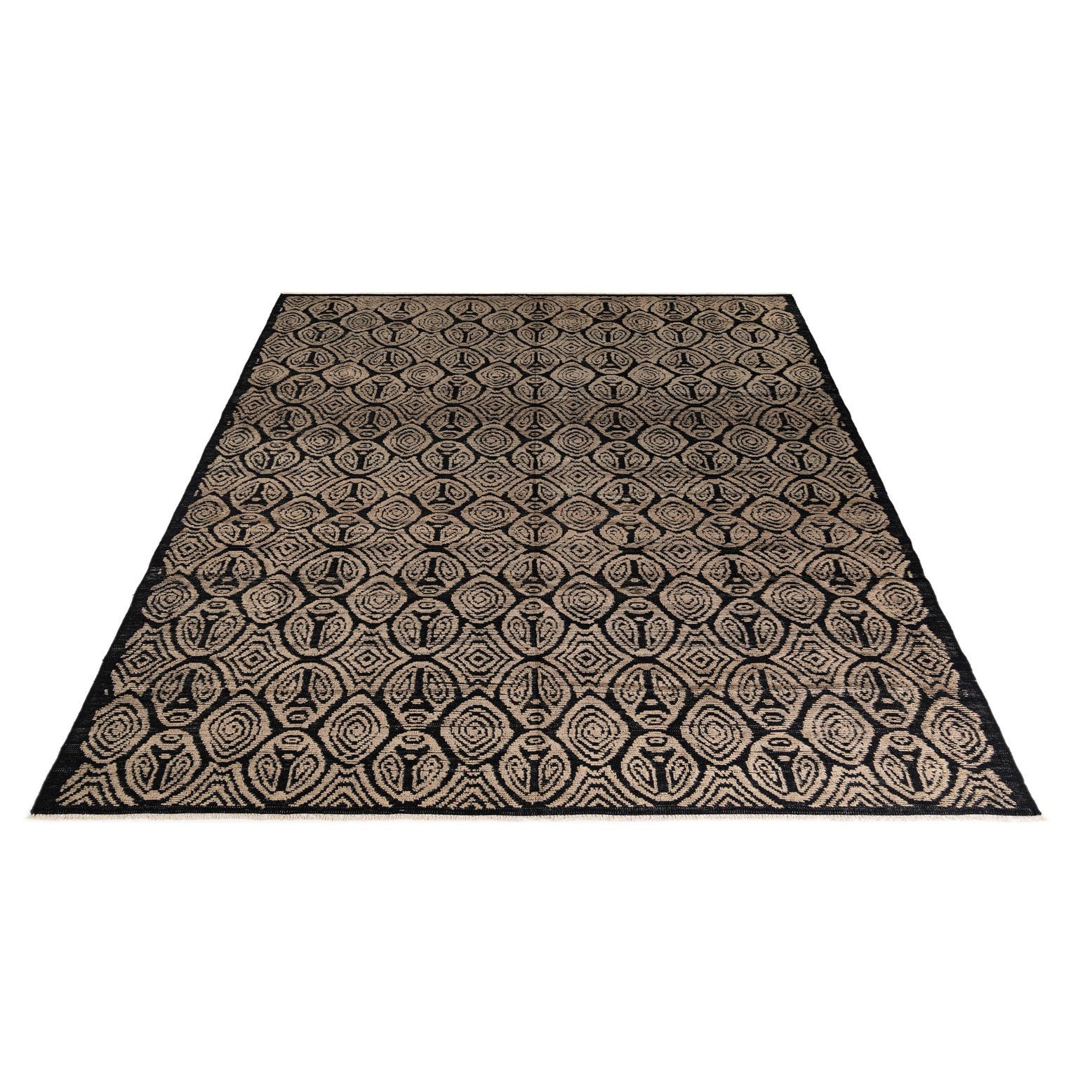 A 9x12 rectangular Darya rug with a modern black and brown geometric pattern, handmade from wool.