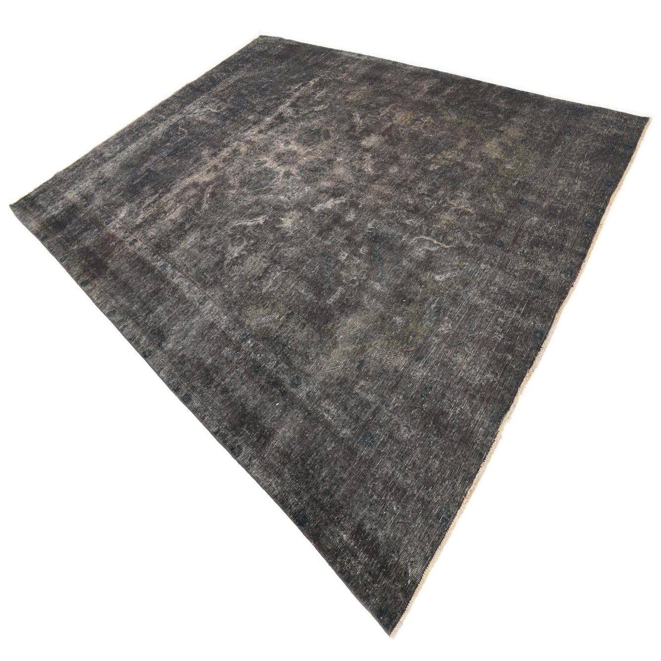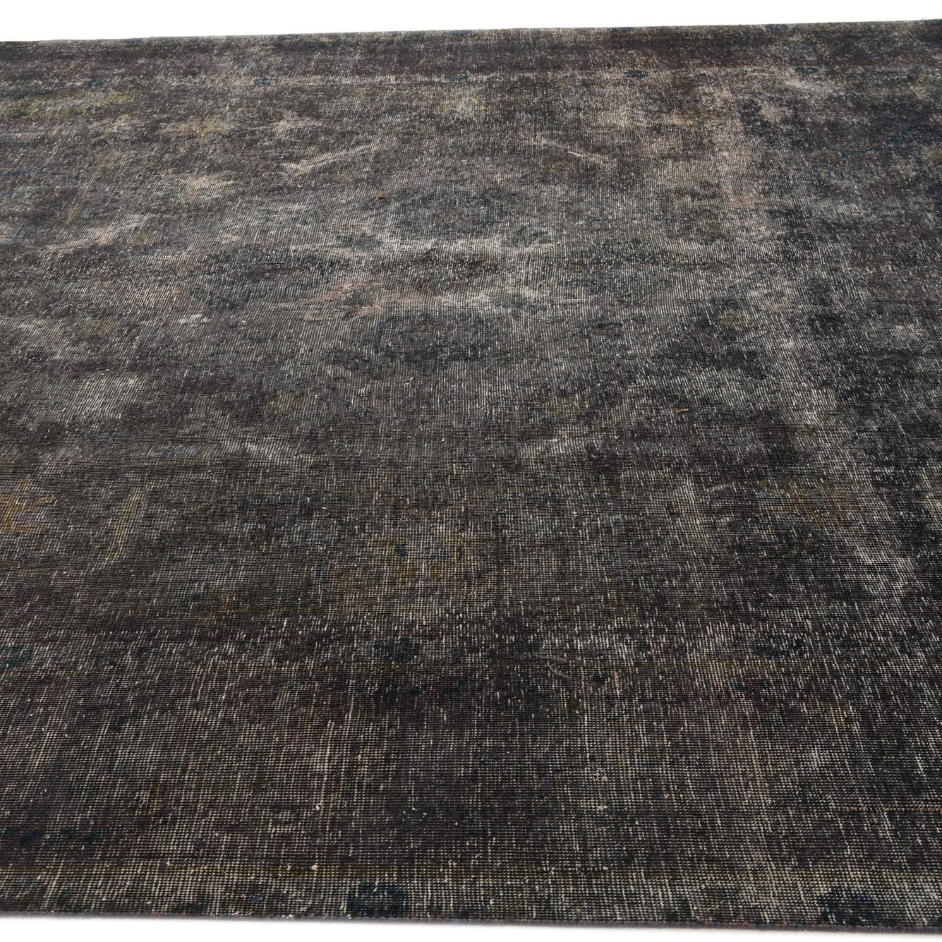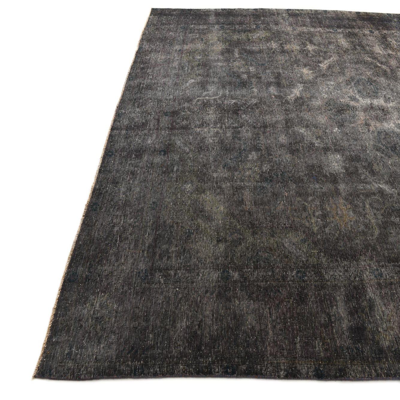 A large 10x13 rectangular Ultra Vintage rug in shades of black and gray with a faded Persian pattern, suitable for a living room.