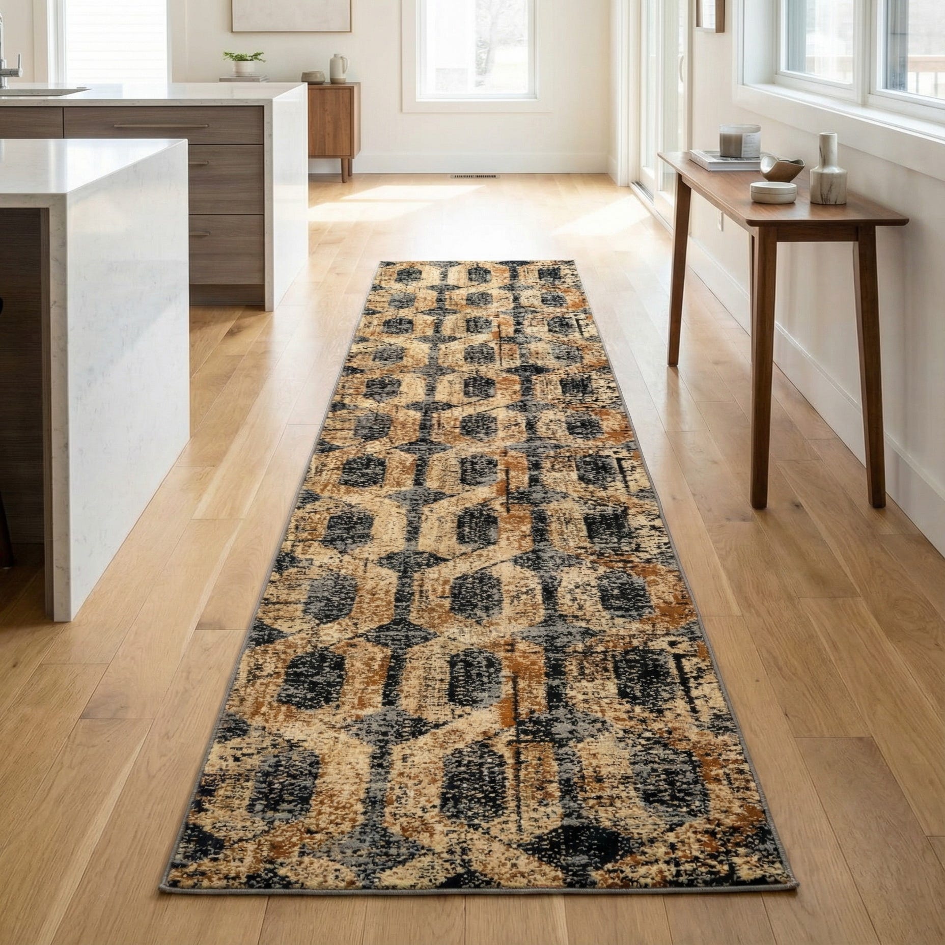 Ideal for long, narrow spaces, this runner anchors hallways, entryways, and kitchen aisles without overwhelming surrounding decor. Pair it with warm wood floors, leather or charcoal upholstery, and matte black or brass hardware to emphasize its contemporary-meets-vintage character, or use it in transitional rooms where mixed materials and layered textures create a cohesive, lived-in look.