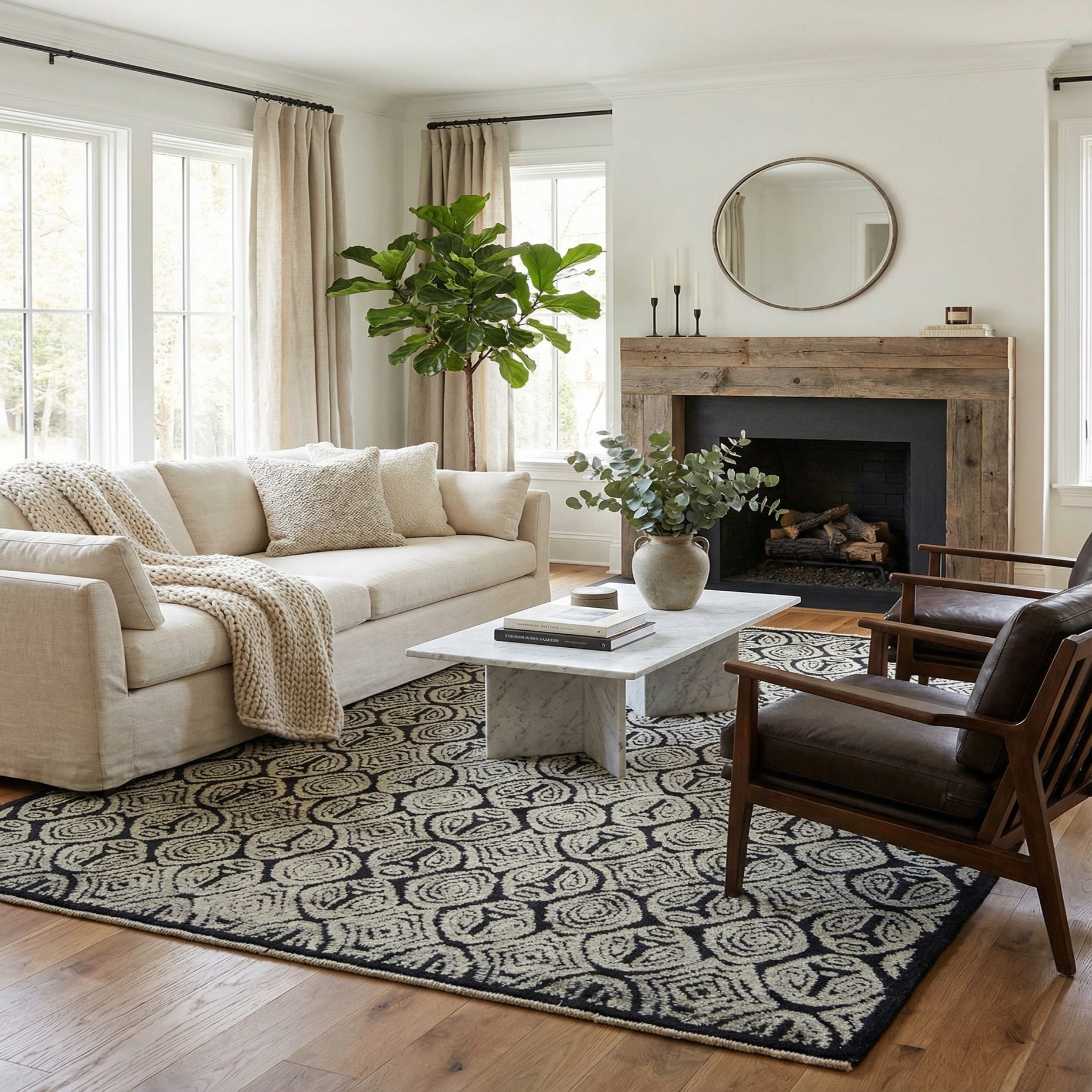 Ideal settings for this piece include a formal living room, an office, or a dining area where its refined pattern can serve as a unifying element for your furniture and accessories. This rug can also serve as a striking contrast in a minimally designed space, where its pattern would stand out as a focal point.