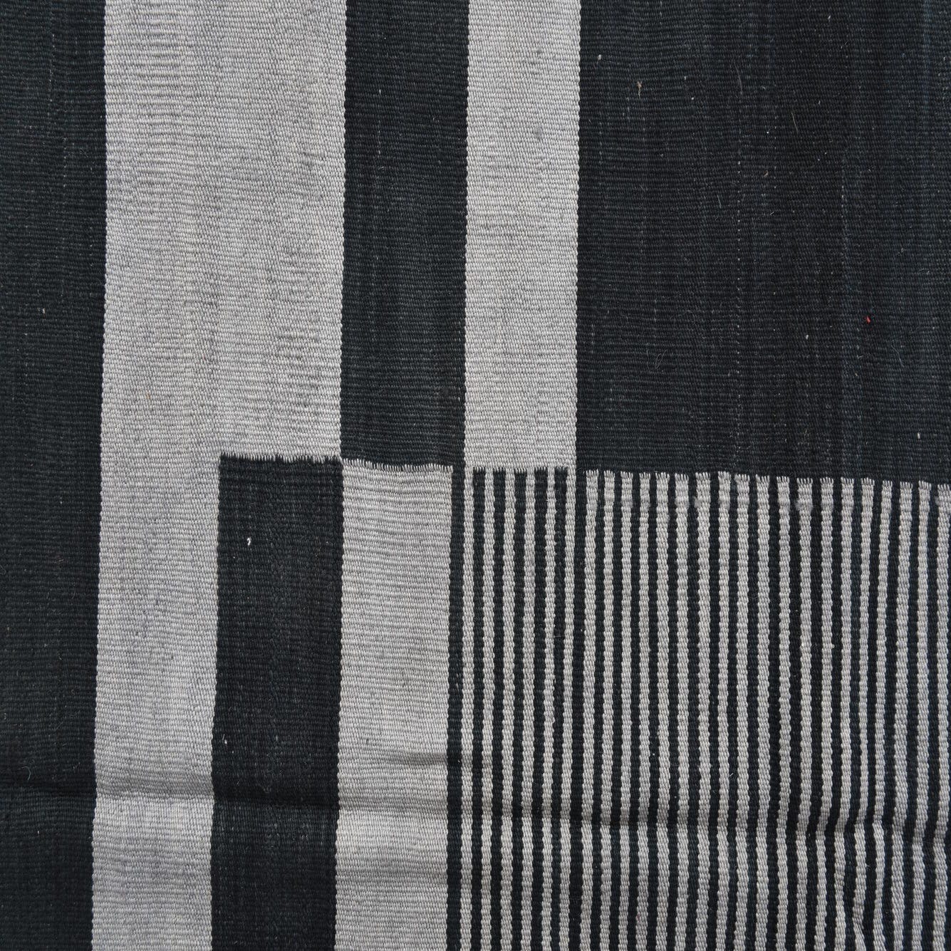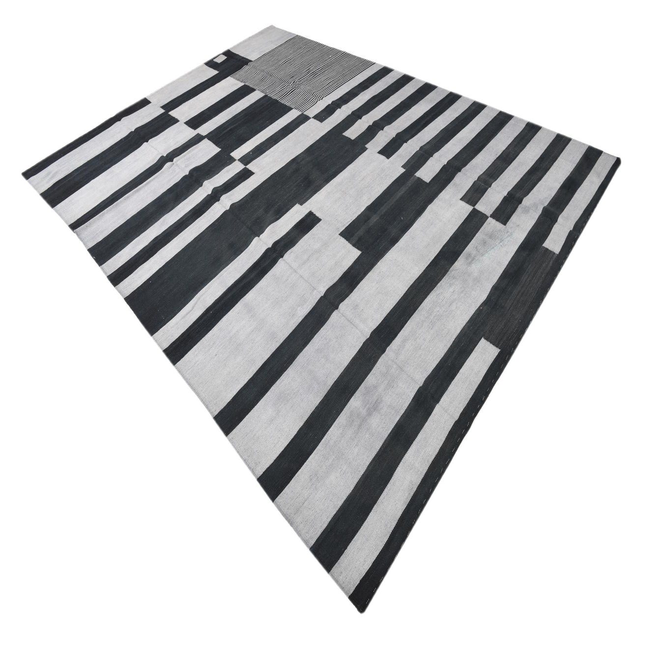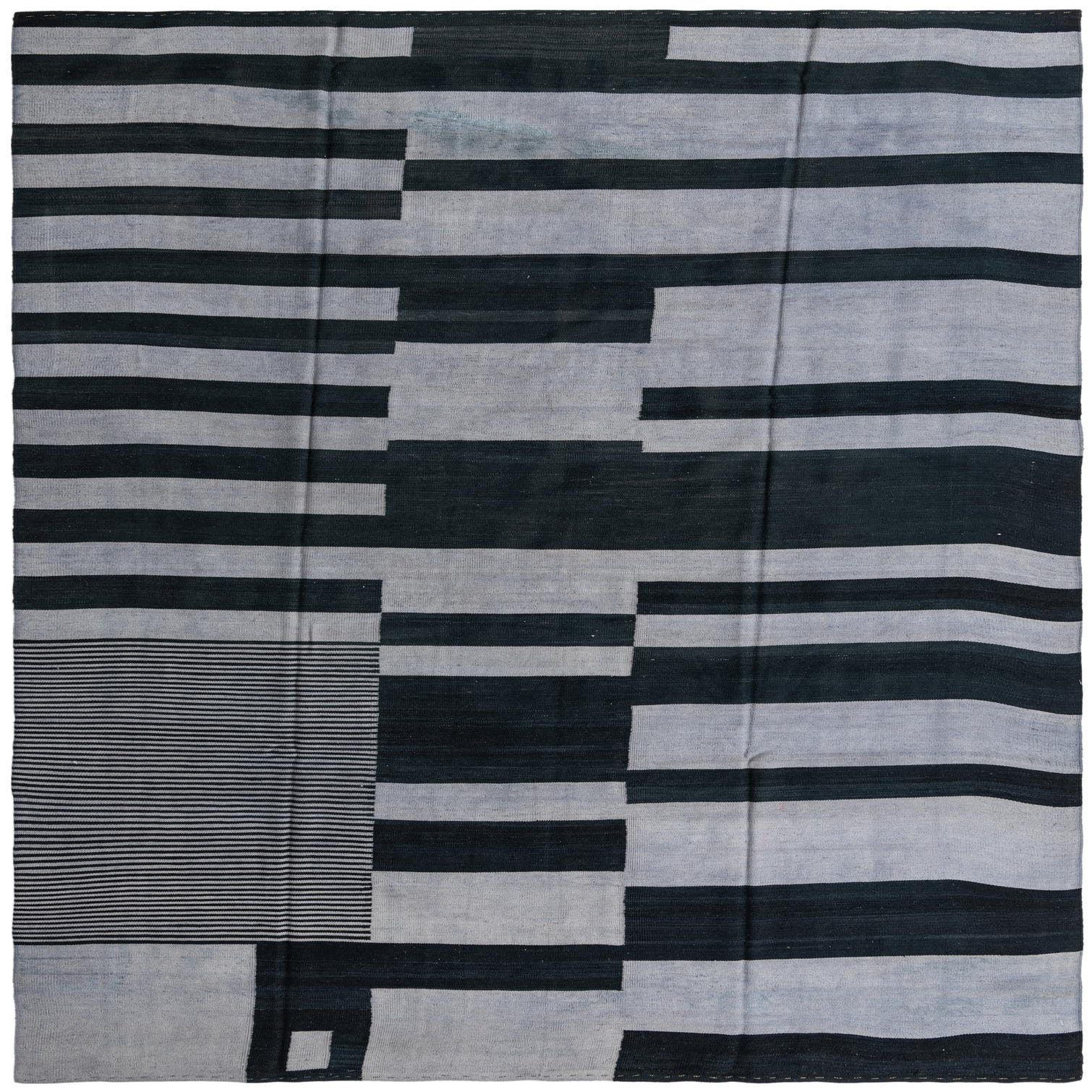 A rectangular 8x11 Kilim Modern rug featuring a bold tribal stripe pattern in varying shades of black and gray.