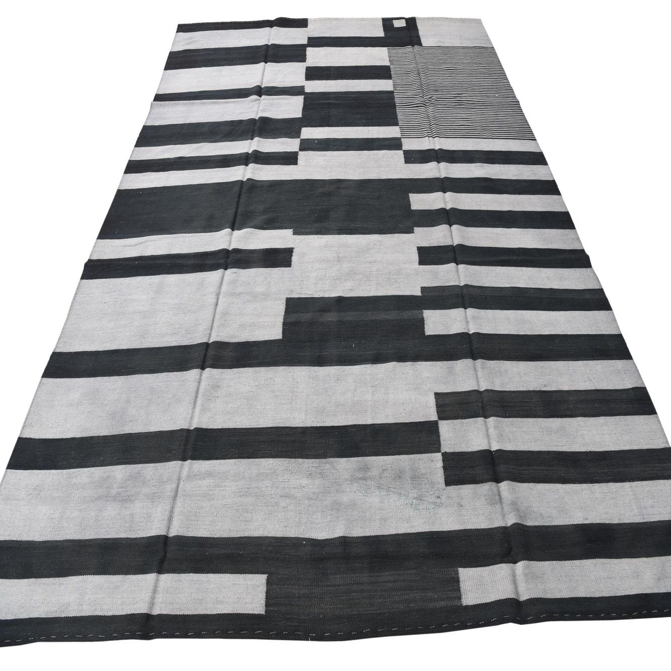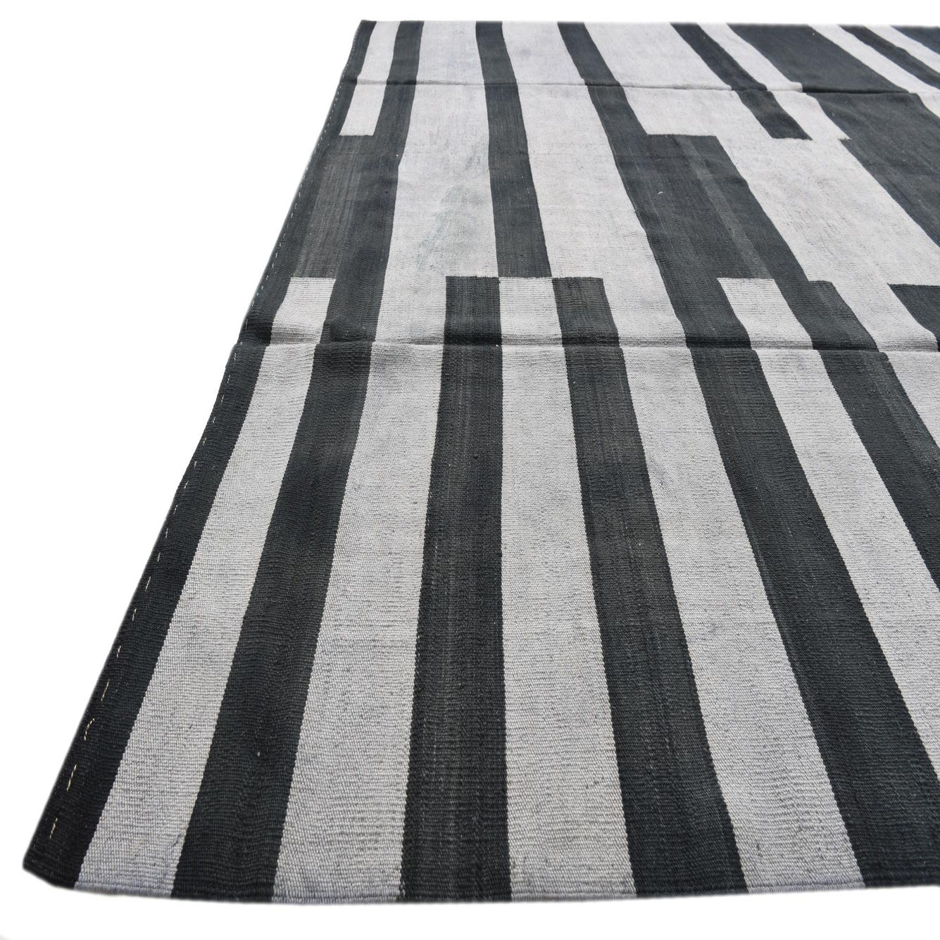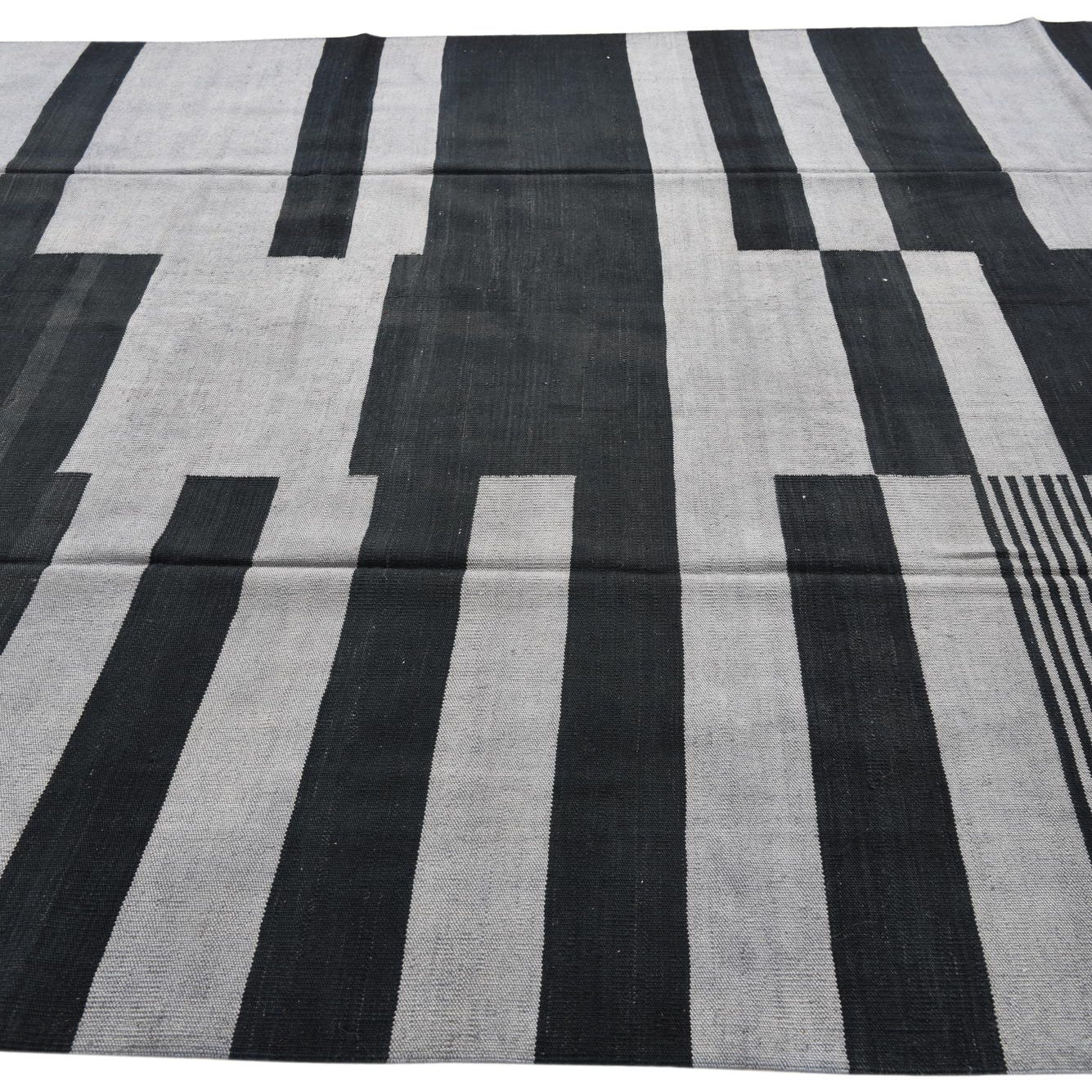 A rectangular 8x11 Kilim Modern rug featuring a bold tribal stripe pattern in varying shades of black and gray.