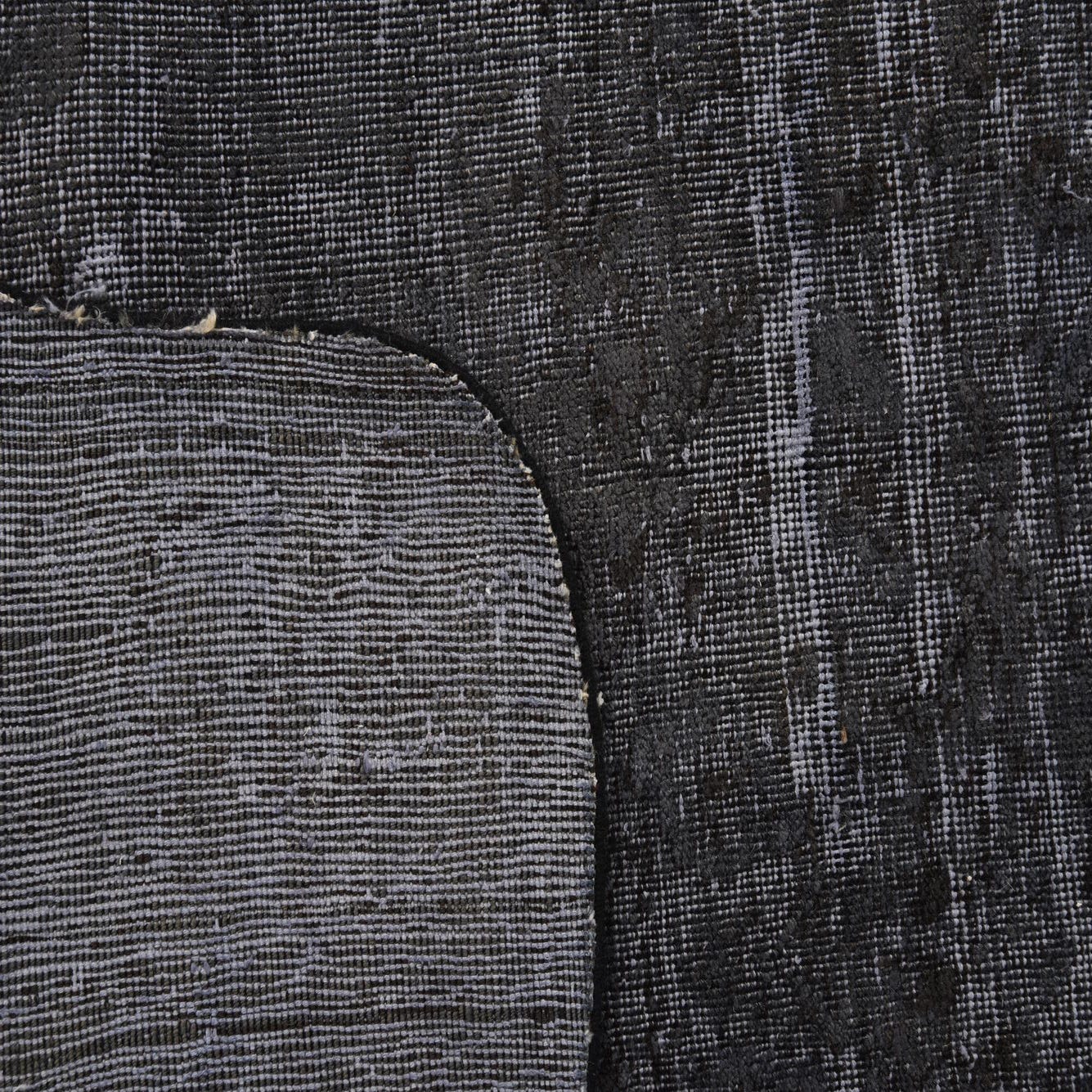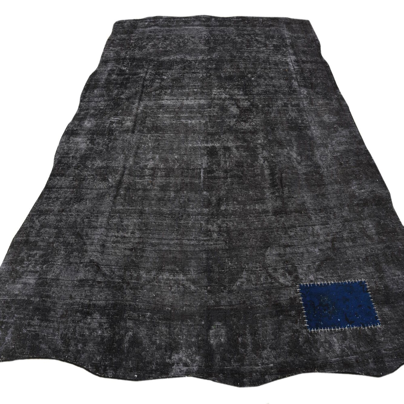 8x11 rectangular Ultra Vintage wool rug in black and gray with a distressed Persian pattern and a vibrant blue patch.