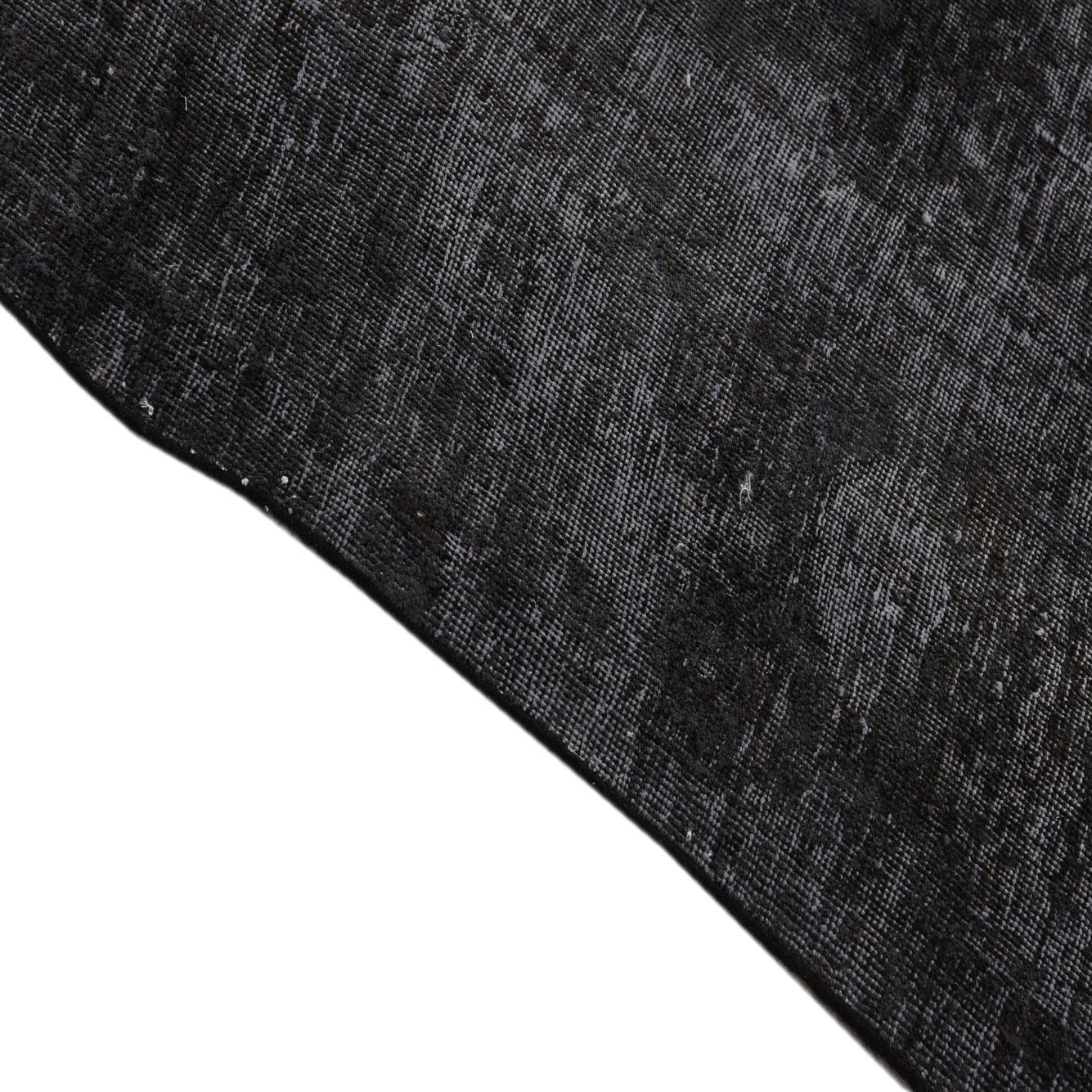 The rug showcases a black-gray background with a subtle, distressed pattern that hints at antique motifs. The texture is rich and varied, a characteristic of its handcrafted quality. Adding to its authentic vintage appeal is the presence of fringe on the edges, providing an extra touch of elegance.