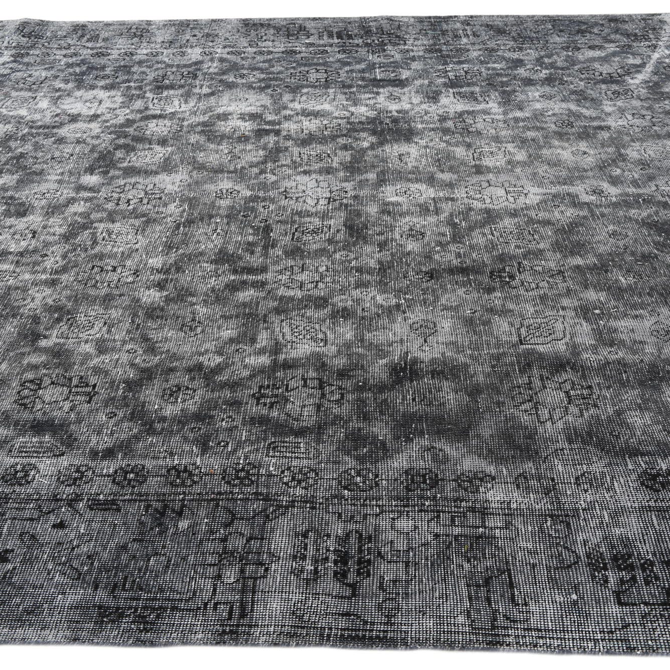 A 9x12 rectangular black and gray vintage Persian wool rug with an abstract, distressed pattern, suitable for a living room.