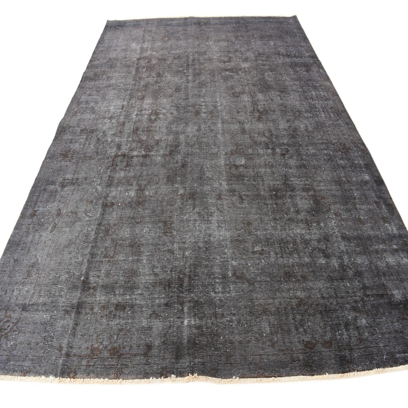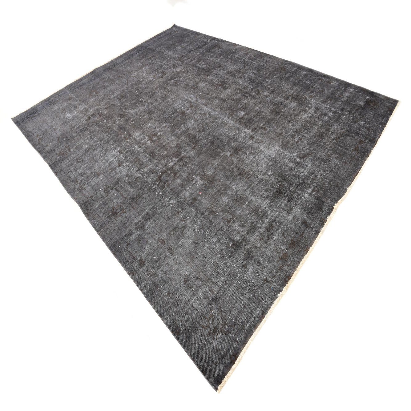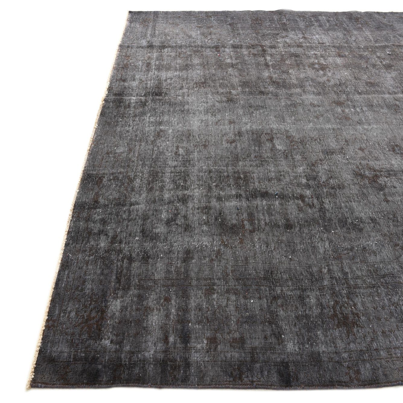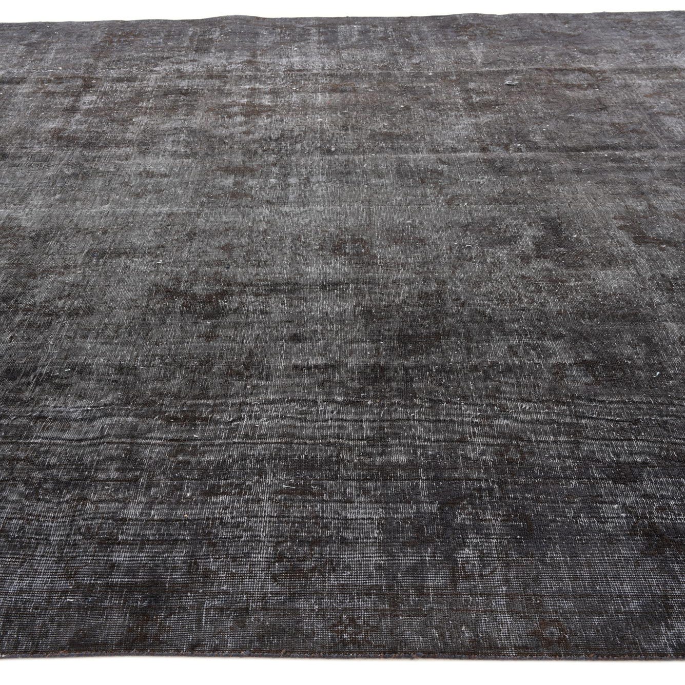 A 9x12 rectangular black and gray vintage Persian wool rug with a distressed, abstract pattern.