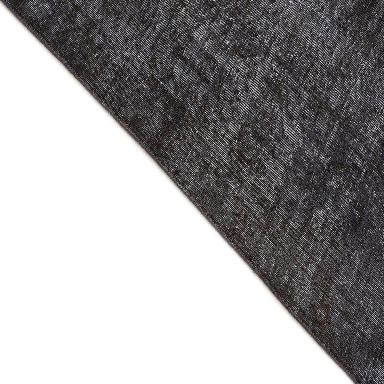 The Ultra Vintage collection presents a hand-knotted 9x12 area rug, crafted with 100% wool, offering durability and a plush feel. The design features a subtle, distressed look with a black-gray background and hints of ivory overlaid in a nuanced, erased pattern that provides depth and character without overwhelming the aesthetic.