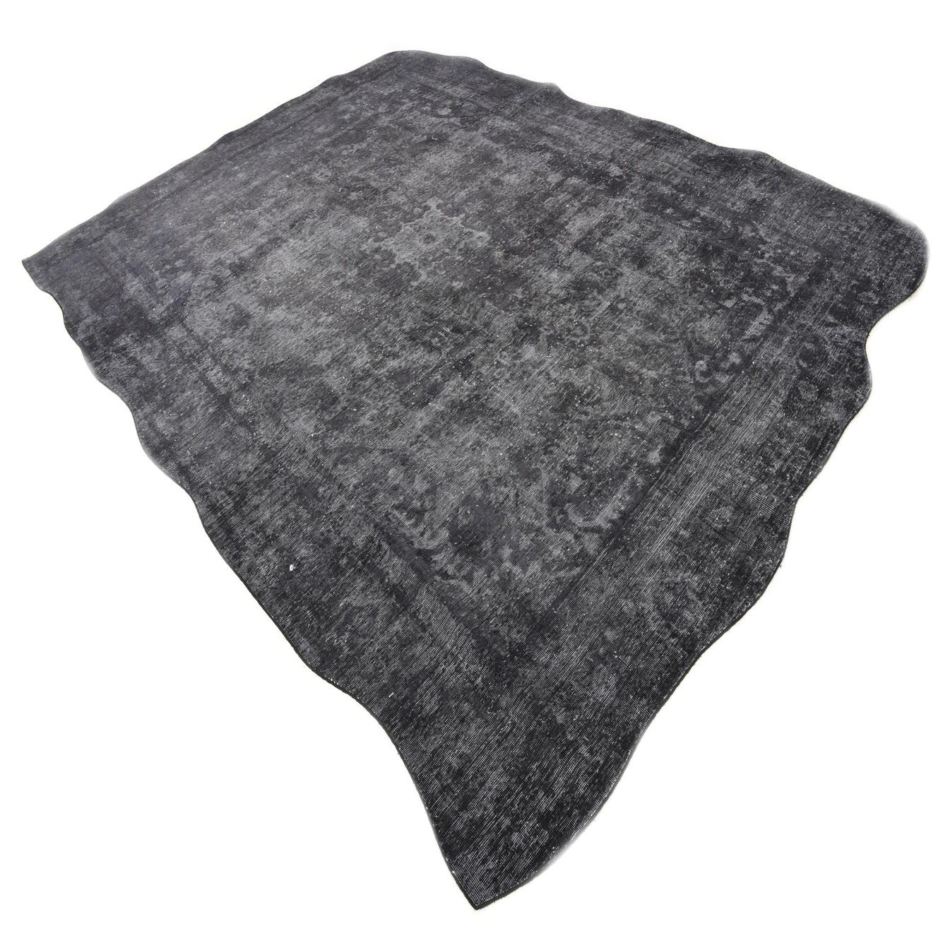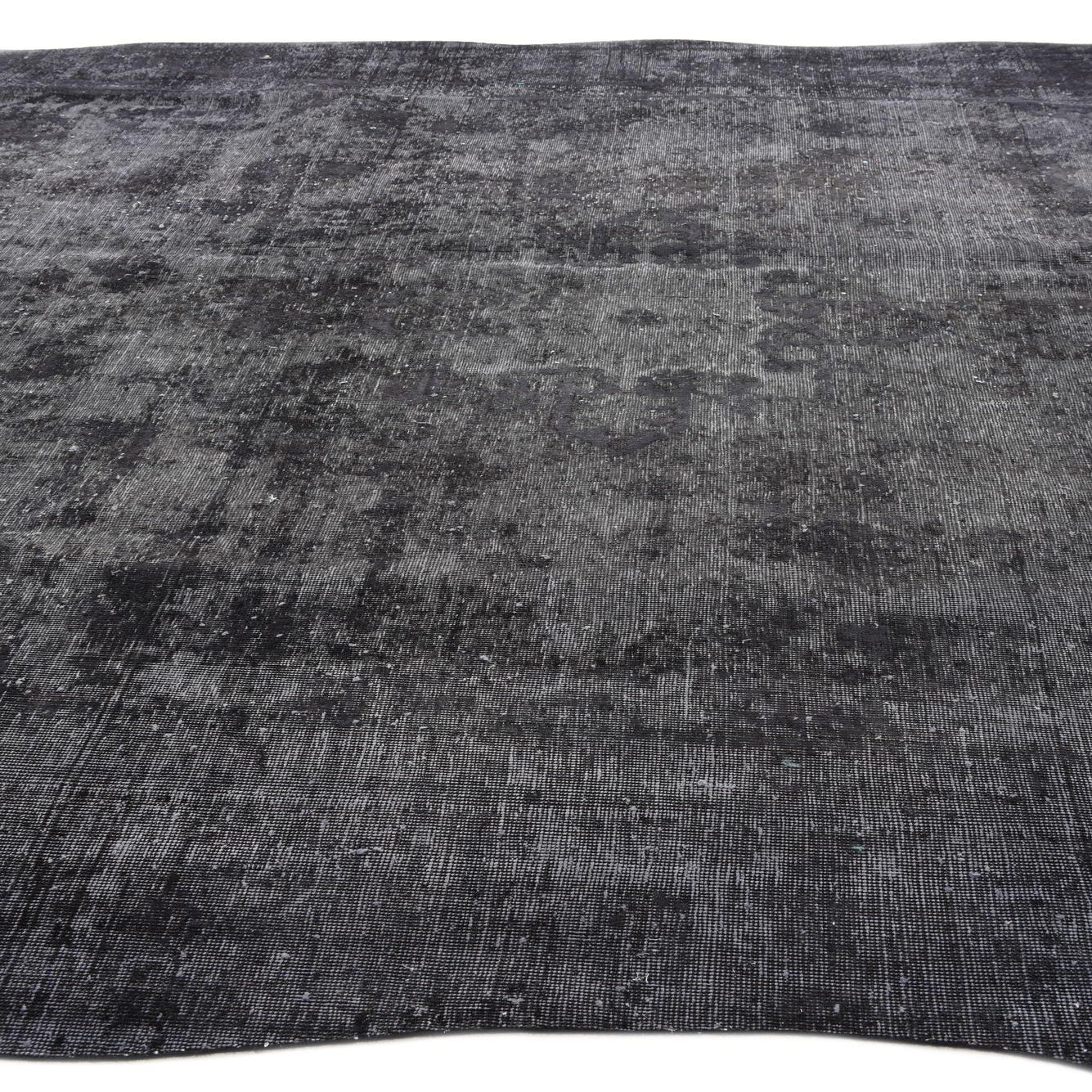 A 9x12 rectangular black and gray vintage Persian wool rug with an abstract, distressed pattern, suitable for a living room.