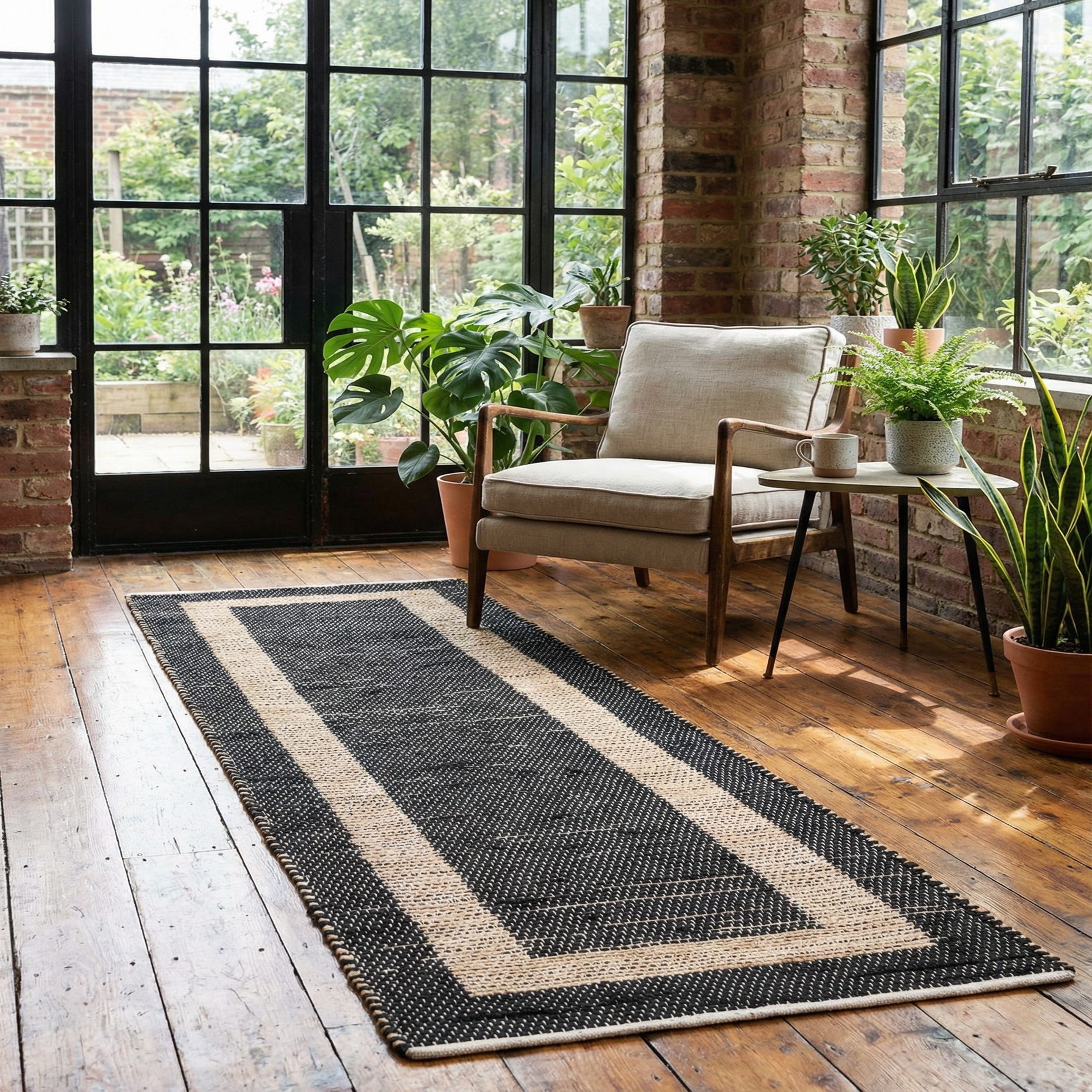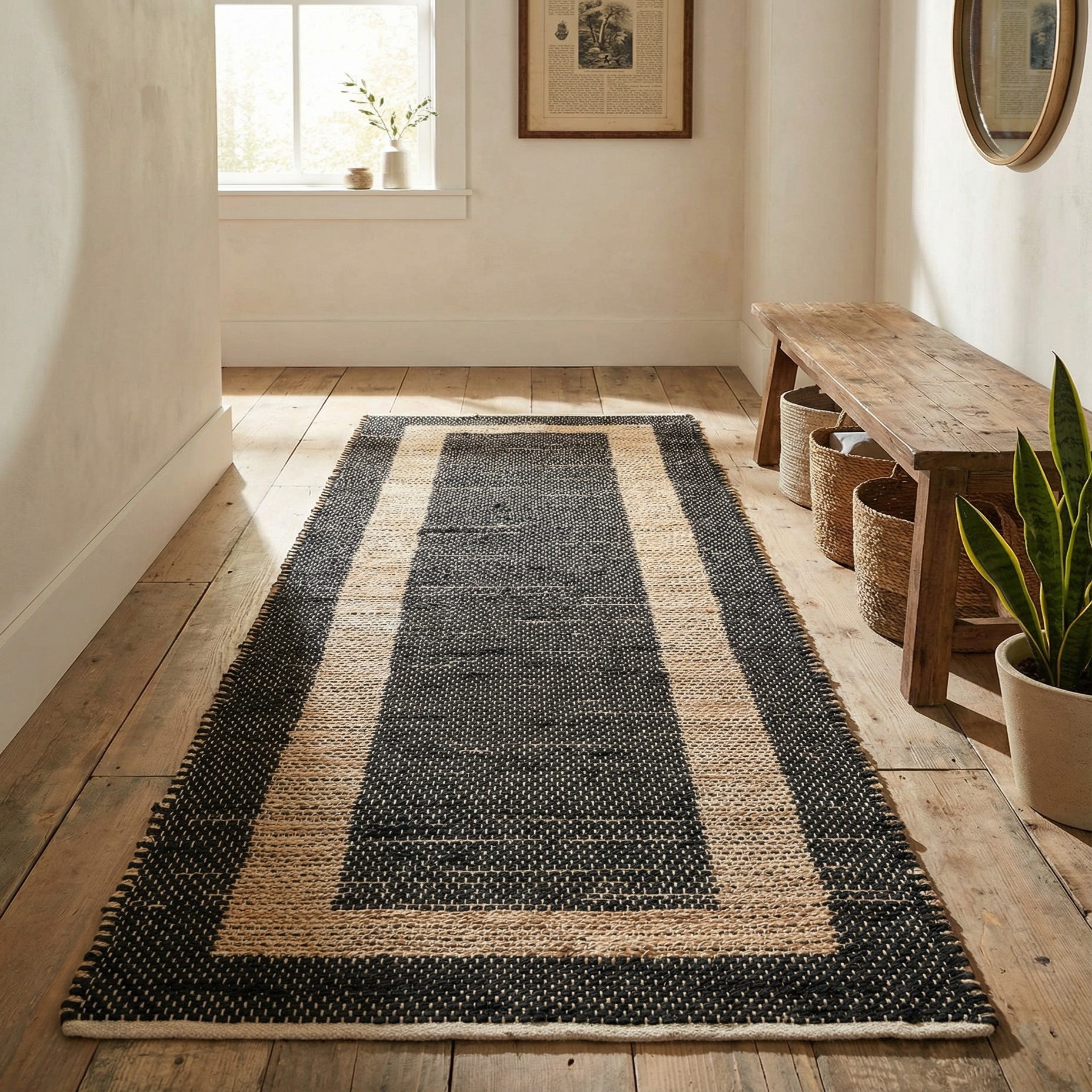 A strong graphic border defines the look of this hand-woven runner: a deep Black-Natural field framed by a wide, rectangular band of natural jute that creates a clean, architectural silhouette. The weave is flat and low-profile, with the natural slub of jute adding a slightly nubby, tactile surface while the cotton content softens the feel underfoot. Contrasting stitching along the edges reinforces the border and gives the piece a crafted, casual character.