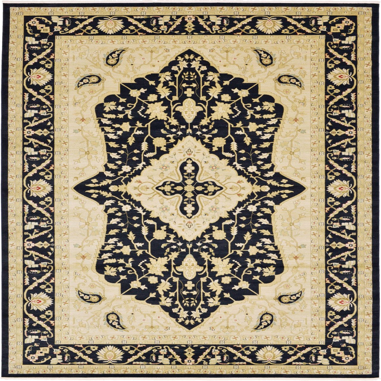 Primary color is Black. Colors in this rug include: Black, Cream, Light Blue, Light Brown, Rust Red.