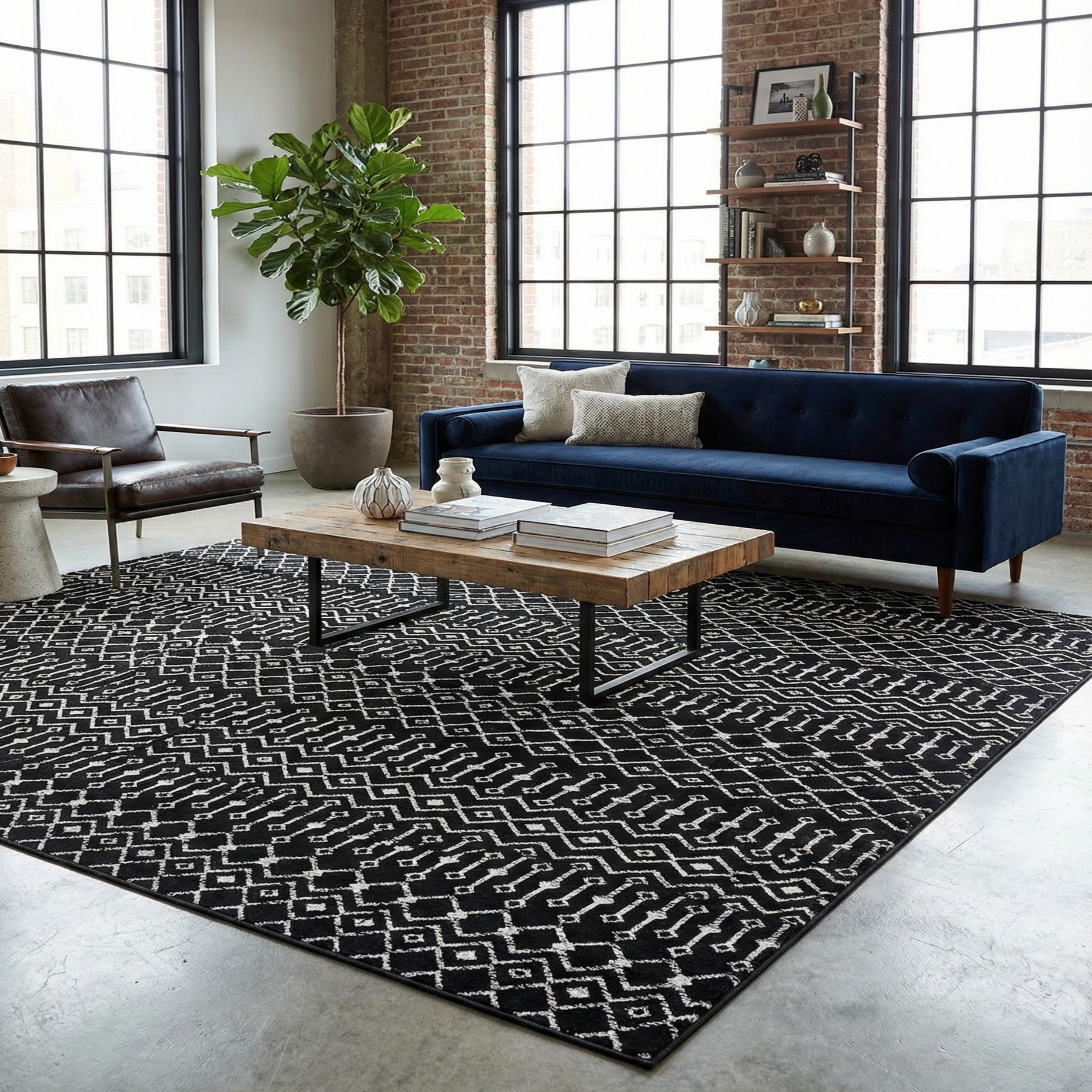 This rug fits well in modern, transitional, and industrial interiors where high-contrast pieces anchor the room. Place it beneath a coffee table to define a seating area, use it in a monochrome entry to make a clear design statement, or layer it with warm woods and brass accents to balance softer furnishings. Its graphic pattern pairs nicely with leather sofas, clean-lined furniture, and simple textiles for a composed, contemporary look.