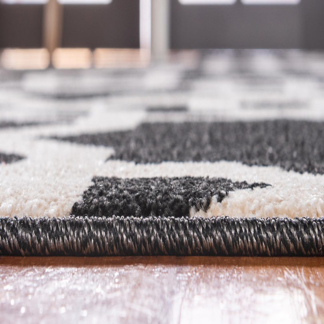 Primary color is Black. Colors in this rug include: Black, Beige.