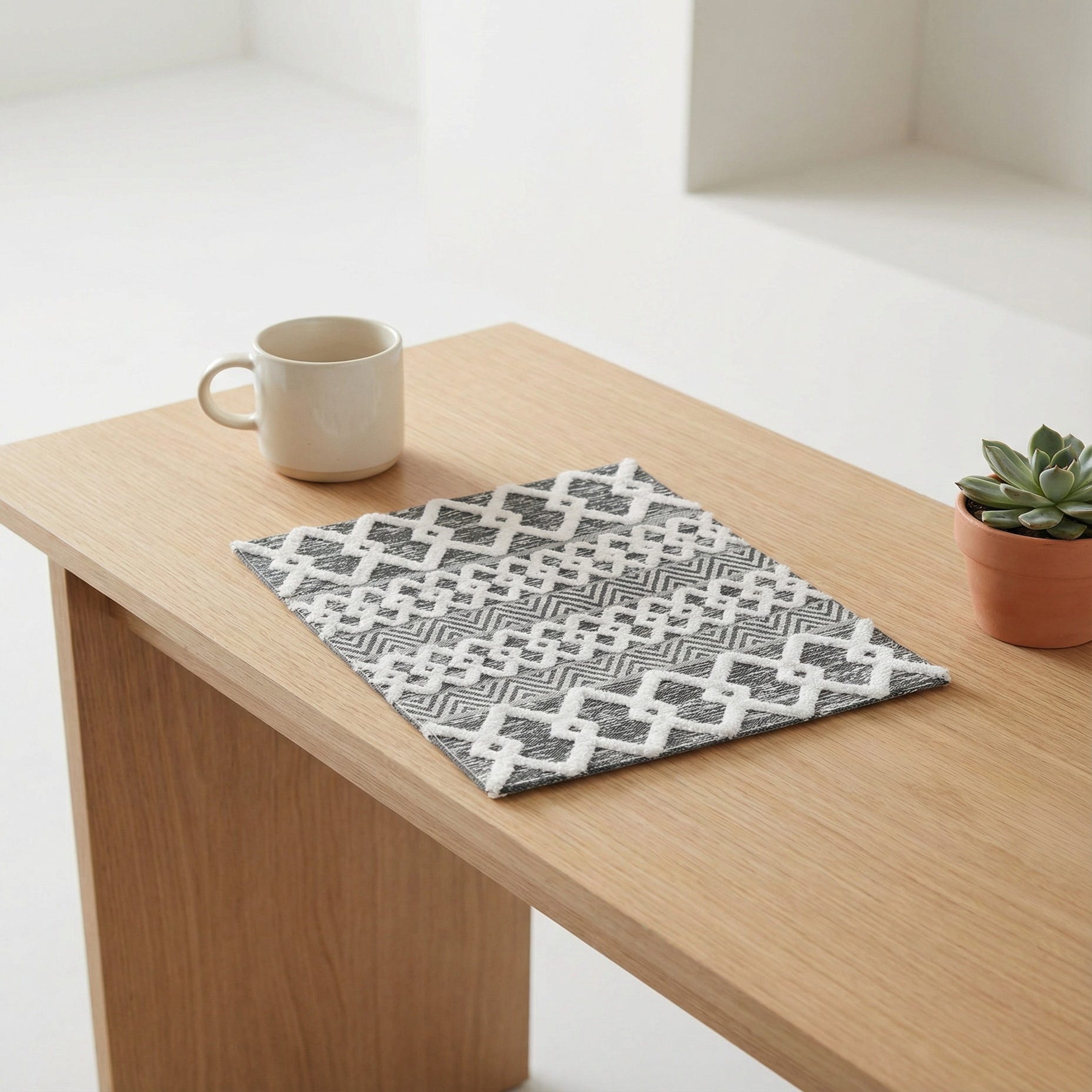 This rug works well where a graphic, monochrome layer is needed — under a coffee table in a living room, at the foot of a bed, or in a home office or reading nook to ground neutral furnishings. Pair it with light or natural wood tones and matte metal accents for a contemporary look, or layer it with textured throws and woven baskets for a modern-bohemian feel. This sample brings pattern and texture without overwhelming a space, making it easy to coordinate with a range of décor styles.
