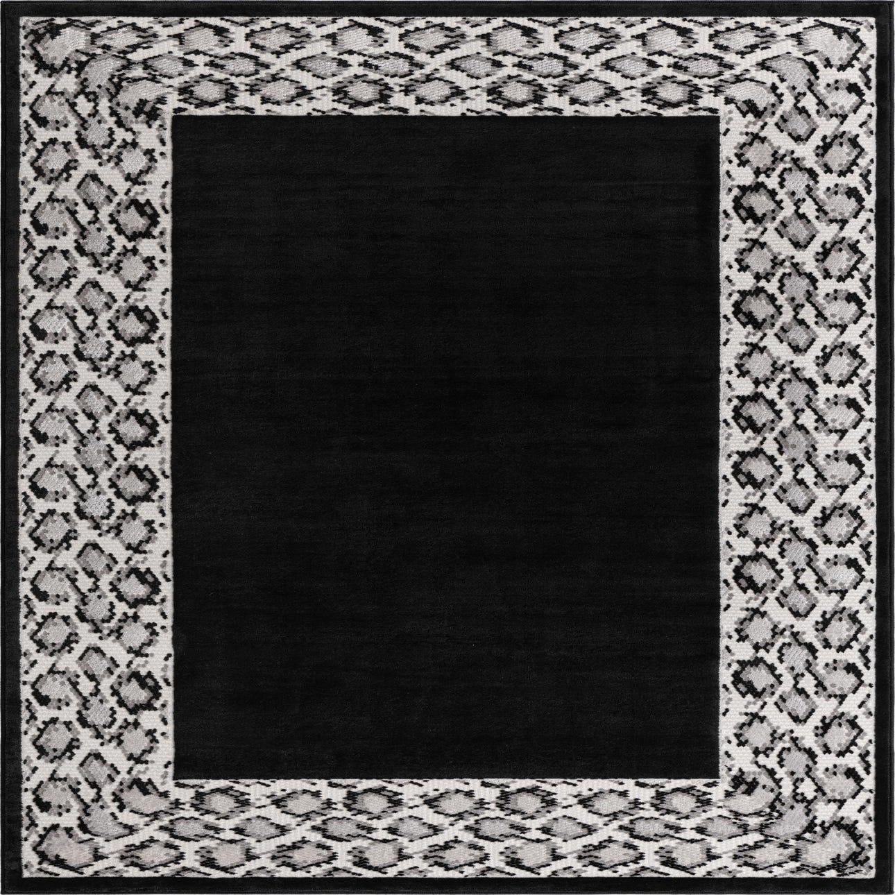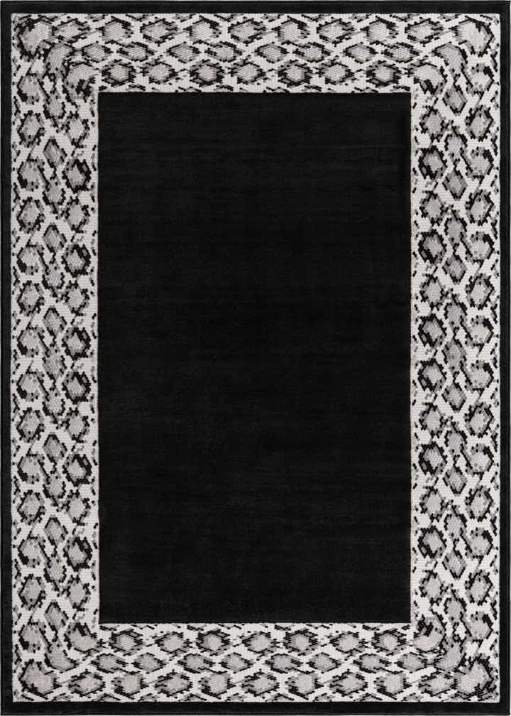 A rectangular black rug sample with a textured pile, featuring a bold gray and white snakeskin-like border pattern.