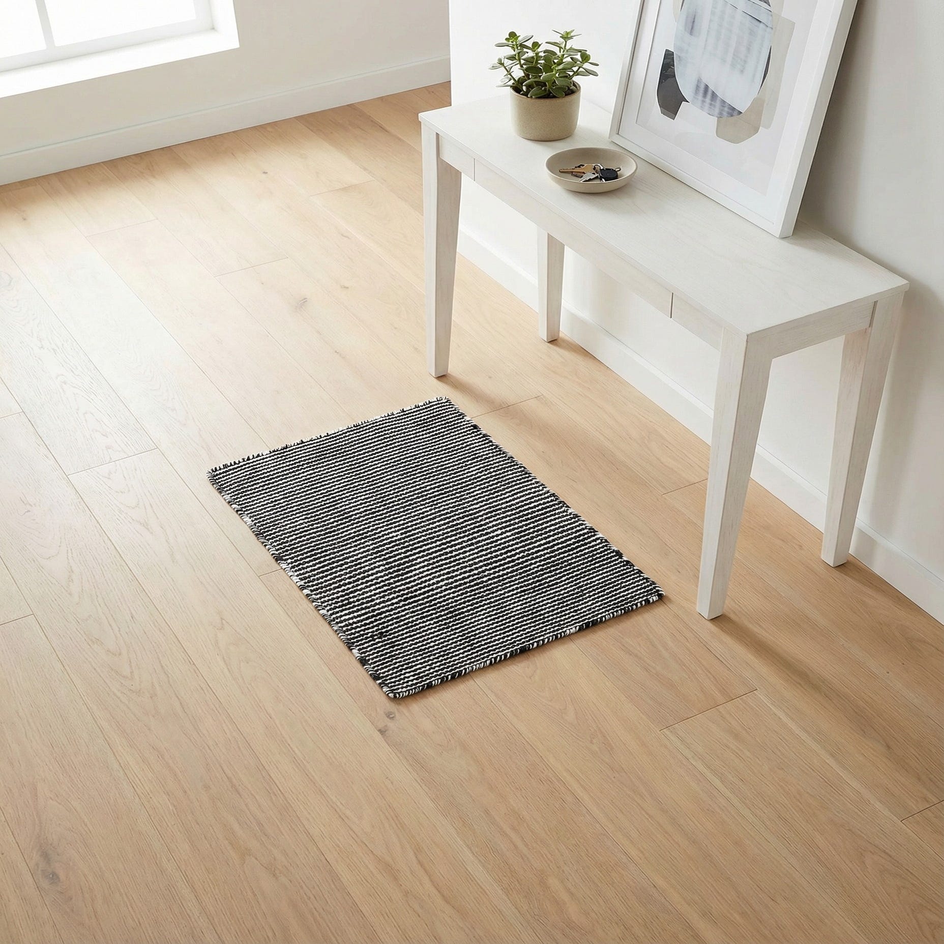 A tight, hand-woven flatweave in a deep Black Sky background is punctuated by narrow Ivory stripes that run across the field in a subtle, rhythmic pattern. The handmade construction gives the surface a low-profile, slightly nubby texture you can feel beneath your feet, and the short fringe on the ends adds a casual, crafted touch. Hand Made of 100% PET Polyester (Recycled Plastic Bottles), the weave lays flat and retains a clean, linear look while offering a tactile, approachable surface.