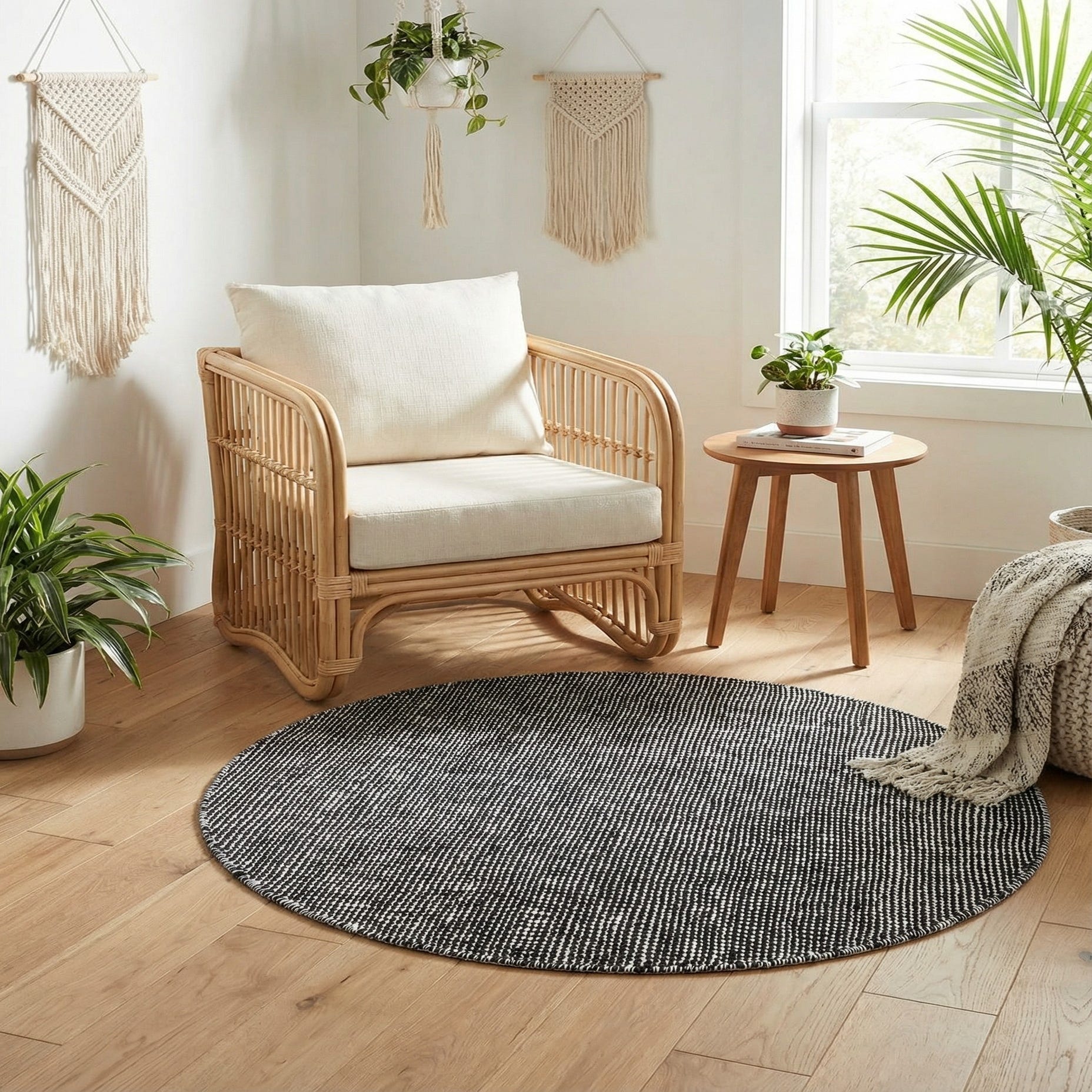 A tightly woven, small-scale linear pattern in Black Sky and Ivory gives this round outdoor rug a refined, graphic look. The Black Sky background provides depth while the Ivory threads create a subtle, peppered stripe that adds visual texture without overwhelming a space. Handmade construction produces a clean, low-profile flatweave with slight variations in the weave that lend character and a crafted feel.